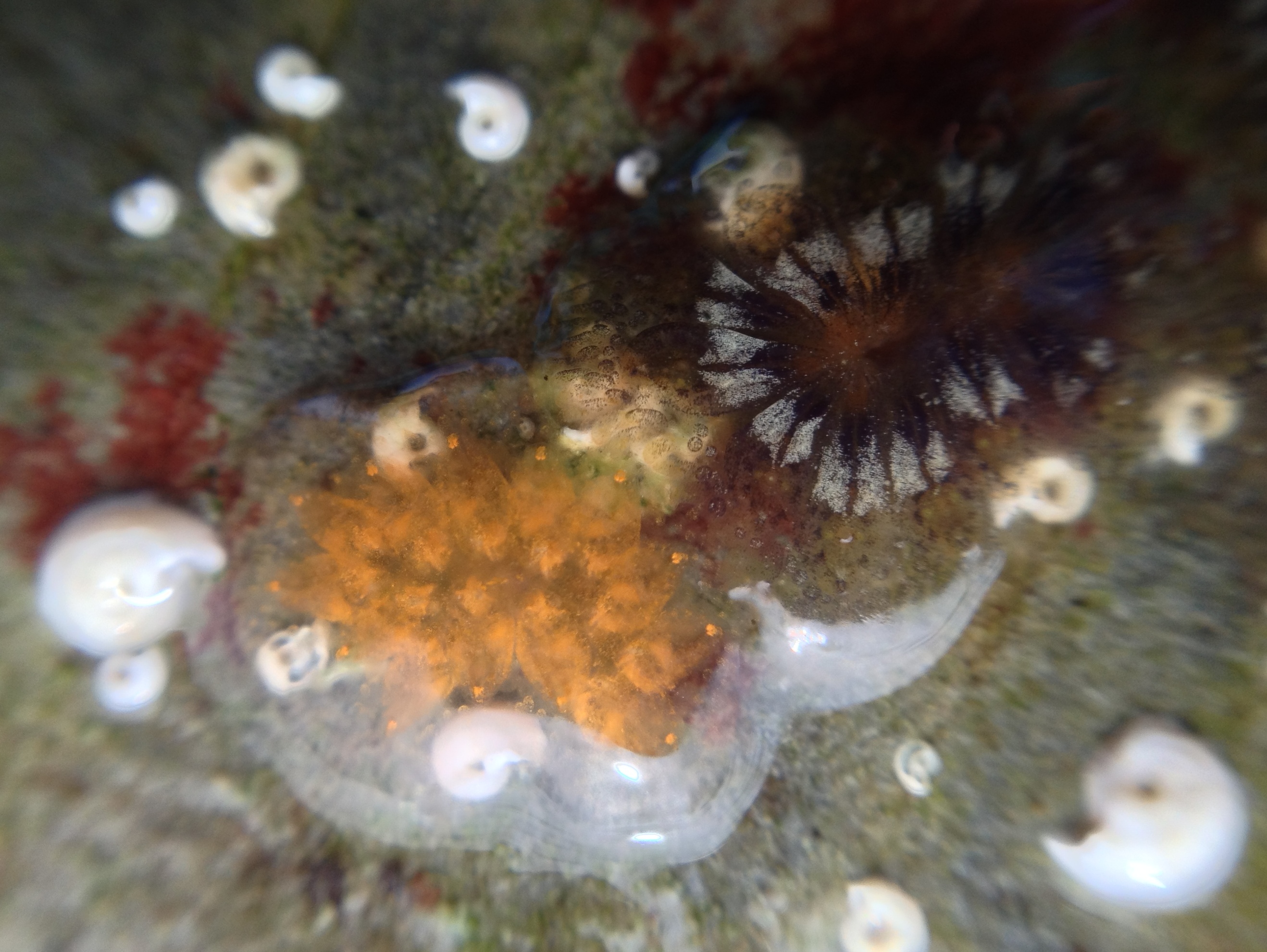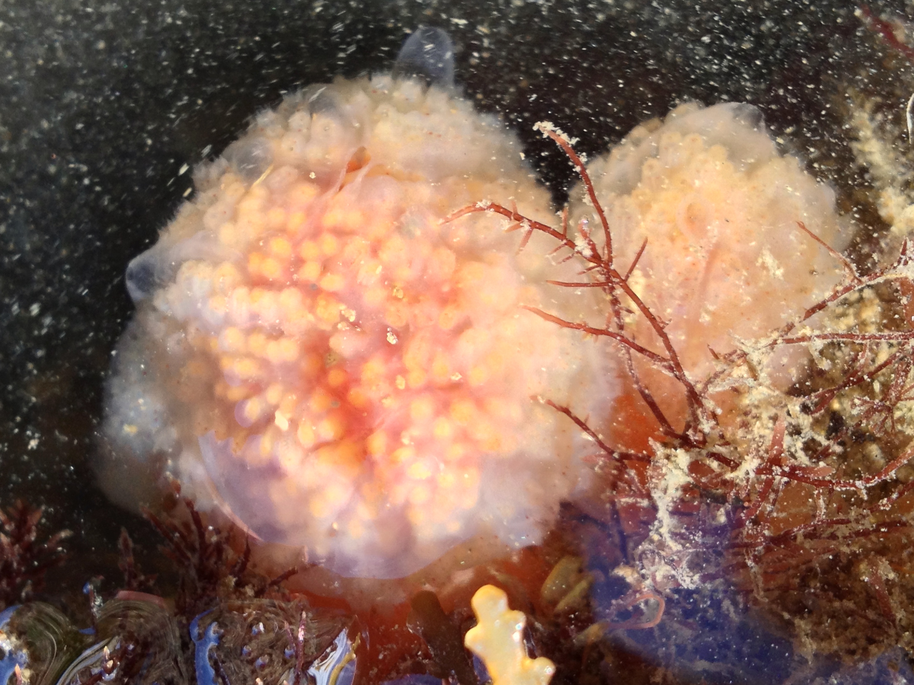 After being abroad a couple of times this summer (Slovenia, France 1 2 3 and The Netherlands), I have started rock pooling in Falmouth and Flushing again. Things have noticeably changed since the spring, most prominent being the recent abundance of all kinds of sea squirts (tunicates). They are everywhere, and some of them I have not seen before. The solitary sea squirt Corella eumyota is very common, with smaller individuals a translucent white and larger individuals more orange: