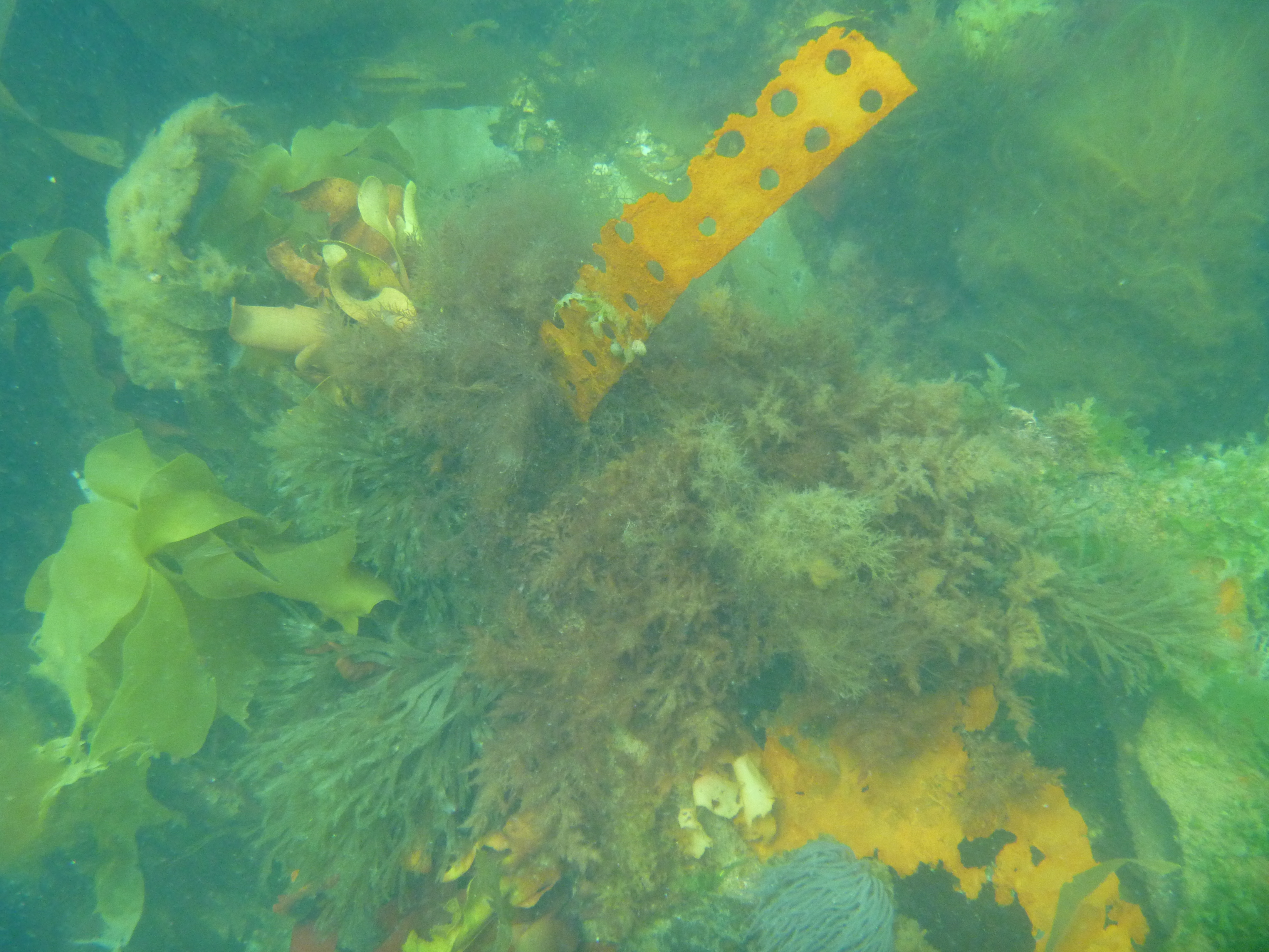 High time for a snorkel, and few better places in the area than ‘Silver Steps’, between Castle Beach and Pendennis Point in Falmouth. I took my little Lumix camera (goes up to 10 meters deep, no optical zoom) with me to take some sub-standard pics (all other photos on the blog are taken with my iPhone). This site is a mix of rocks covered in kelp and gravel and even the remains of two U-Boats (they are no longer recognisable as such though, see here for more specifics on these and other wrecks off Falmouth). There is always something to see: schools of Smelt chased by Sand eels, hovering Two-spotted gobies, Corkwing and Ballan wrasse, Spiny starfish and loads of seaweeds. In fact, there was so much to see that I have divided the pictures over two posts. First a photo of the site and some of the U-Boat wreckage:P1040041