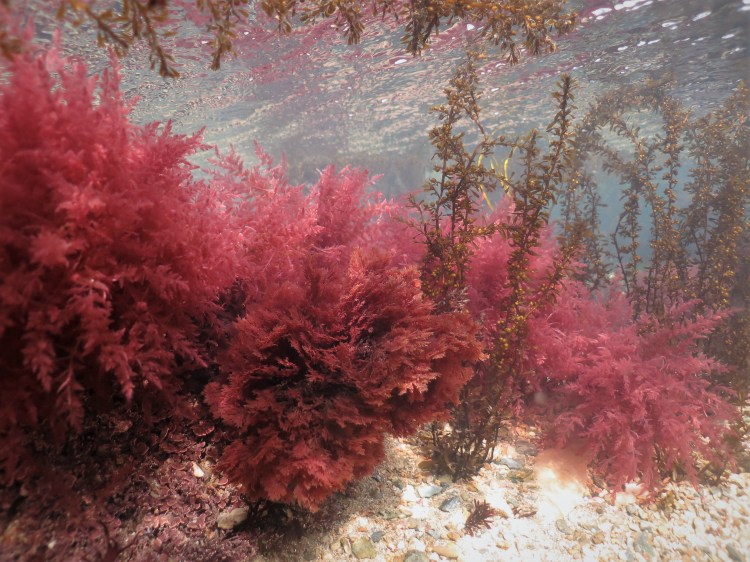 Time for some more seaweed photos. These were all taken during a snorkel when the sun was shining and the water was very clear, and as a result they are some of the best I’ve yet managed to take. Often it is overcast this time of year which means that the colours are not vivid and the water can be turbid too, so I was very lucky. Above a ‘bouquet’ consisting of many species, including Chondrus, Dictyota, Corallina, Ulva, Cystoseira, Mesophyllum, Asparagopsis, Calliblepharis, Himanthalia and (probably) Rhodophyllis.  I might look slightly ridiculous snorkelling in 50 centimeters of water but as long as I can look at this I don’t care! I really like the clarity of the next photo of Plocamium surrounded by Asparagopsis and Sargassum. The photo after shows the red Berry wart cress Sphaerococcus coronopifolius with some bright green Ulva, kelp and the brown red species False eyelash weed Calliblepharis jubata. More Berry wart cress in the photo after.In the first seaweed post of the year, I posted a photo of a tangle of species, mainly Hairy sand weed Cladostephus spongiosus, with Osmundea, Asparagopsis, Bonnemaisonia and Leathesia (here, third photo). Next, a photo of exactly the same tangle, which is now completely overgrown with the dark red Bonnemaisonia (an invasive species, just as the Sargassum and Asparagopsis also in the photo). I plan to take more photos over the months to track this succession. In the photo after that Bushy berry wrack Cystoseira baccata (still quite spindly after the winter) covered with a couple of red epiphytes and the brown Dictyota dichotoma. The last photo shows a beautiful red species covered in reproductive structures, I hope someone can tell me which species it is! Update: Spotted scarf weed Nitophyllum punctatum