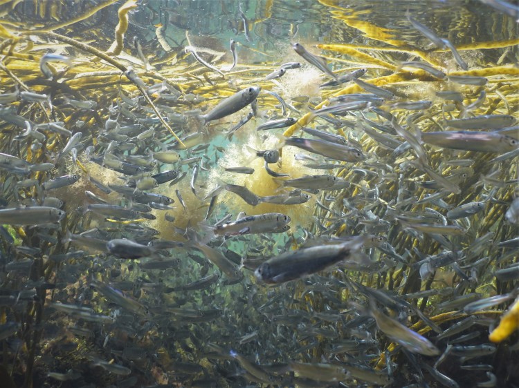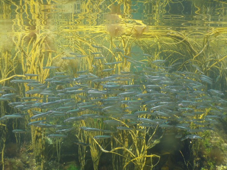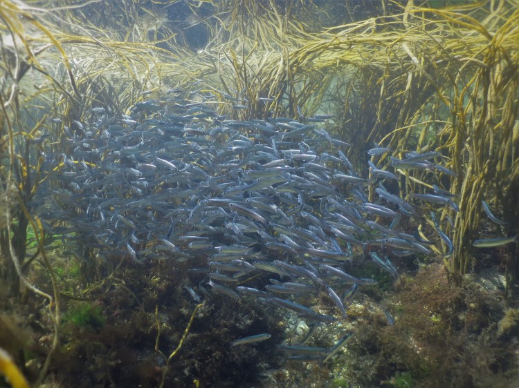 After seeing so many Sand smelt (Atherina presbyter) (EDIT or potentially Herring….very difficult to make out position of fins) schools from the local slip and quay in Flushing this week (see previous post), I went for a snorkel on Castle Beach in Falmouth over the weekend. Lots more were to be found! Below two clips. I have hardly shot any videos with my camera, and it unfortunately shows. Shaky camera movement and I forgot I had the option of shooting at a higher frame rate too, doh! I clearly need more practice. Each school consisted of fish of the same size (the smallest fish were around 3 cm and the largest maybe 9 cm), but when chased by a hapless snorkeller some merged temporarily. If you look closely, you can see about one in a hundred fish have a little bite taken out of them, I did not see any predators though.