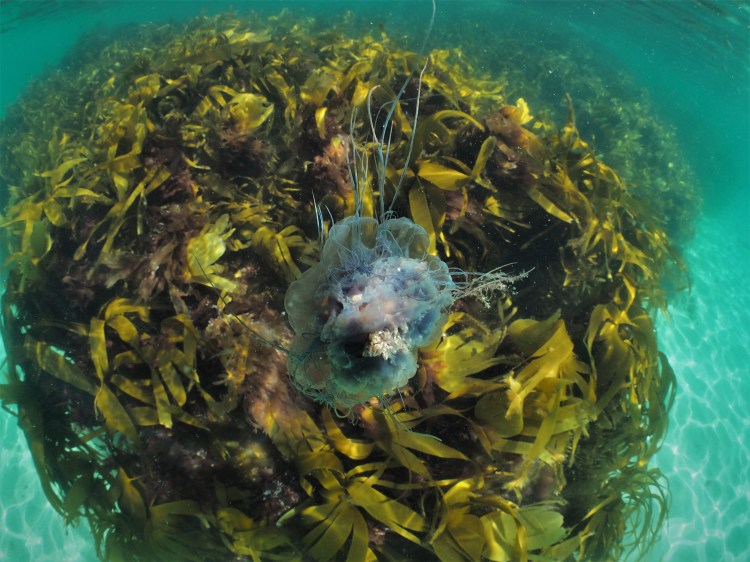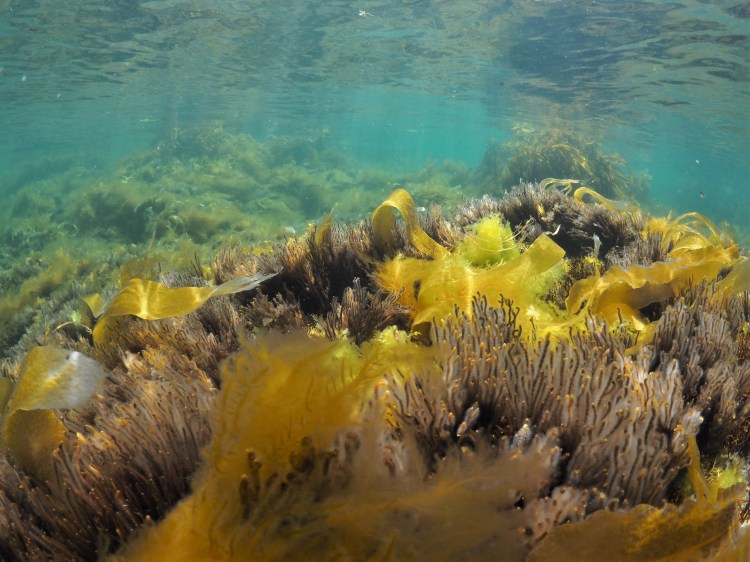 Rumours had it that the viz was great at the North Coast last weekend, and as it was pretty bad at the south Coast, I found some time to drive up to St. Agnes (buying new fins on the way) with the fisheye lens+dome. I was not disappointed: look at that blue sea! The water was clear, the sand was white and the seaweeds were waving on the rock faces. I saw flounder, mullet (thicklipped and red), seabass, sand eels, corkwing wrasse, sand smelt and most interestingly: weeverfish. Swimming above the sand with yellow fins and burying themselves so only the eyes are visible. I saw one half a meter deep on the beach, so it is advisable to wear surfshoes (see here). Unfortunately I could not get a good photo. I tried to take photos with the strobe but that did not really work so all photos here are natural light, trading off ISO, shutterspeed and depth of field to get the right exposure. There were Blue jellyfish around (small, 2-4 inches), and I tried to shoot them over-under but that was a bit too ambitious. Some easier shots instead. I hope to find some big Barrel jellyfish in the coming weeks, as they will be a lot easier to shoot! As the fish proved a bit too fast, and the over-unders a bit too difficult, I tried to take some shots of seaweeds instead. Although I mainly knew it from more sheltered locations, there was quite a bit of Mermaid’s tresses Chorda filum on this exposed coast. There was a lot of discoid forkweek Polyides rotundus on the sand but also on the rocks, and often covered in Falkenbergia. Other species that were abundant were Hairy sandweed Cladostephus spongiosus and Desmarestia ligulata. Hope to return soon!