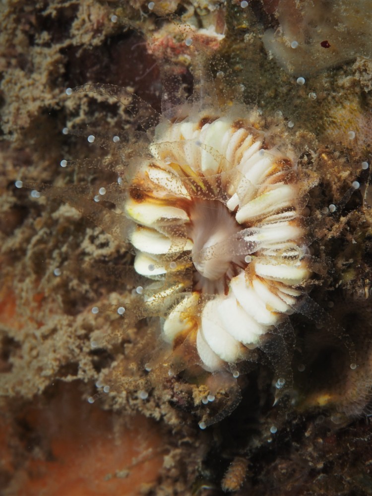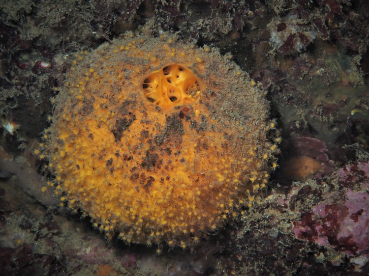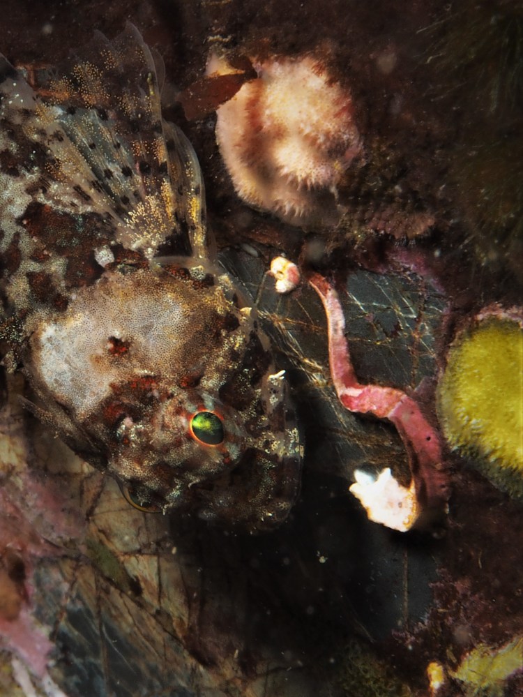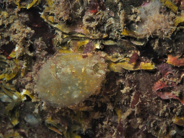 A solo dive early evening at the Silver Steps site. It was a couple of weeks I last went, and this time it was already dusk when I entered the water. My intention was to find cup corals and other small creatures growing on rock overhangs below the kelp line. The viz was good and sure enough I found what I was looking for: Devonshire cup coral Caryophyllia smithii, a solitary stony coral which is relatively common. They are very beautiful and the right size for the macro lens. I will definitely go after them again. Other finds were a golfball sponge Tethya aurantium, a baby Longspined seascorpion (this shot had potential, but it swam away unfortunately), a tunicate and a Painted topshell (very common). At the end of the dive unfortunately it was getting too dark to find objects or too properly focus; I need to sort out a dive light!