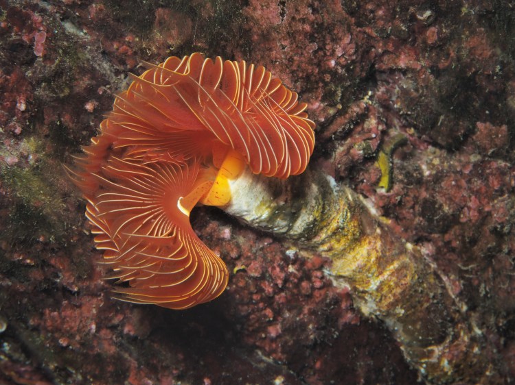 Some macro shots: again a Twin fan worm Bispira volutacornis and a new one for me, a big bright red Protula tubularia. It would be nice to get some abstract close-ups but these are excellent living motion-detectors so it is difficult. There are some amazing colours under the rock overhangs and I would like to try some more abstract photos such as this Spiny starfish or this Didemnun colonial seasquirt and other encrusting animals (and plants). No diving/snorkelling this weekend because of the wind, but glad I could put a couple of dives in these past weeks, and I will make an effort to go a lot more weather permitting!