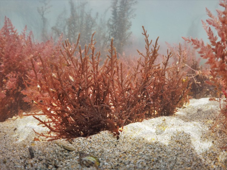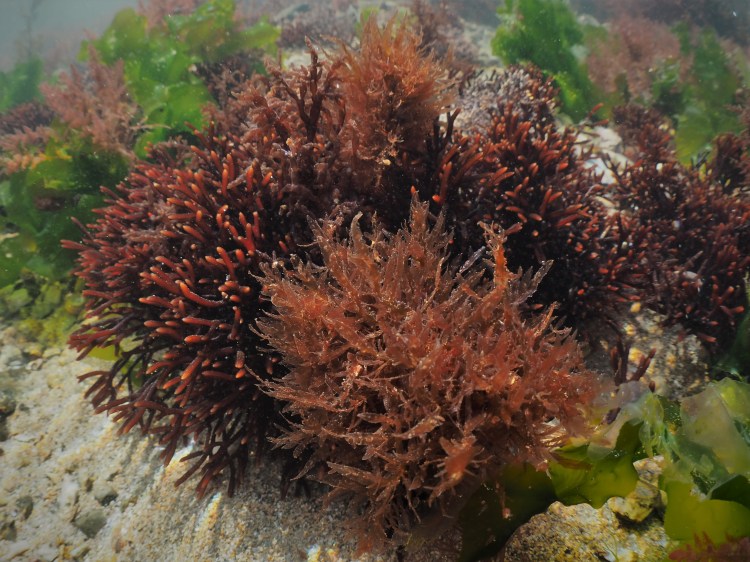 Below, Thong Weed Himanthalia elongata, Little Fat Sausage Weed Champia parvula and Juicy Whorl Weed Chylocladia verticillata and a bit of Bushy rainbow wrack Cystoseira tamariscifolia covered in red epiphytes.