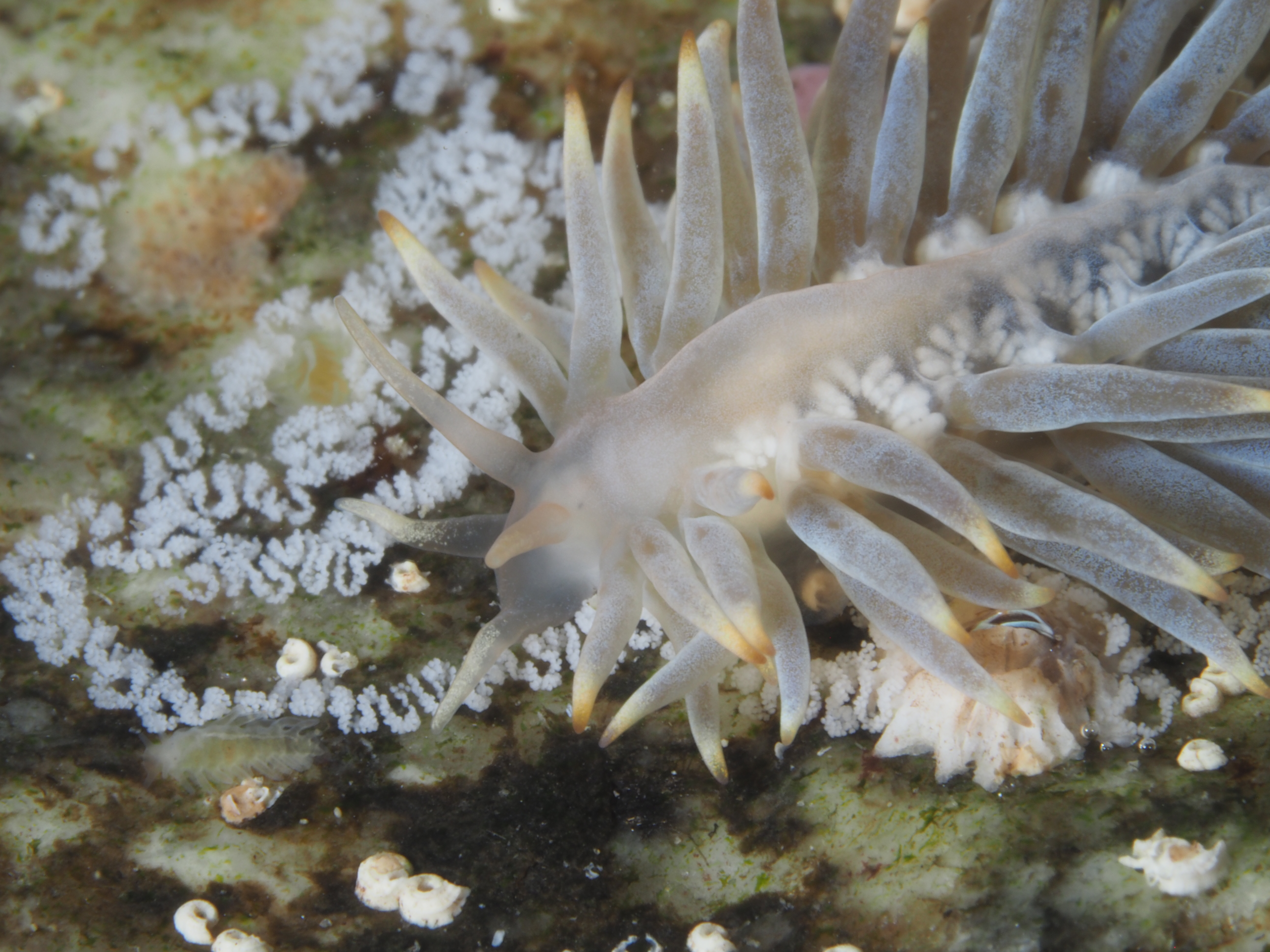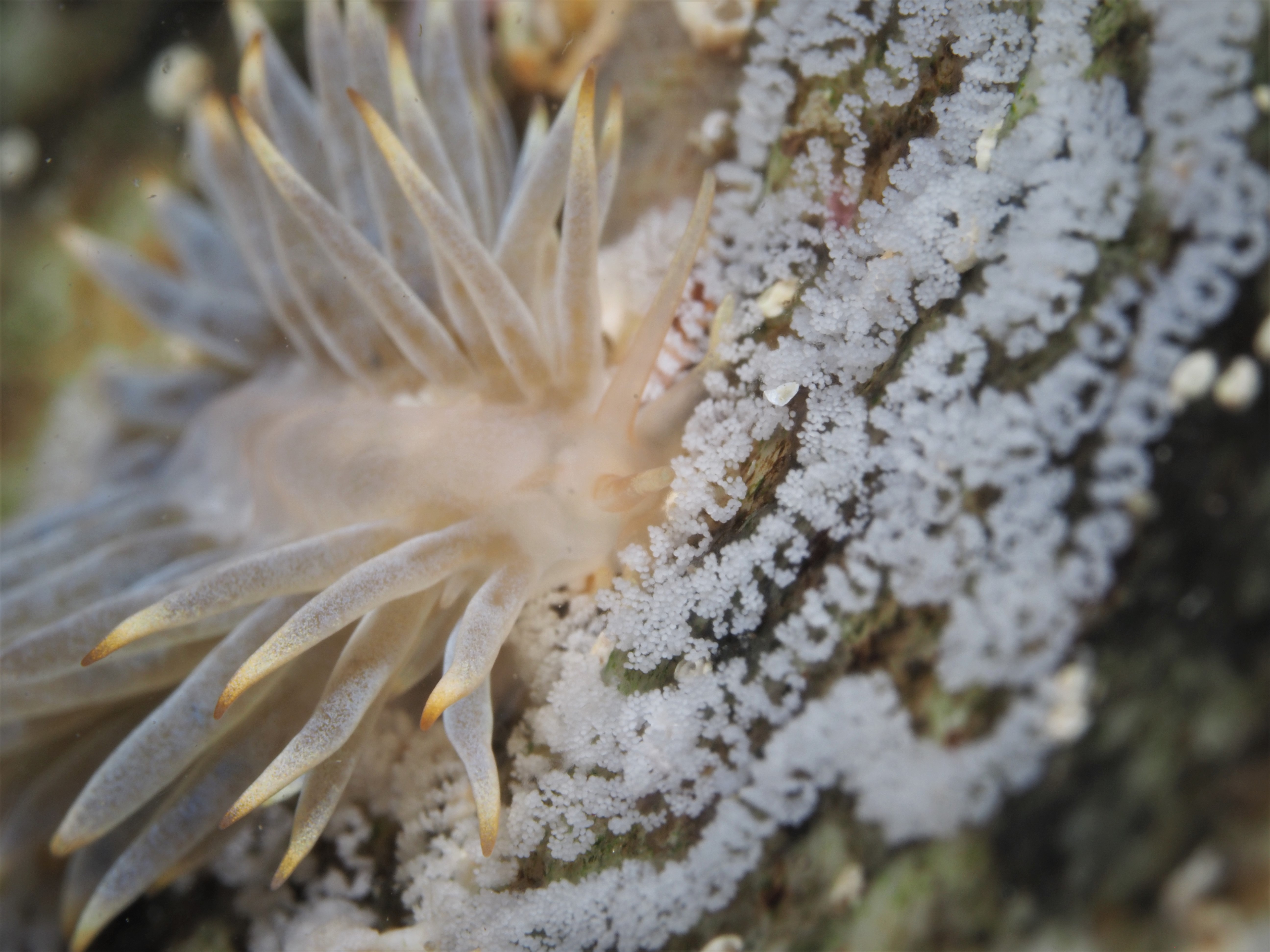 Two entries back I posted photos of the Goby egg-eating seaslug Calma gobioophaga. Last week I was lucky enough to spot its cousin, Calma glaucoides, who is a bit less fussy and eats different types of fish eggs, as well as cephalopod eggs. I found it by turning over a rock whilst snorkeling in a very shallow (<50 cm!) pool. Next to a depleted patch of clingfish eggs, it was circling around, busily depositing eggs of its own. A fantastic surprise, and I really need to get on with recording such findings.