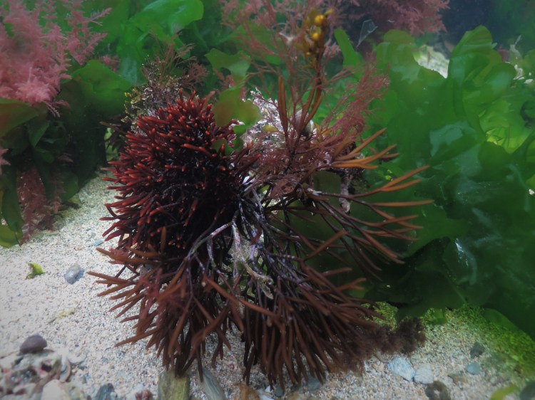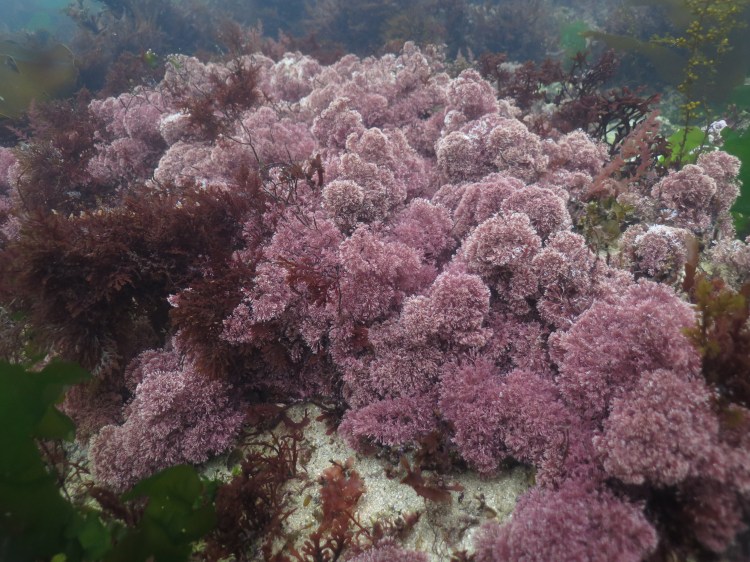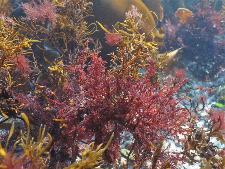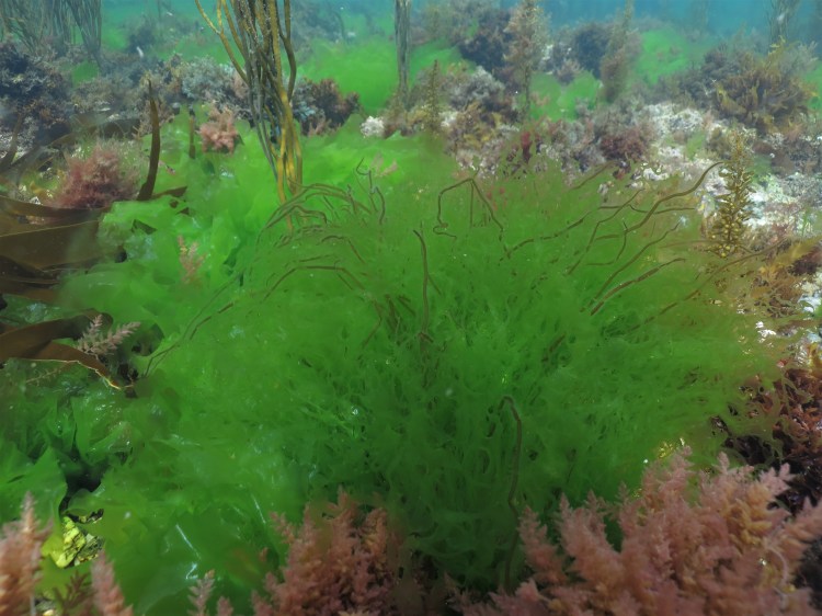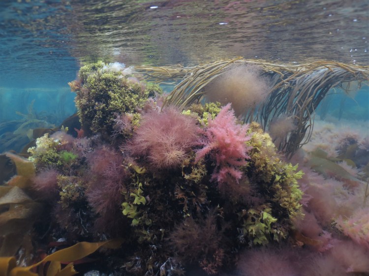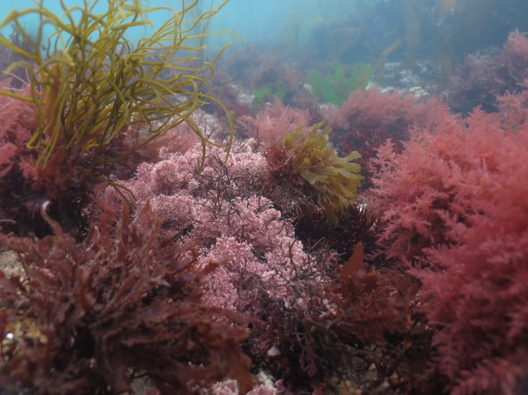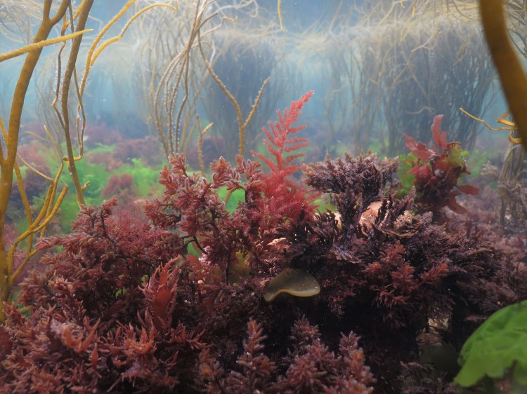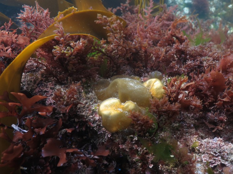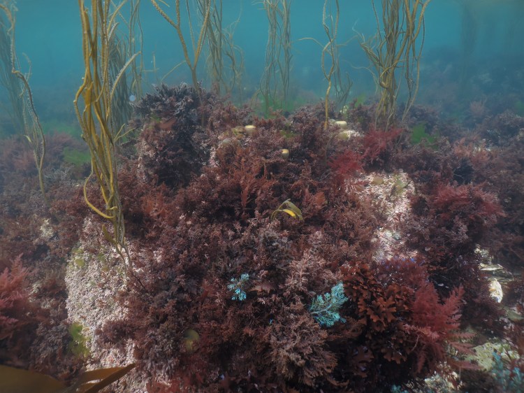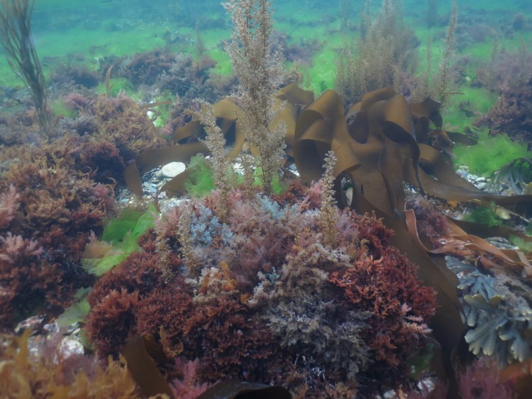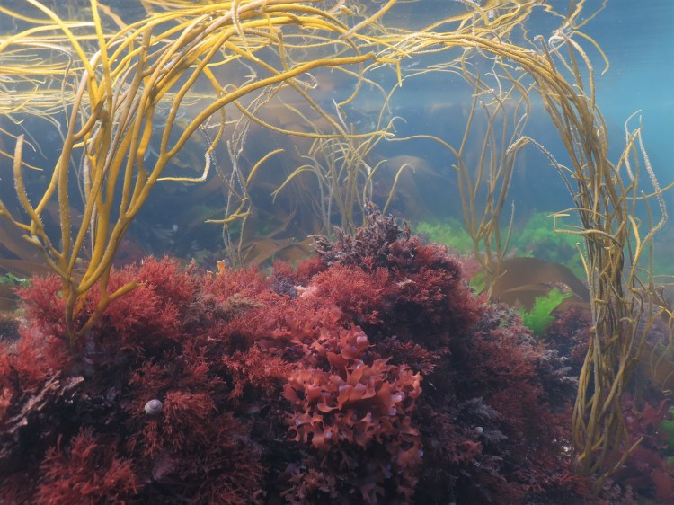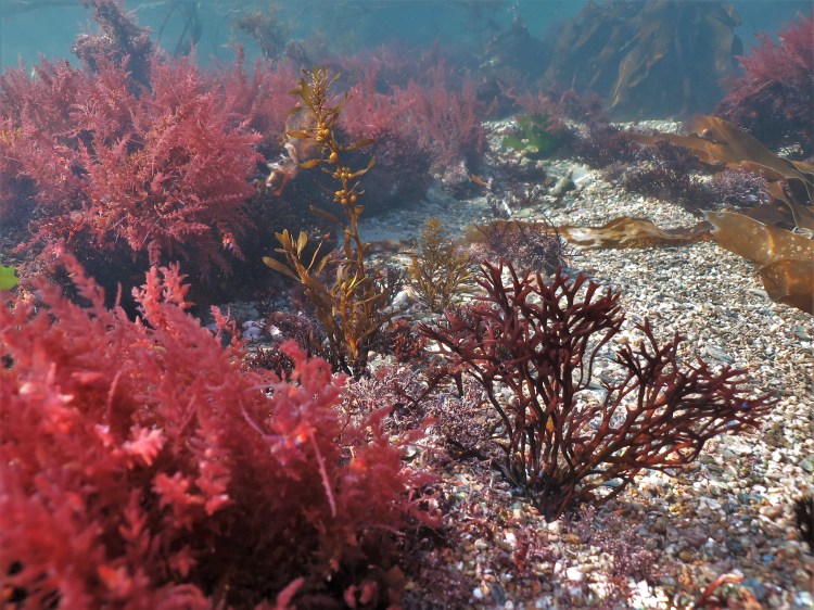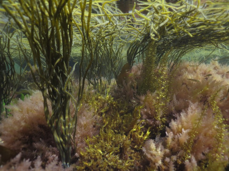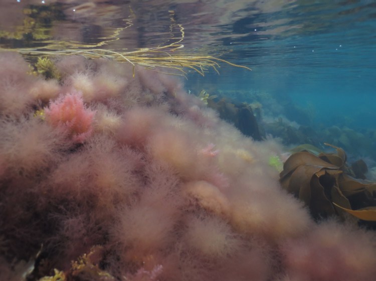 Last week I went for a little swim at the usual spot at Castle Beach. The viz was nowhere near as good as last month, but still OK. There are schools of sand eels and sand smelt and I even saw an eel. The contrast between growing brown seaweeds and withering red seaweeds has become even greater. Below you see some yellowed Harpoonweed and a ‘forest’ of Thong weed covered in epiphytes.