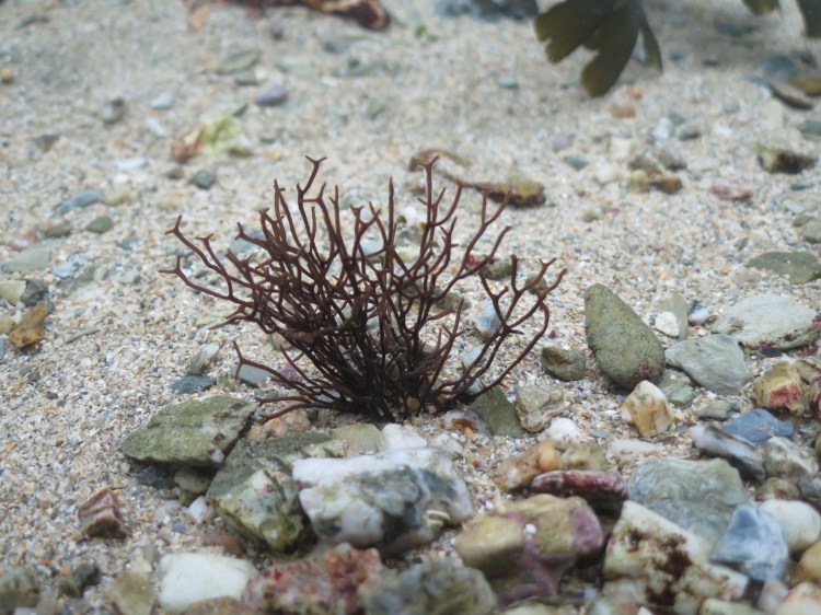 Next, photos of individual species. First some flat reds: Leafy rose weed Rhodophyllis divaricata, Beautiful fan weed Callophyllis laciniata, Branched hidden ribs Cryptopleura ramosa (probably), the invasive species Devil’s tongue weed Grateloupia turuturu and Under tongue weed Hypoglossum hypoglossoides. After that, two species that look a bit similar: left the reddish Discoid fork weed Polyides rotundus and right Clawed fork weed Furcellaria lumbricalis. The former is one of the most common species (also on the photo above it) but difficult to photograph as it usually sits on the white sand. After that, Juicy whorl weed Chylocladia verticillata. Last, two quite unassuming species: Black scour weed Ahnfeltia plicata and Sea flax weed Stypocaulon scoparium. Identifications made possible using the must-have Seasearch Guide to Seaweeds of Britain and Ireland, David Fenwick’s excellent aphotomarine website (and personal communication) and the good people of the Seaweeds of the NE Atlantic facebook group (any mistakes are my own).