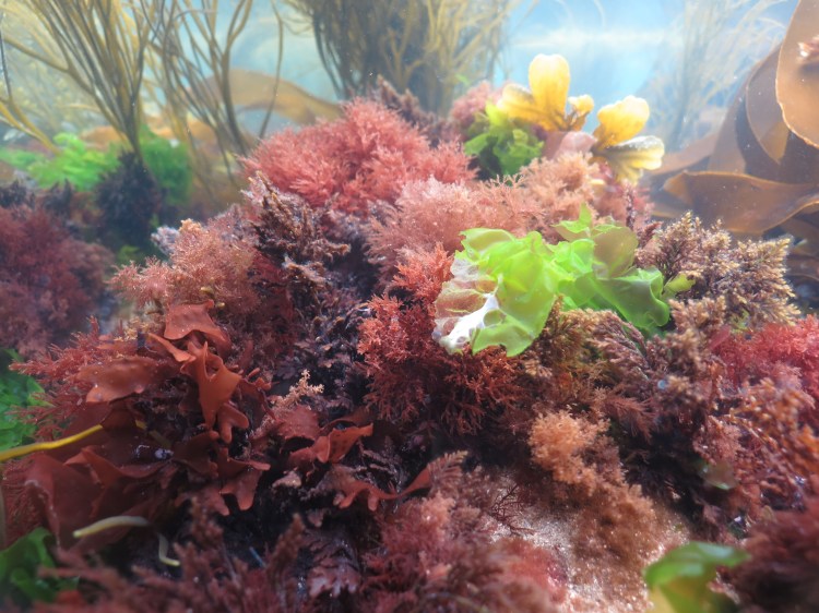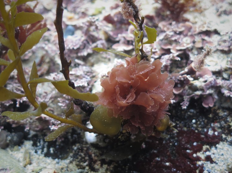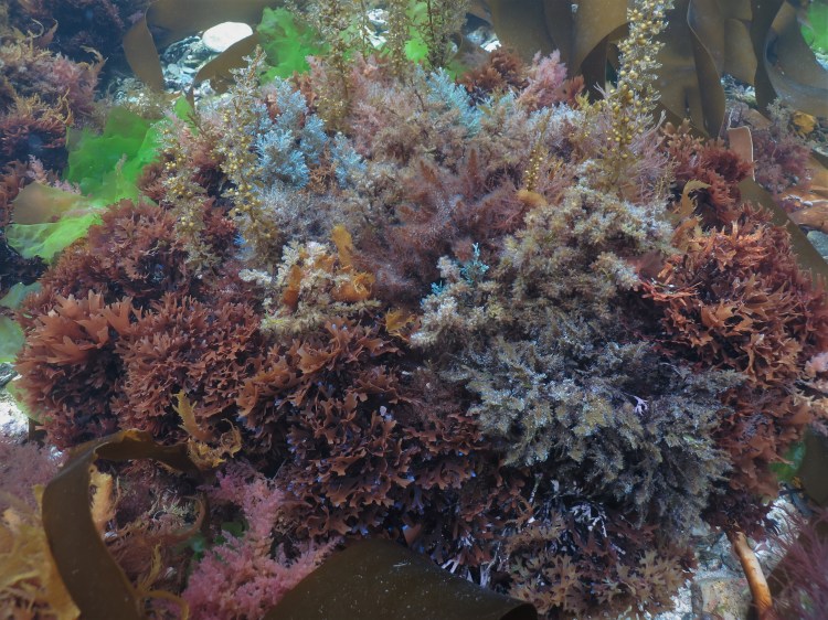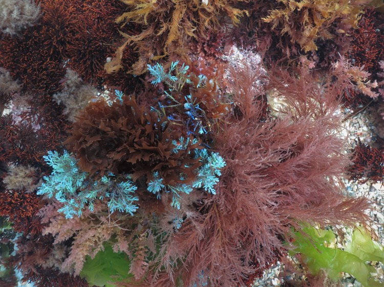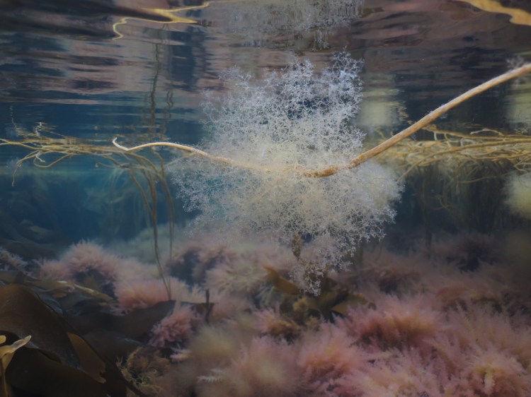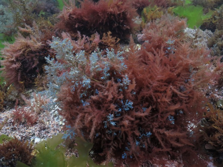 One time, when the tide came in, the water was super oxygenated, and all surfaces were covered with small silver bubbles which was beautiful (and annoying as the camera lens was also covered). The following photos show a very different looking Codium fragile, C. tamariscifolia overgrown with Sea beach Delesseria sanguinea and more Thong weed.