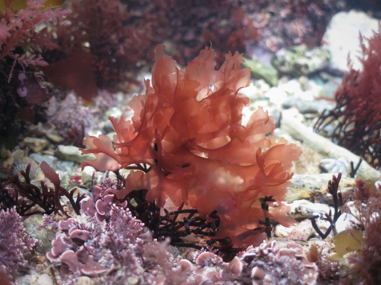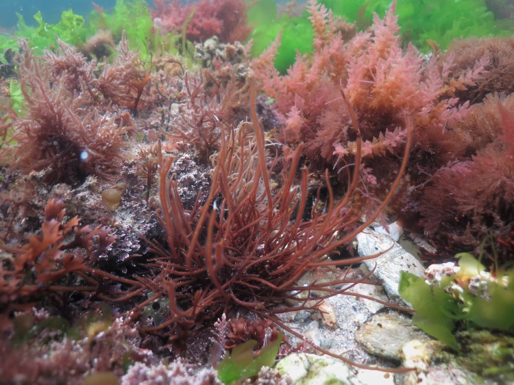 I have no clue what the brown, thin, frilly species is above. Below some individual species, first Dulse Palmaria palmata and Sea flax weed Stypocaulon scoparium. Not 100% sure about the next three: Dumontia, Lomentaria and either Laethisia or Colpomenia (I should know this…). Finally, some photos taken under the cover of Thongweed Himanthalia. More photos next week I hope!