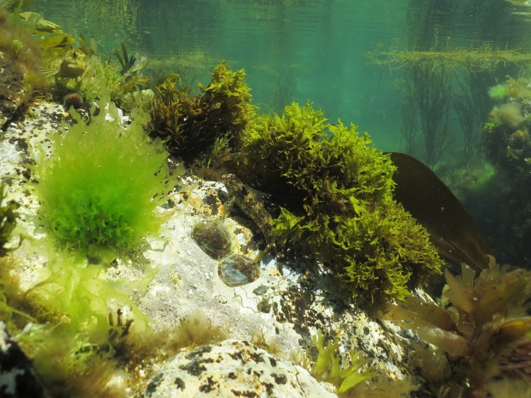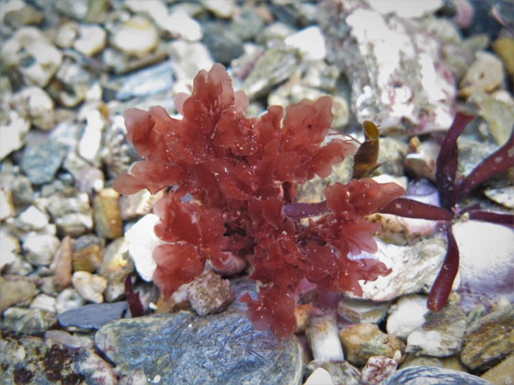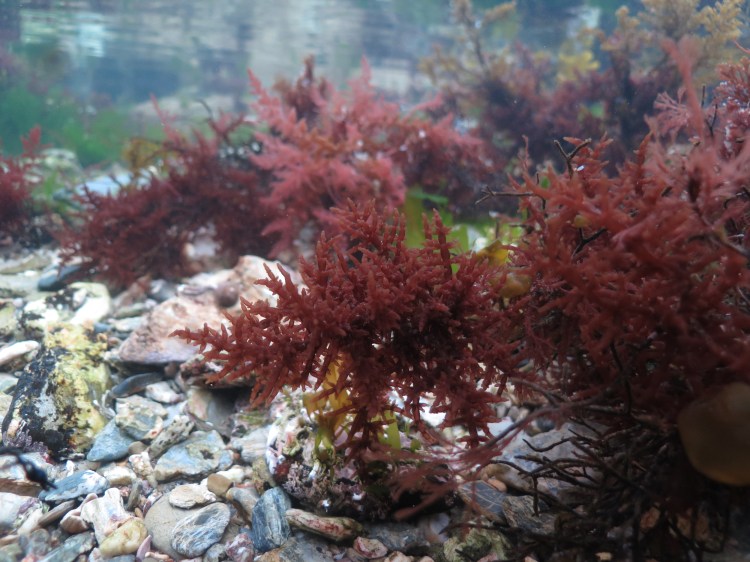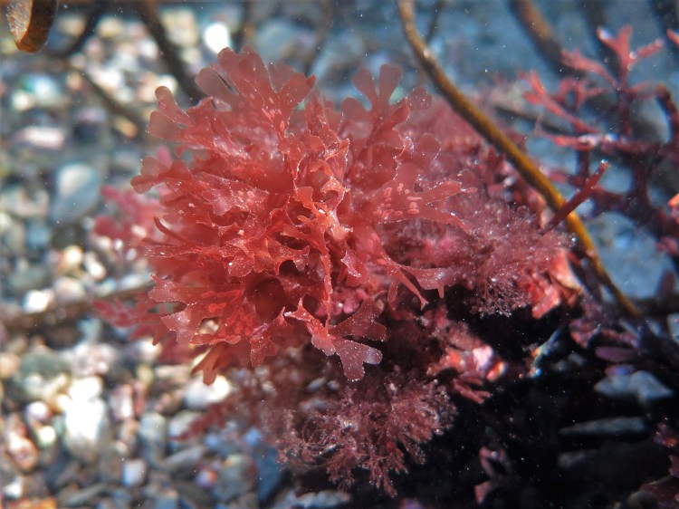 It is tricky photographing rock pool seaweeds. One main issue is to not disturb any sediment, especially as I keep it *very* shallow, sometimes lying on my stomach (I definitely do not need fins). The other main issue with using a (wide angle) wetlens is that there are three glass surfaces in front of the lens collecting bubbles and so need regular wiping. Light is also a challenge: photographing against the sun causes glare, but having the sun in your back results in casting shadows over your subject. I continuously fiddle with the exposure correction, but it remains difficult with the white sand and pebbles around the seaweeds. Below, some healthy looking Solier’s string weed Soliera chordalis, two photos of an ‘unknown’, Norwegian fan weed Gymnogrongus crenulatus, Under-tongue weed Hypoglossum hypoglossoides, seaweeds starting to grow on a pebble, and a rock covered in a variety of seaweeds.