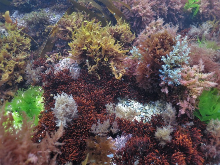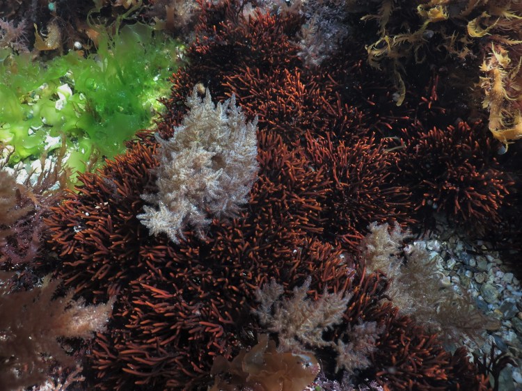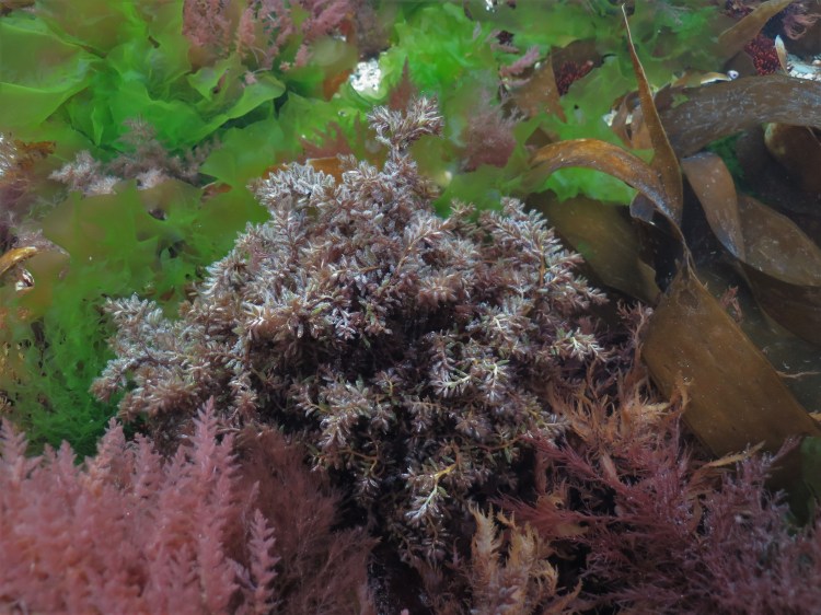 Some epiphytes are thriving, the very fuzzy brown Pylaiella littoralis covers kelp, a Ceramium species grows as pompoms on the Spaghettiweed. One pink and fuzzy species that is growing well I should have taken a closer look at because I am not sure what it is now (I will enquire at the Seaweeds of the NE Atlantic facebook group). The next species I think I can identify: Chipolataweed Scytosiphon lomentaria. The Bushy rainbow wrack Cystoseira tamariscifolia looks fuzzier and greyer than before. Although with less species and more subdued colours, the pools still look beautiful, and I hope the good visibility will last a bit longer!