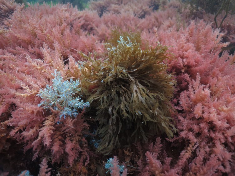 To my regret I did not manage to take a look at the seaweeds at Castle Beach in September (it was my aim to go in at least once every month). Last Friday however, the sun was shining, the wind was gone and the tide was low (and I was able to escape work) so I at least could make October. Not only was the viz excellent, to my surprise, the seaweeds looked very healthy. It seems that there is a second, autumn seaweed bloom that I was not aware of. Some of the bleached corraline algae have regained their pink colour, the Harpoon weed Asparagopsis armata increased in abundance and I saw species such as Red grape weed Gastroclonium ovatum growing again. The Bushy rainbow wrack has partly died back, forming dense, dark-brown mats (fourth photo) but also show fresh growth. This species is covered in many epiphytes such as Brown fan weed Dictyota dichotoma, and remnants of Bull huss mermaid’s purses still cling on. Interestingly, Wireweed Sargassum muticum has almost completely disappeared.