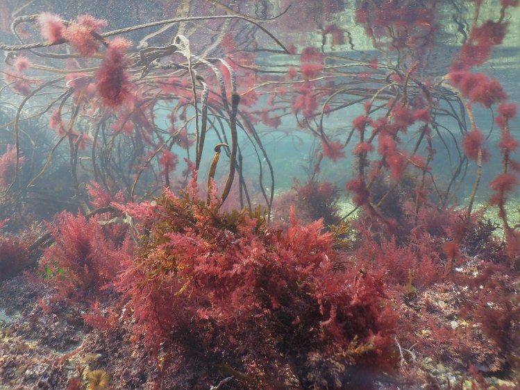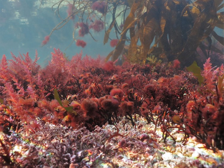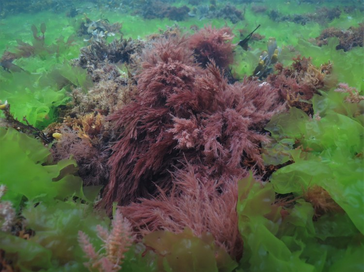 Above the spot where I have been snorkeling all year at Tunnel Beach, between Castle- and Gylly Beach, in Falmouth (Pendennis Castle can be seen in the background). The best time to snorkel is before low tide, as when the tide comes in the viz gets worse. I try to aim for 50-100 cm above the low tide mark which is really shallow. This area is not a real rock pool but rather a gravelly zone between the rock pools proper and the kelp forest which begins past the last row of rocks on the photo. Last week I went snorkelling three times but only last Thursday had decent viz. The photos below show the abundance of pink Harpoon weed Asparagopsis armata, green Sea lettuce Ulva lactuca and new growth of Thong weed Himanthalia elongata and older plants covered in red fuzzy epiphytes. The old wireweed Sargassum muticum plants have died off and the remnants are covered in many epiphytes such as Juicy whorl weed Chylocladia verticilata, Cock’s comb Plocamium cartilagineum and the pretty Iridescent fern weed Osmundea truncata. However, there is new growth everywhere as well so, like Himanthalia, this species seems to have a half-yearly lifecycle.