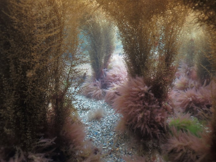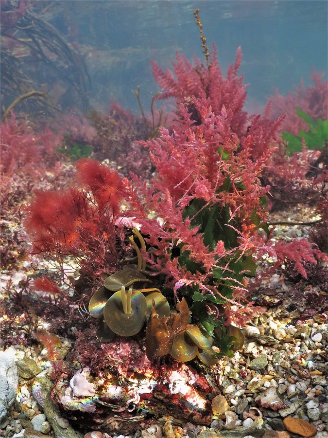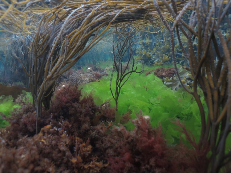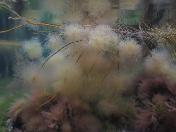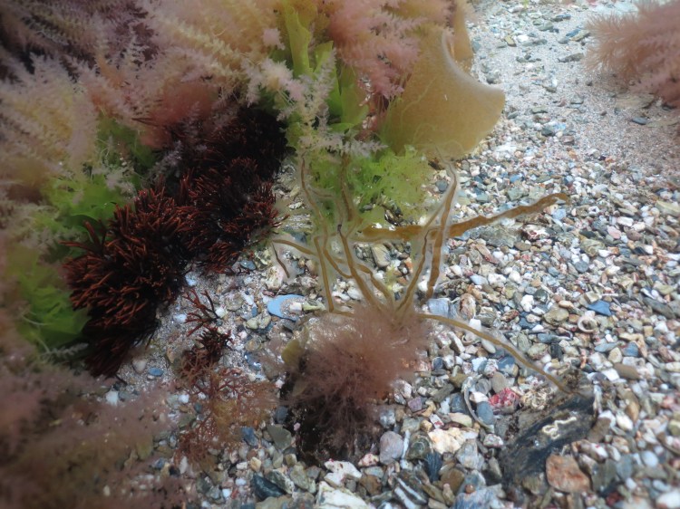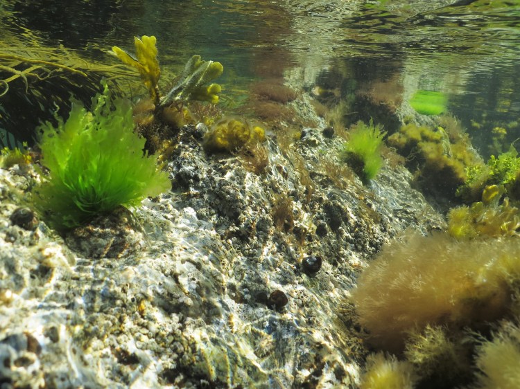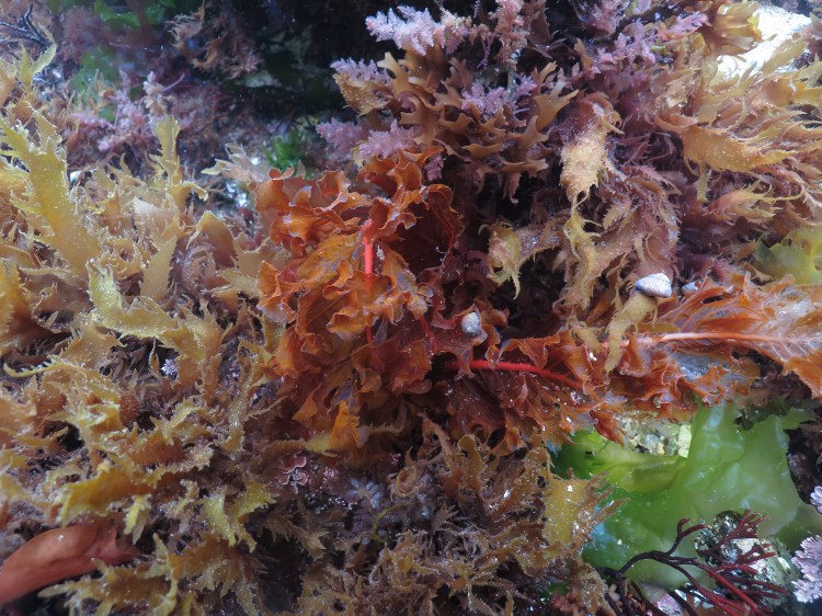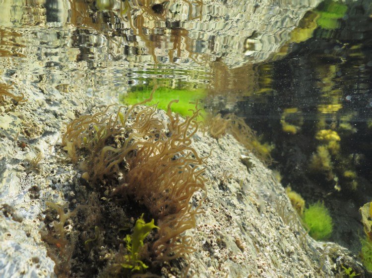 The Wireweed Sargassum muticum and Spaghetti (or Thong) weed Himanthalia elongata are thriving and at low tide hang over the surface creating ‘tunnels’. The Harpoonweed below is in decline, turning from pink to yellow-white (and the Bonnemaisonia is almost completely gone). The fronds of the False eyelash weed have turned from juicy and red-brown to wiry and yellow and the corraline algae are turning white. The Sea lettuce Ulva has died back and is covered in speckles (sporangia?).