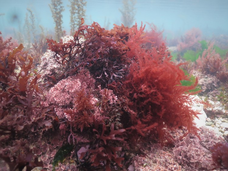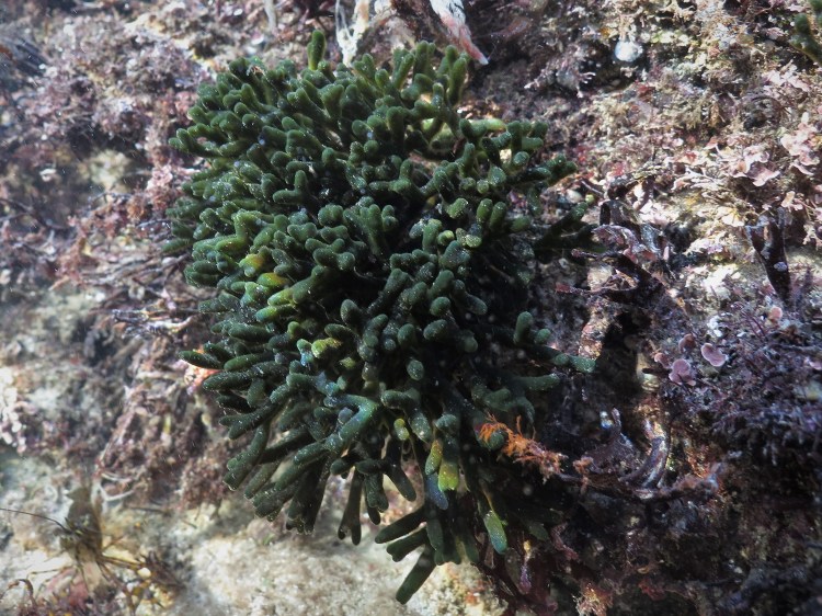 One time, when the tide came in, the water was super oxygenated, and all surfaces were covered with small silver bubbles which was beautiful (and annoying as the camera lens was also covered). The following photos show a very different looking Codium fragile, C. tamariscifolia overgrown with Sea beach Delesseria sanguinea and more Thong weed.