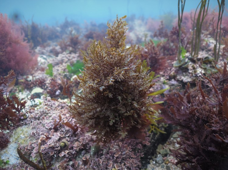 Some epiphytes are thriving, the very fuzzy brown Pylaiella littoralis covers kelp, a Ceramium species grows as pompoms on the Spaghettiweed. One pink and fuzzy species that is growing well I should have taken a closer look at because I am not sure what it is now (I will enquire at the Seaweeds of the NE Atlantic facebook group). The next species I think I can identify: Chipolataweed Scytosiphon lomentaria. The Bushy rainbow wrack Cystoseira tamariscifolia looks fuzzier and greyer than before. Although with less species and more subdued colours, the pools still look beautiful, and I hope the good visibility will last a bit longer!