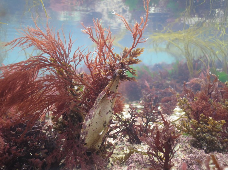 The Wireweed Sargassum muticum and Spaghetti (or Thong) weed Himanthalia elongata are thriving and at low tide hang over the surface creating ‘tunnels’. The Harpoonweed below is in decline, turning from pink to yellow-white (and the Bonnemaisonia is almost completely gone). The fronds of the False eyelash weed have turned from juicy and red-brown to wiry and yellow and the corraline algae are turning white. The Sea lettuce Ulva has died back and is covered in speckles (sporangia?).