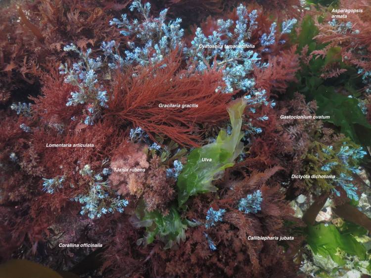 Below some species that still look healthy: Bushy rainbow wrack Cystoseira tamariscifolia, Hairy sand weed Cladostephus spongiosus, Chipolataweed Scytosiphon lomentaria (not 100% sure!), Polysiphonia and Codium.
