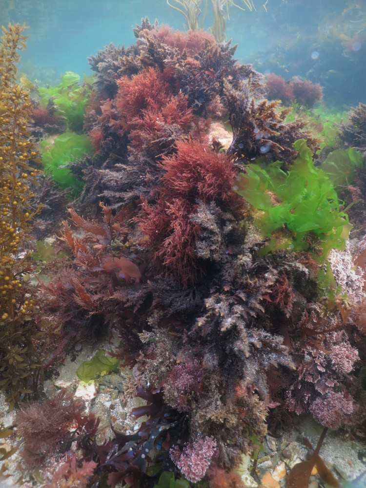To my regret I did not manage to take a look at the seaweeds at Castle Beach in September (it was my aim to go in at least once every month). Last Friday however, the sun was shining, the wind was gone and the tide was low (and I was able to escape work) so I at least could make October. Not only was the viz excellent, to my surprise, the seaweeds looked very healthy. It seems that there is a second, autumn seaweed bloom that I was not aware of. Some of the bleached corraline algae have regained their pink colour, the Harpoon weed Asparagopsis armata increased in abundance and I saw species such as Red grape weed Gastroclonium ovatum growing again. The Bushy rainbow wrack has partly died back, forming dense, dark-brown mats (fourth photo) but also show fresh growth. This species is covered in many epiphytes such as Brown fan weed Dictyota dichotoma, and remnants of Bull huss mermaid’s purses still cling on. Interestingly, Wireweed Sargassum muticum has almost completely disappeared.