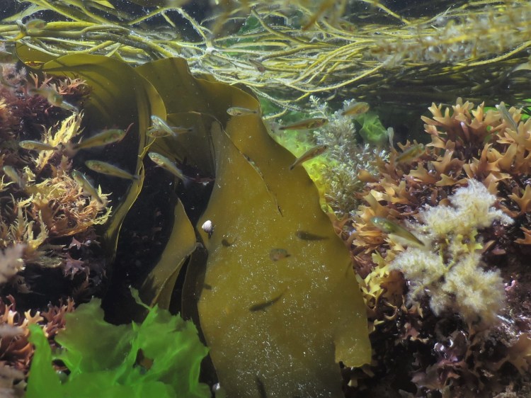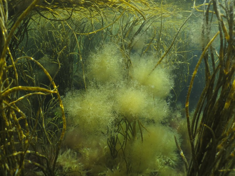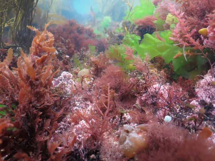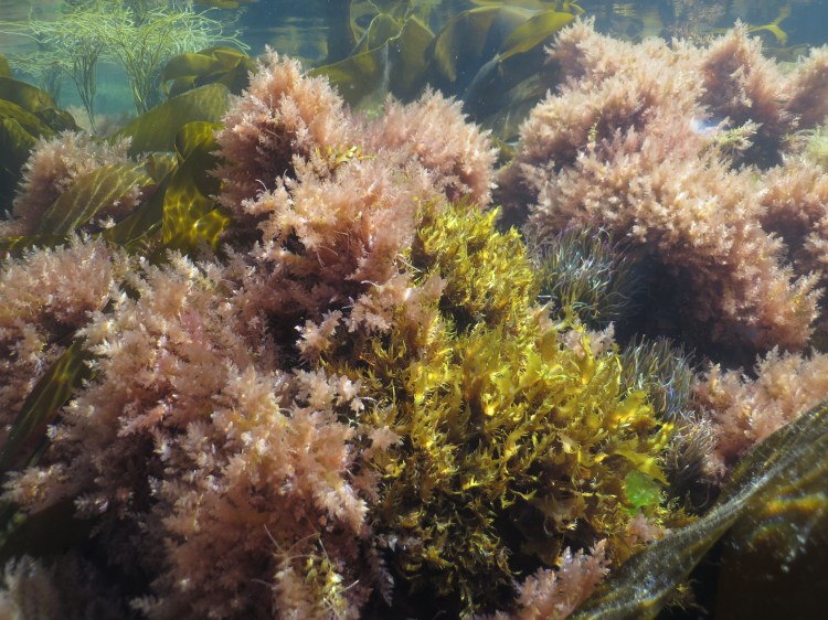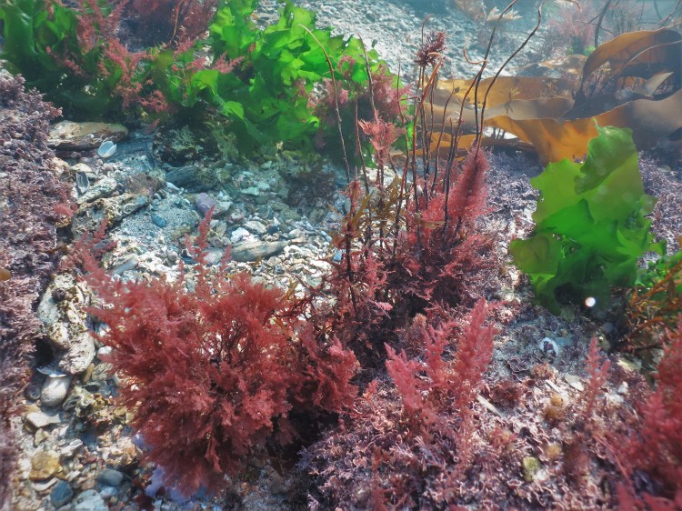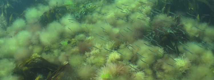 Last week I went for a little swim at the usual spot at Castle Beach. The viz was nowhere near as good as last month, but still OK. There are schools of sand eels and sand smelt and I even saw an eel. The contrast between growing brown seaweeds and withering red seaweeds has become even greater. Below you see some yellowed Harpoonweed and a ‘forest’ of Thong weed covered in epiphytes.