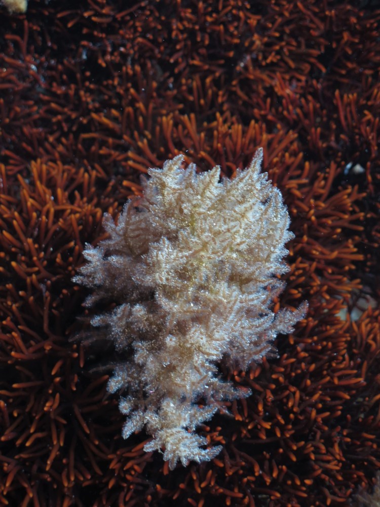 Next, photos of individual species. First some flat reds: Leafy rose weed Rhodophyllis divaricata, Beautiful fan weed Callophyllis laciniata, Branched hidden ribs Cryptopleura ramosa (probably), the invasive species Devil’s tongue weed Grateloupia turuturu and Under tongue weed Hypoglossum hypoglossoides. After that, two species that look a bit similar: left the reddish Discoid fork weed Polyides rotundus and right Clawed fork weed Furcellaria lumbricalis. The former is one of the most common species (also on the photo above it) but difficult to photograph as it usually sits on the white sand. After that, Juicy whorl weed Chylocladia verticillata. Last, two quite unassuming species: Black scour weed Ahnfeltia plicata and Sea flax weed Stypocaulon scoparium. Identifications made possible using the must-have Seasearch Guide to Seaweeds of Britain and Ireland, David Fenwick’s excellent aphotomarine website (and personal communication) and the good people of the Seaweeds of the NE Atlantic facebook group (any mistakes are my own).