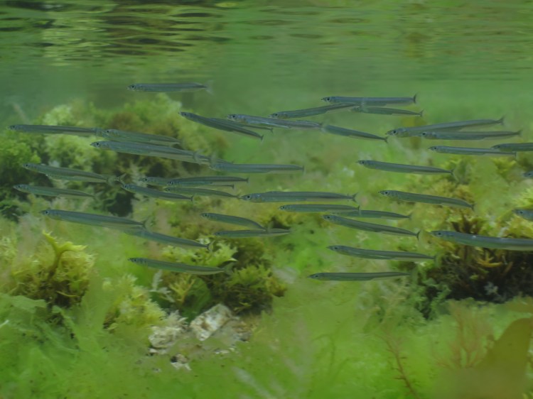 I have been diving three times last week but due to internet problems have not posted about them. I hope to do that in the coming days, but first wanted to blog about this mornings snorkel session in the shallow rock pools at Castle Beach in Falmouth, as I experienced the best viz (visibility) ever here. Apart from the stunning viz, I was very lucky with the fish: I spotted a Tompot blenny, Two-spot Gobies, Fifteen-spined stickleback, Rock goby, Pollack, Ballan-, Corkwing- and Goldsinny Wrasse and Sand eels (above and below). However, I mainly wanted to check what the seaweeds looked like, and things have definitely changed over the last month (see here).