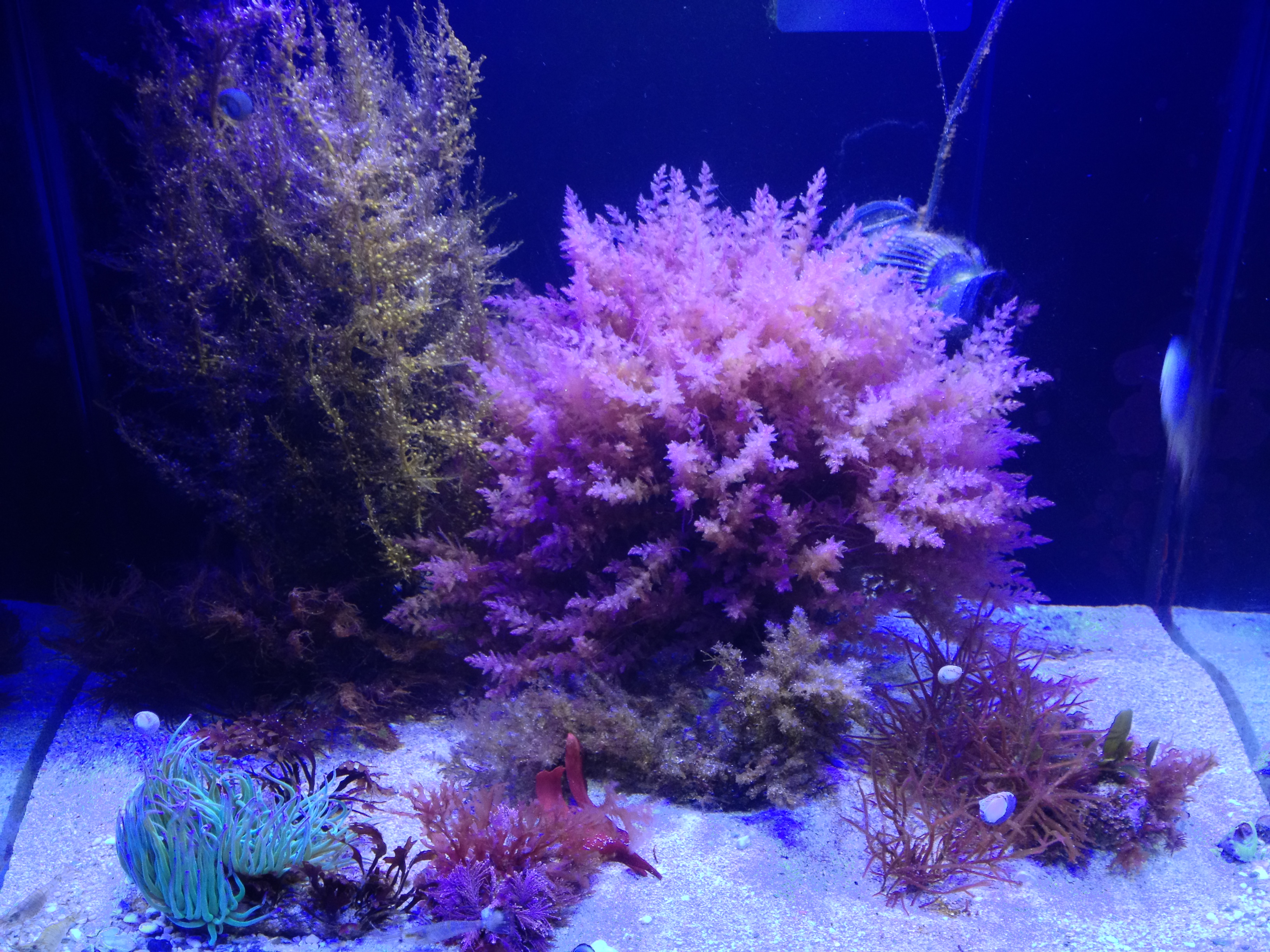 It was high time to get some rocks in the aquarium; always a bit difficult to do this aesthetically I find. Perhaps I should add some more but for now there are at least surfaces to hide under or attach to. I removed all seaweeds except for the fast growing Chrysymenia wrightii (I have had to prune parts of it already so it might act as a good nutrient sink). It is bright red and there are very few algae on it now I’ve placed it downstream of the Tunze pump. I will not add anymore seaweeds but instead wait for them to naturally settle and grow from the rocks. Tired of die-offs and algae problems!