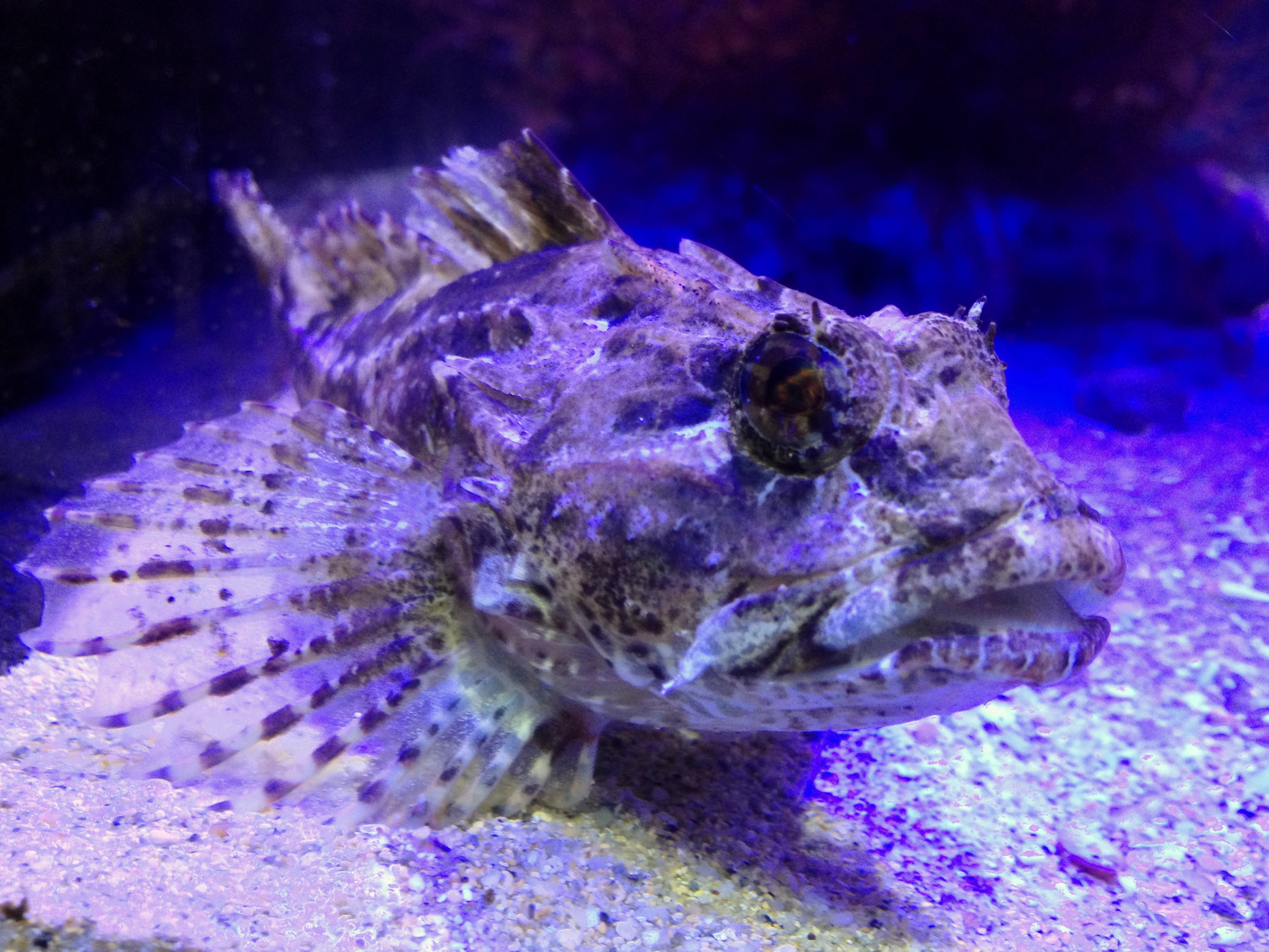 Hmmmm. After a promising start, disappointment has set in: algae spreading and seaweeds withering. To top it off: the Corkwing wrasse went missing; no dead fish to see but a noticeably larger Snakelocks anemone….After it managed to catch some prawns as well, it decided to split into two. I did managed to find a live Turban (or great) top shell Gibbula magus though and it seems happy (I do not have a good picture of it so see here.) I did some more fishing of the quay with my net and caught many small Corkwings and some Sea sticklebacks as well as a Long-spined bullrout (or Sea scorpion) Taurulus bubalis (see also here). The plan was to only keep them for a couple of days to then bring them to a local outreach event (see here for last years edition). I should have known better: the Sea scorpion ate about six fish overnight and so I quickly released the remaining prey fish….