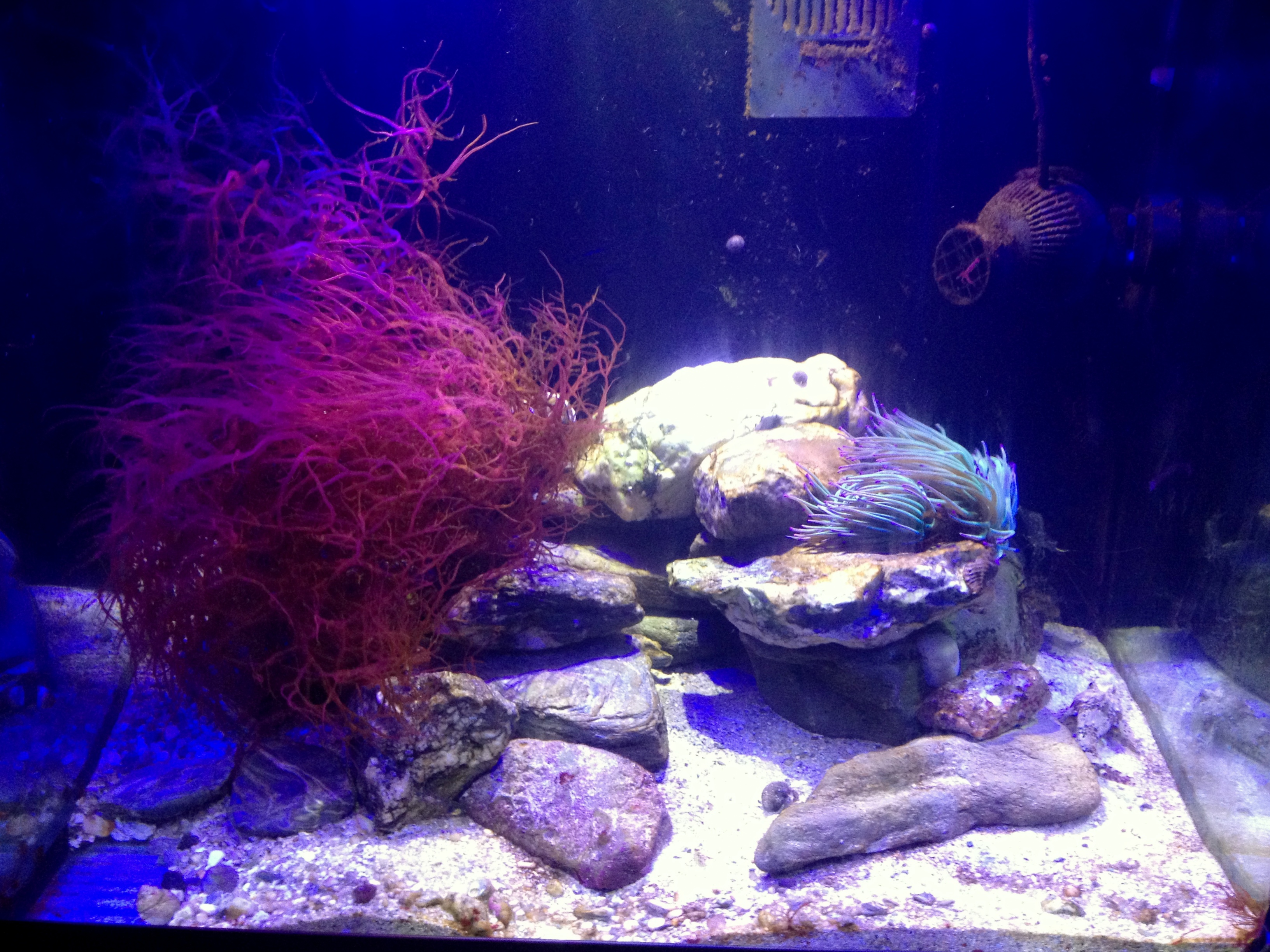 The large mop of Harpoon weed has been added to the tank (tied to a large pebble). I also added Grey topshells Gibbula cineraria, several hermit crabs, two Sting winkles Ocenebra erinacea and five shrimp. Although being potentially dangerous to fish, I could not resist putting in a green snakelocks anemone and it looks stunning under the blueish light . It is quite hard to take good pictures as the blue comes out too strong (using a camera and adjusting the white balance does not really work either, as the photos turn too reddish).