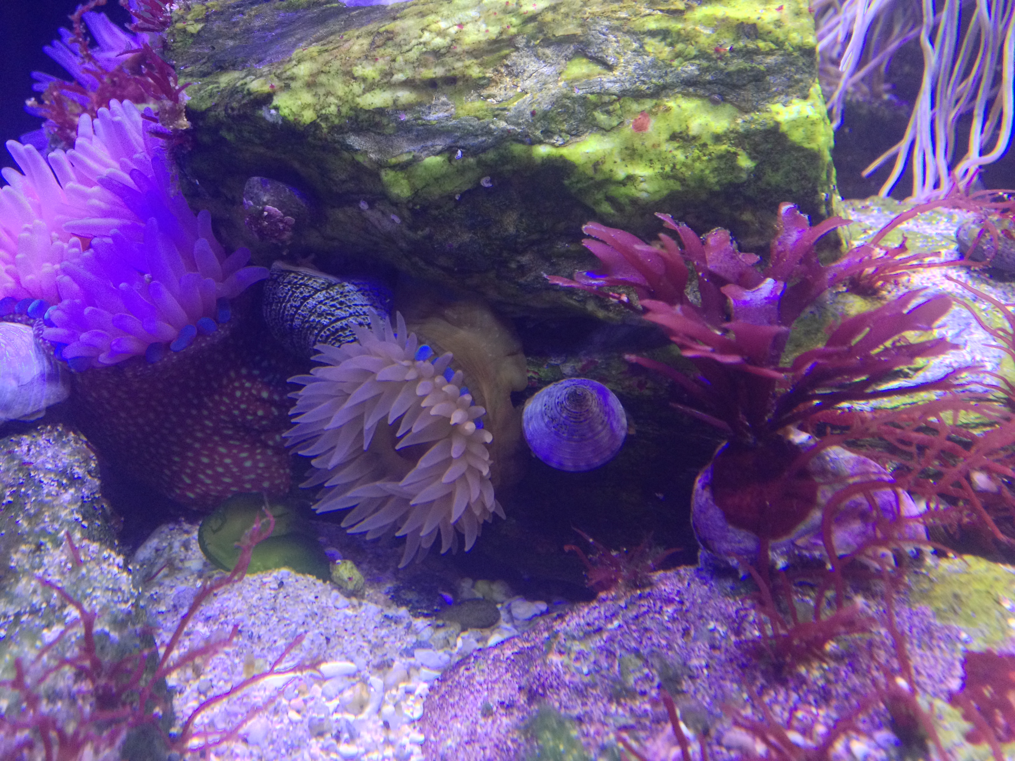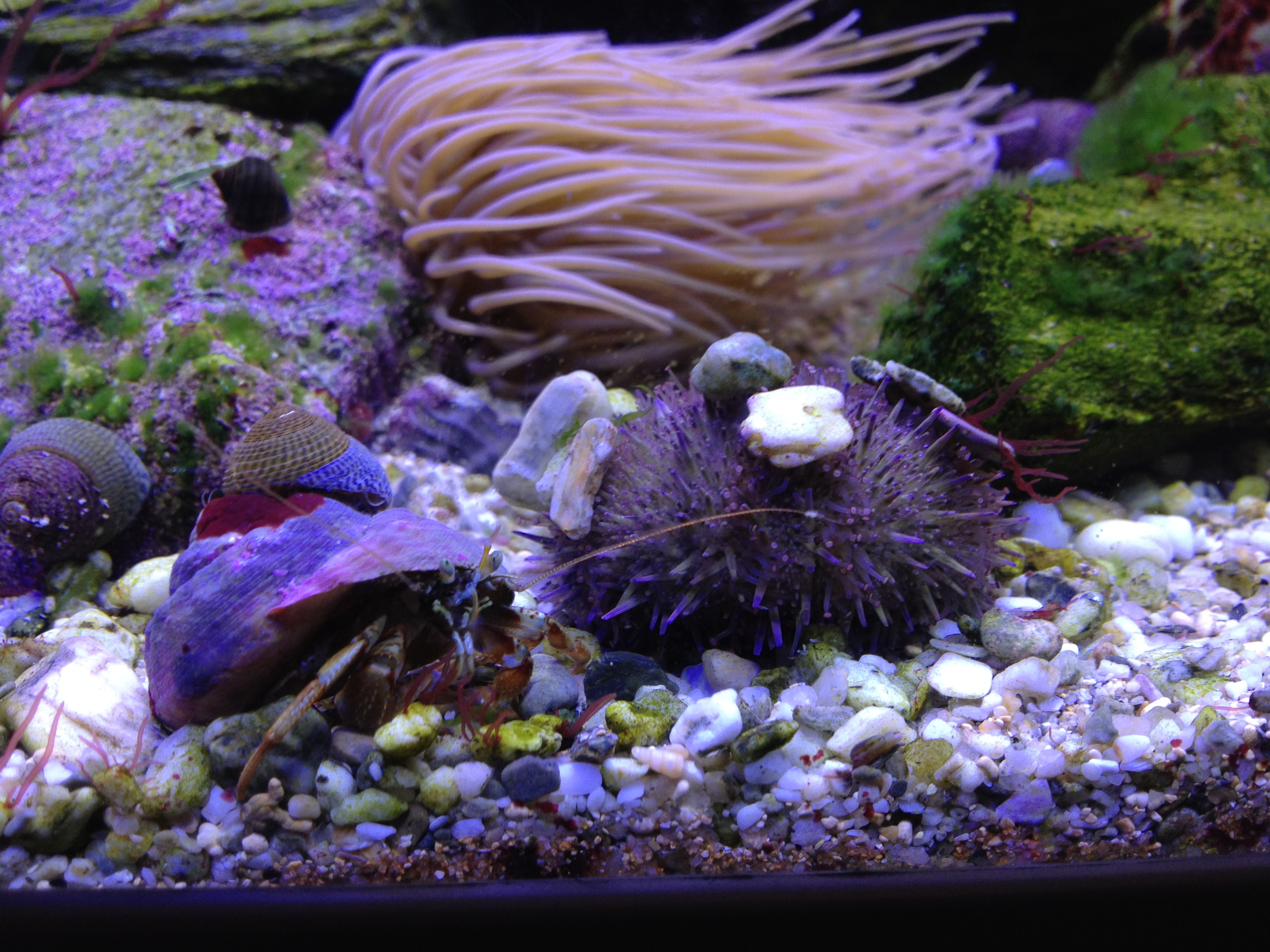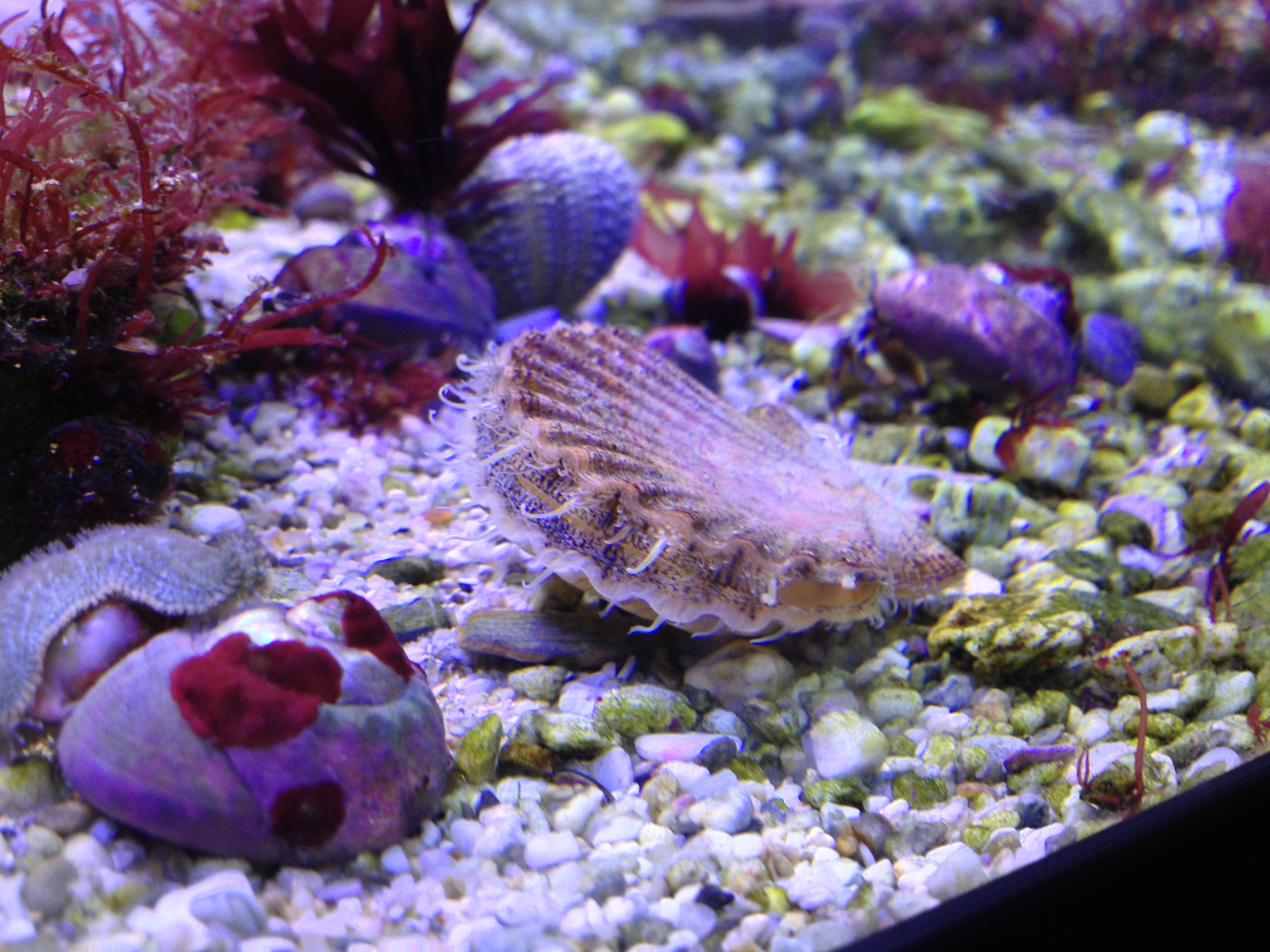 I will get rid of the sea urchins, as I am not sure the molluscs appreciate getting stuck to them. I have already gotten rid of the voracious snakelocks anemones and put them in a small tank (I will post about that soon). I have added a small scallop (Pecten maximus), which is very cool, and occasionally swims to another spot. I hope it will find enough to eat in the water.