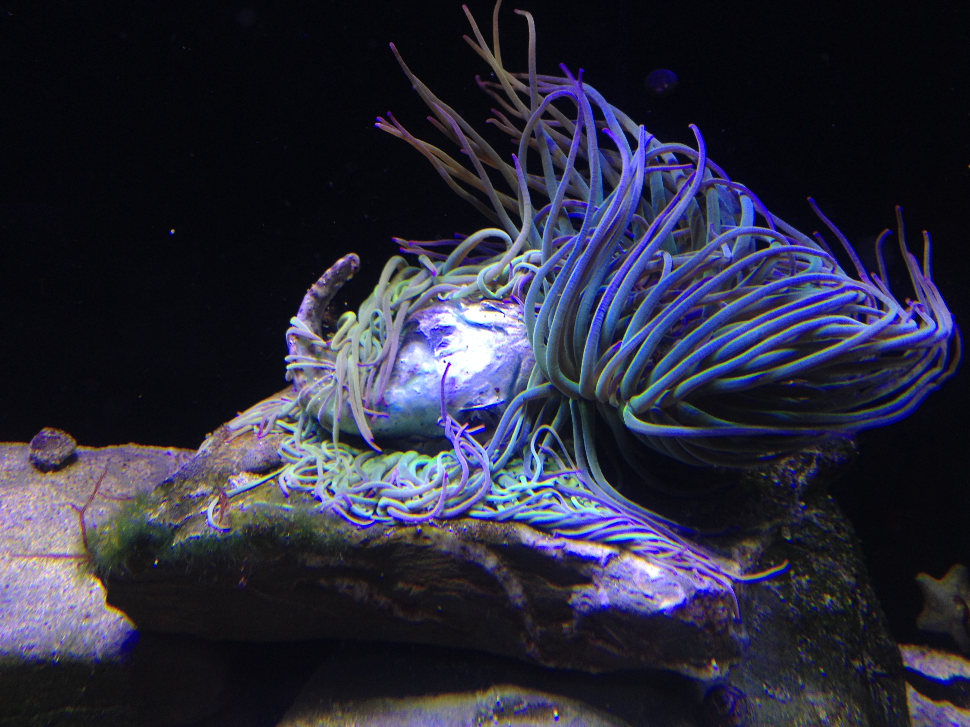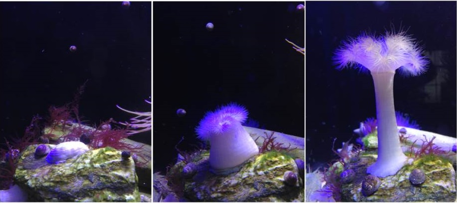 My friend marine biologist Chris gave me a snakelocks anemone that he had cured from its symbiotic algae. A very cool, bright white individual but it has returned to its original purplish colour so it must have taken up symbionts again. The snakelocks I already had, grew big, split into two and grew some more. Interestingly, one of the individuals seems to be turning from the green- to the purple colour variety: