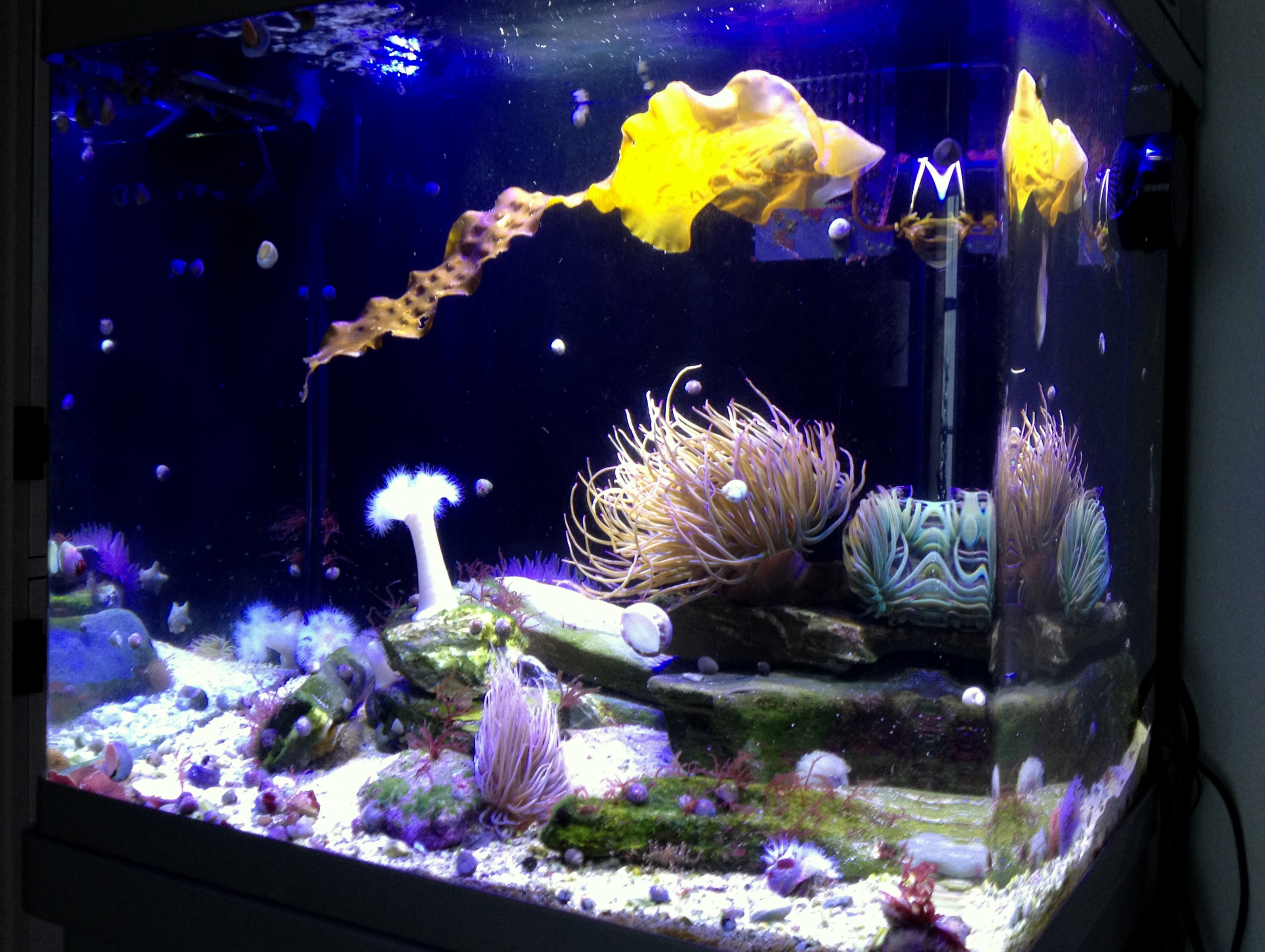 I have taken a break from experimenting with seaweeds and am focusing on anemones instead. I have added a bunch of small Plumose anemones Metridium senile that I scraped of the side of a pontoon. Weird fellas, they can fill up with water to be quite large, or just reduce to a crumpled little pancake. I have four white ones; I could only find very small ones of the orange variety and these were all devoured by Cushion stars (interesting). I’d like to have a large orange one as well, but I have to wait half a year until I can go diving again (they are very common in deeper water).