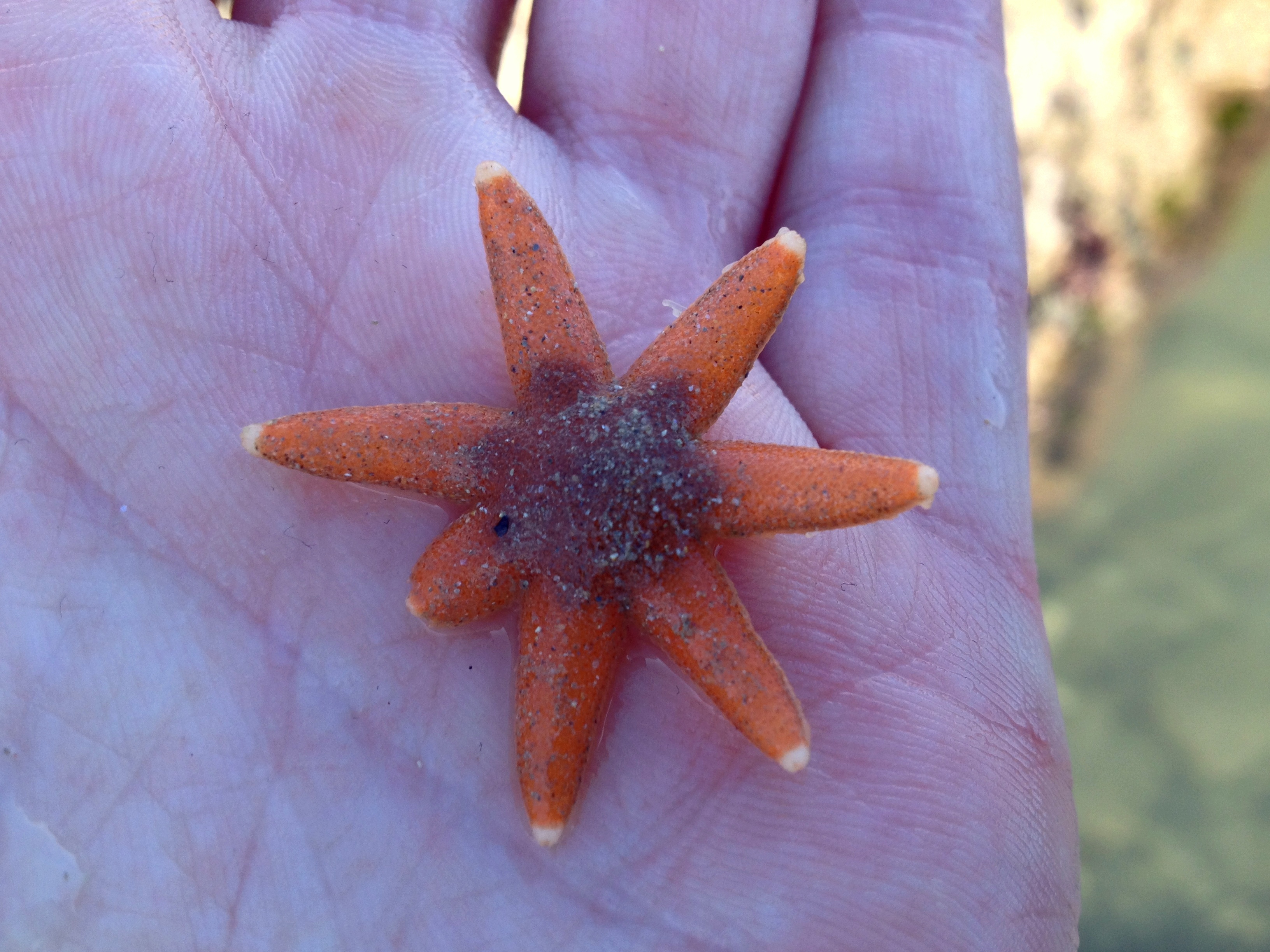 So for now just a little inventory. Molluscs: Turban- Grey- and Purple topshells, a Sting winkle, Thicklipped- and Reticulated whelks and assorted Periwinkles. Crustaceans: Common prawns and Hermit crabs. Anemones: Beadlet-, Strawberry-, Plumose- and Snakelock anemones and a Red Speckled Anemone. Echinoderms: one Sea urchin, a bunch of Cushion stars, the odd Brittlestar and a nice Seven-armed starfish Luidia ciliaris that I recently found in a rock pool on Castle Beach. This species can grow up to 60 cms and hunts for other echinoderms, let’s see what happens!