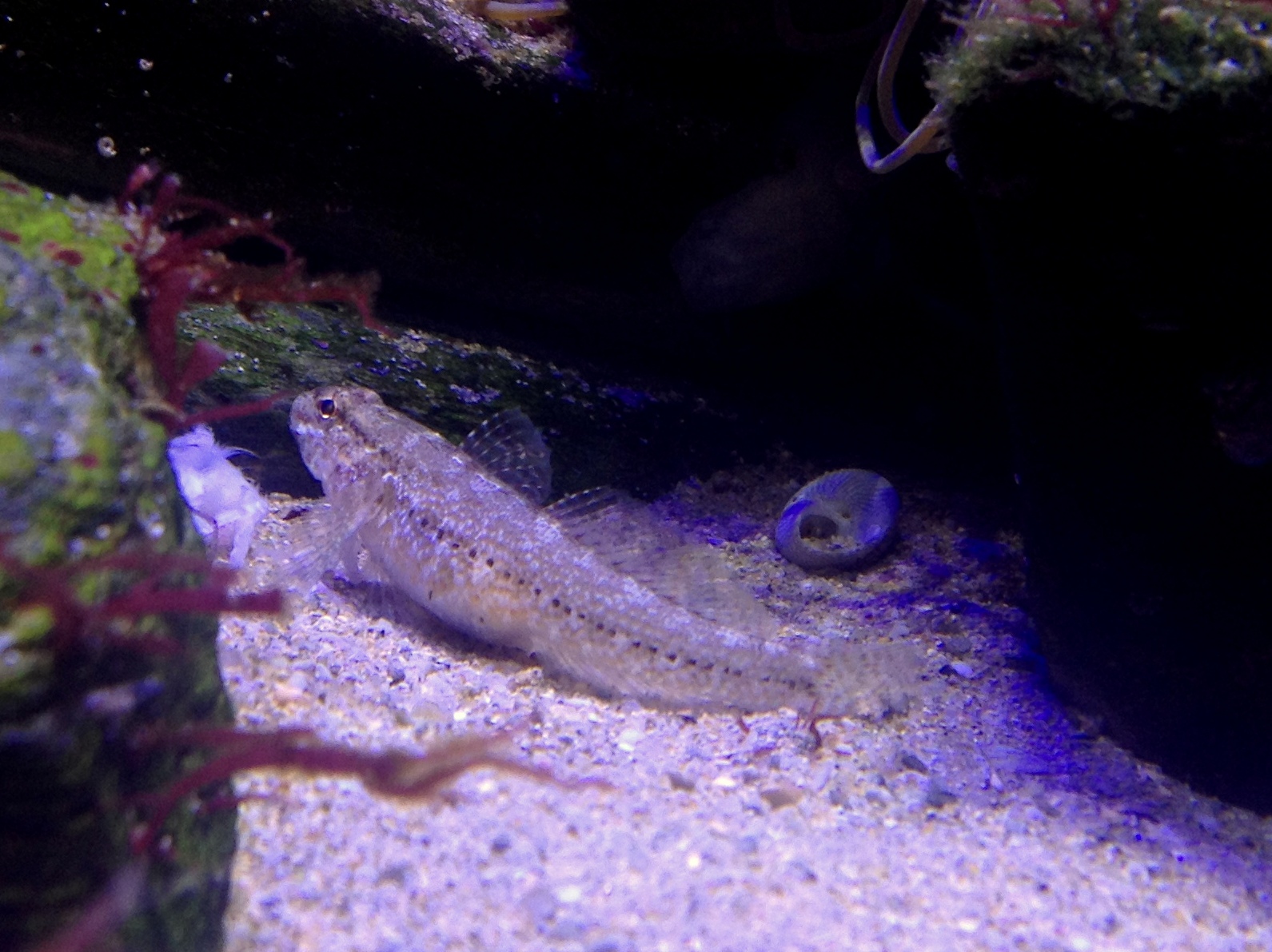 I have not done much with the aquarium recently. The algae are under control after reducing light levels and times. The Chrysymenia weed is growing everywhere and not looking too pretty. I will have to replace some rocks to get rid of them. My only fish is a Common goby Pomatoschistus microps, who eats bits of shrimp out of my hand. It also attacks Grey topshells when it is hungry. I would like to have have some Goldsinny wrasse and Mullet as they are beautiful and do not seem to fall prey to the Snakelocks anemones, but these species are difficult to catch. I will collect a couple of squat lobsters as they are very entertaining to watch. Ideally Spiny squat lobster Galathea strigosa, as they are among the most nicely coloured animals to be found here. They are not common in the intertidal, although they might be common subtidally (I noticed one in a picture I took of some Bispira volutacornis worms recently). The Goby with a full belly:
