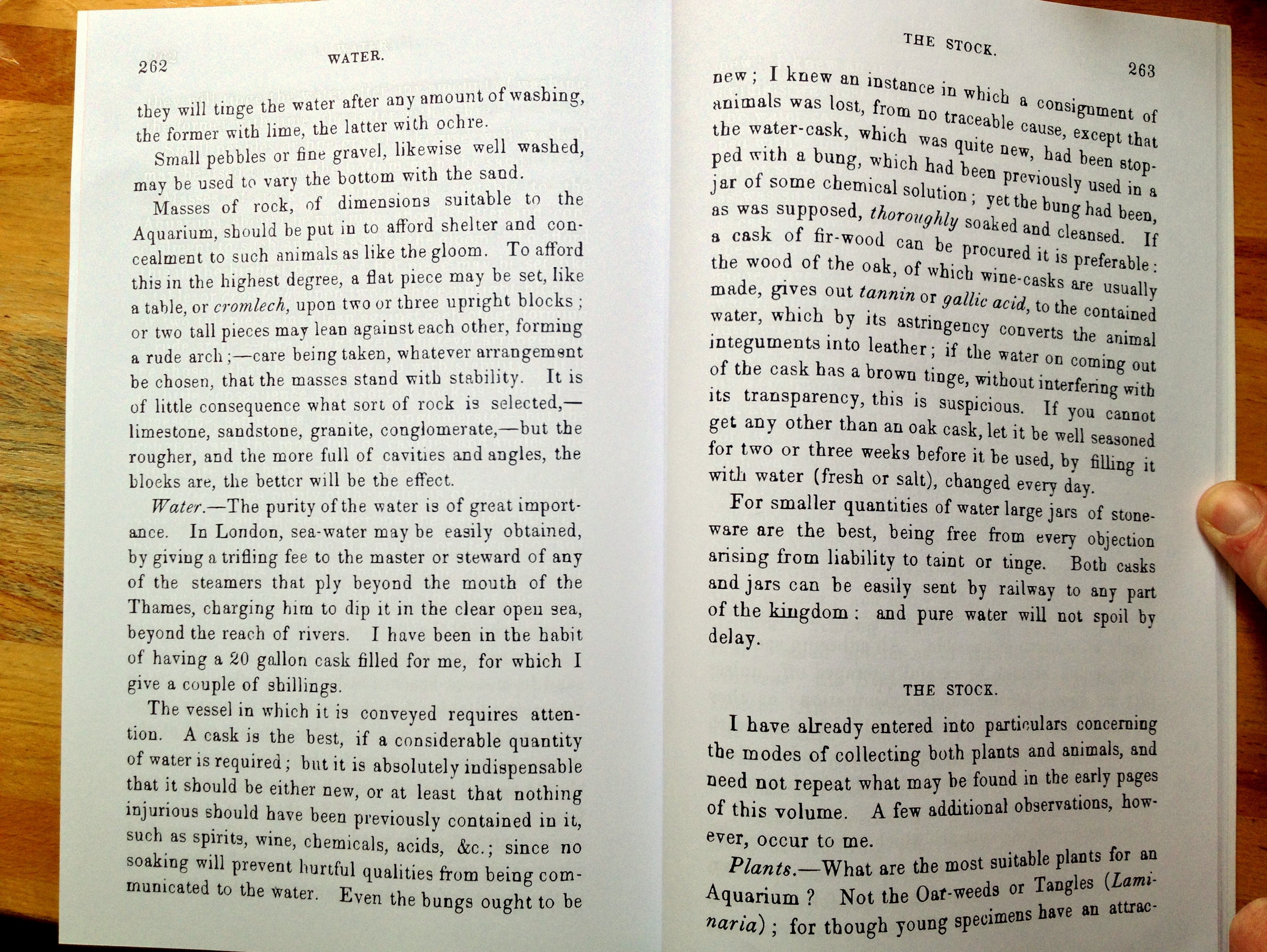 They sure don’t write like that anymore! Gosse’s aquarium was small (2*1.5*1.5 feet), with glass plates set in grooves in a slate bottom and corners of birch-wood. He used ‘white-lead putty’ to fasten the glass, which meant that when he first started up his aquarium, everything died within the first day (except for the mullet fry and beadlet anemones). Lucklily, after proper rinsing, lead poisoning could be prevented in the remainign attempts. Of course he had no pump, filter, chiller or lighting. He however had deviced a means to ‘purify’ the water: a ‘drip-glass’ hung above the aquarium, dripping down two or three gallons a day thus aerating the water. All in all his experiences of which organisms do well in the aquarium and which do not, descriptions of rock pooling adventures and animal behaviour and even musings on the spiritual use of natural history make for a very interesting read.