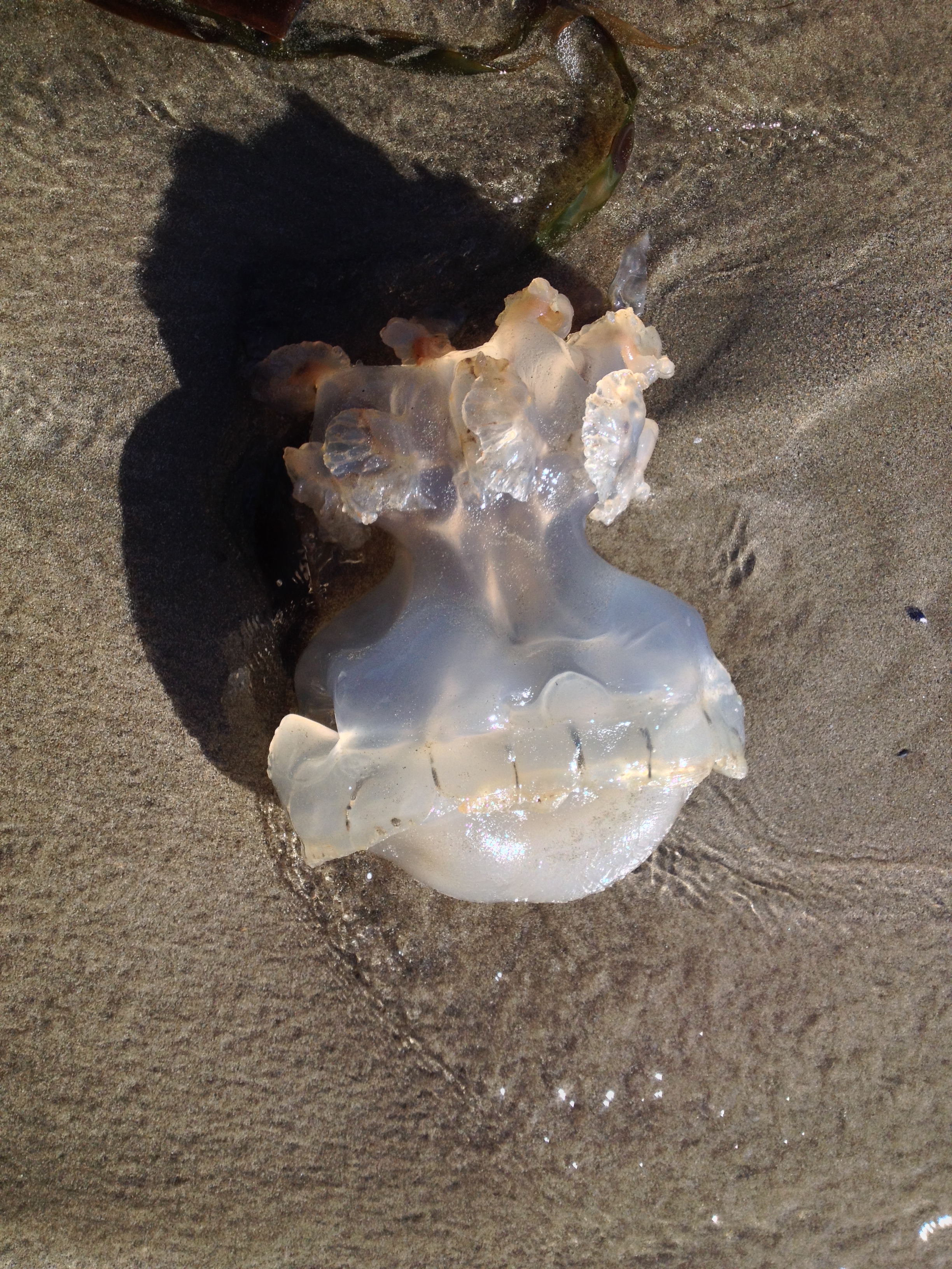 Back at Carne Beach on the Roseland Peninsula. No time for a good rock pooling session, but a nice walk along the beach revealed some nice surprises. Amongst the Laver and Furbellows lay Common starfish, Pod razorshells, Striped venus, Banded wedge shells and Rayed trough shells. A first: the Masked crab Corystes cassivelaunus (a female): common offshore buried in the sand, and usually only seen when washed up dead on the shore as is the case here (next to it a Sea apple). Also a beautiful piece of Sea beach (or Sea oak? the margins seem not ruffled enough though…). Finally, a Barrel jellyfish Rhizostoma pulmo, remarkably firm and heavy. This is a small one, about 20 cm across; 40 cm is normal and occasionally they grow to more than a meter in diameter, making it the largest jellyfish species in British waters.