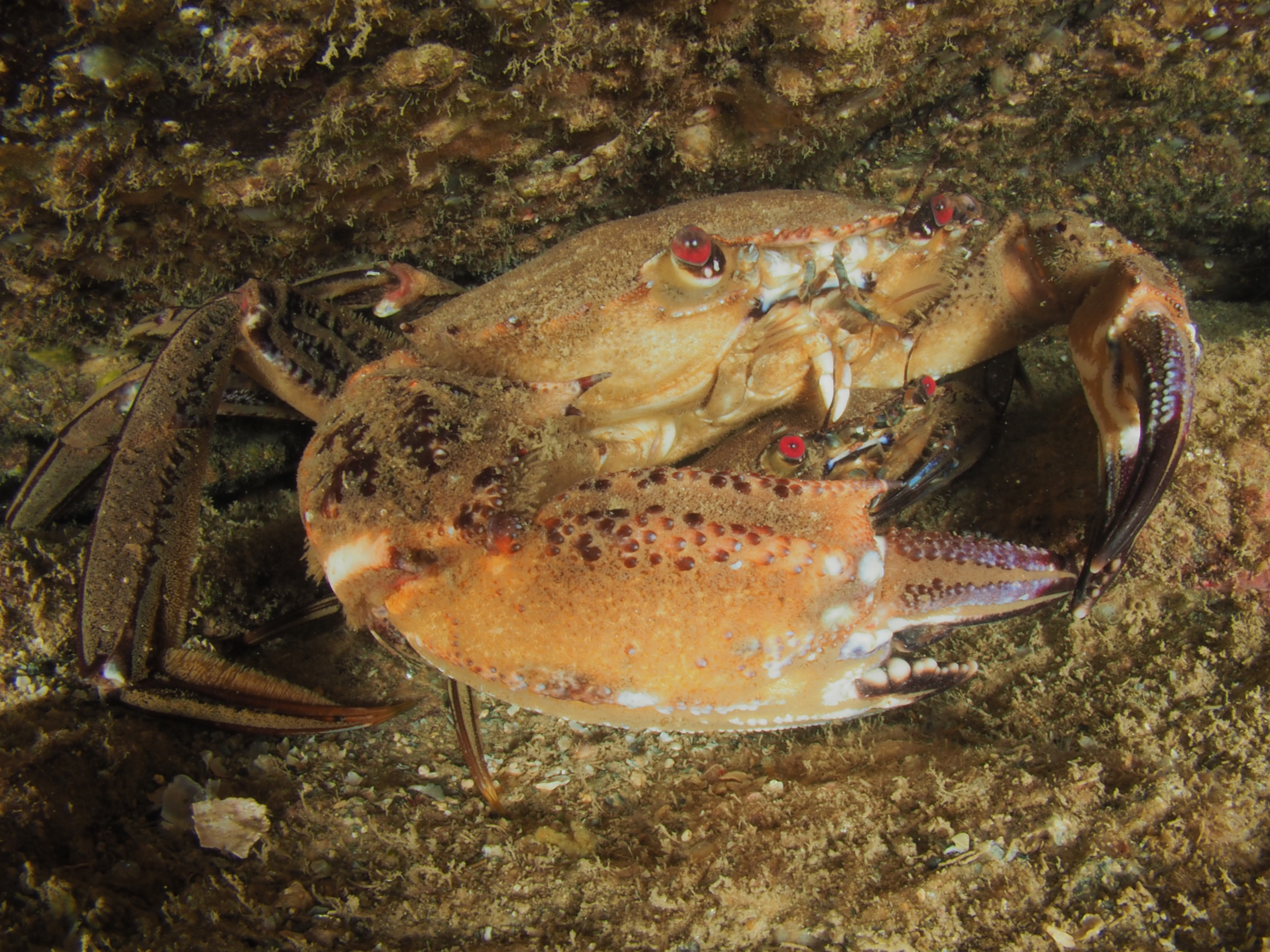 I have done a fair bit of diving at Silver Steps this year and it is high time to publish some of the photos I took there, starting with the Crustaceans that inhabit the cracks in the rocks. Most pics were taken with the macro-wide angle lens, which is not only suited because of its perspective, but also because it is long and thin and so can be poked into the crevices where these creatures lurk. Above, two Velvet Crabs Necora puber, which are abundant and feisty – I only noticed the small female in the photo afterwards! Below a European Lobster Homarus gammarus, also quite common and some of them are quite big. They usually shuffle out of their den quite menacingly only then to retreat again. Although impressive animals, it is hard to get an aesthetically pleasing shot out of them I find.