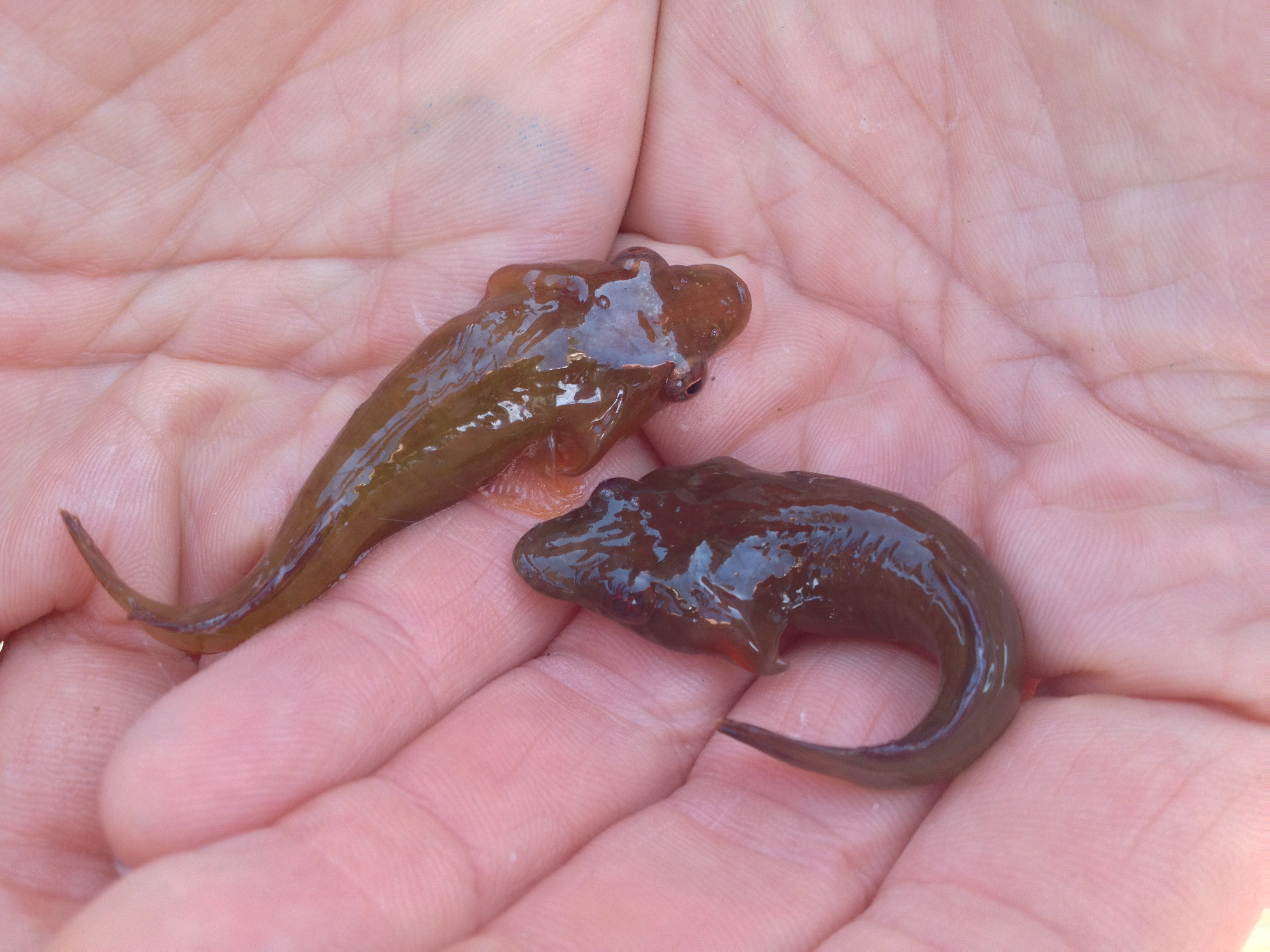 The tide this Sunday in Flushing was as low as it was the day before in Mount’s Bay and the weather was just as great too. We could walk among the Eelgrass and Golden kelp Laminaria ochroleuca. There were lots of Snakelocks anemones Anemonia viridis around; especially striking were patches of what must be clones. The tentacles are much shorter than the ones in my aquarium or those found deeper on kelp, must be due to being less exposed to the waves. Loads of fish as is usual here, a single overturned rock yielded five species alone! Again pictures of the Connemara clingfish Lepadogaster candollei, a Butterfish Pholis gunnellus (very wriggly, hard to get a good shot) and Tompot blenny Parablennius gattorugine eggs:
