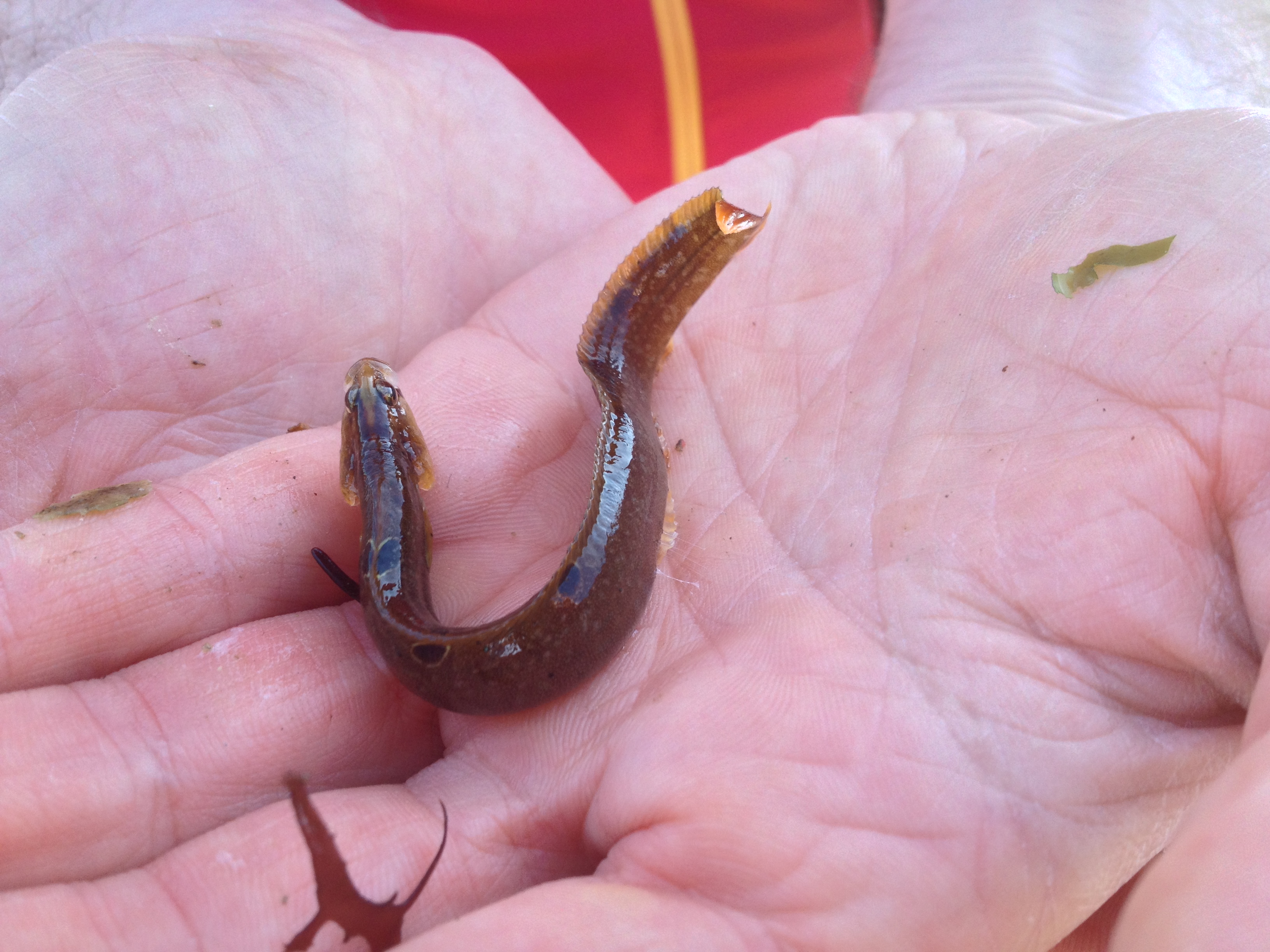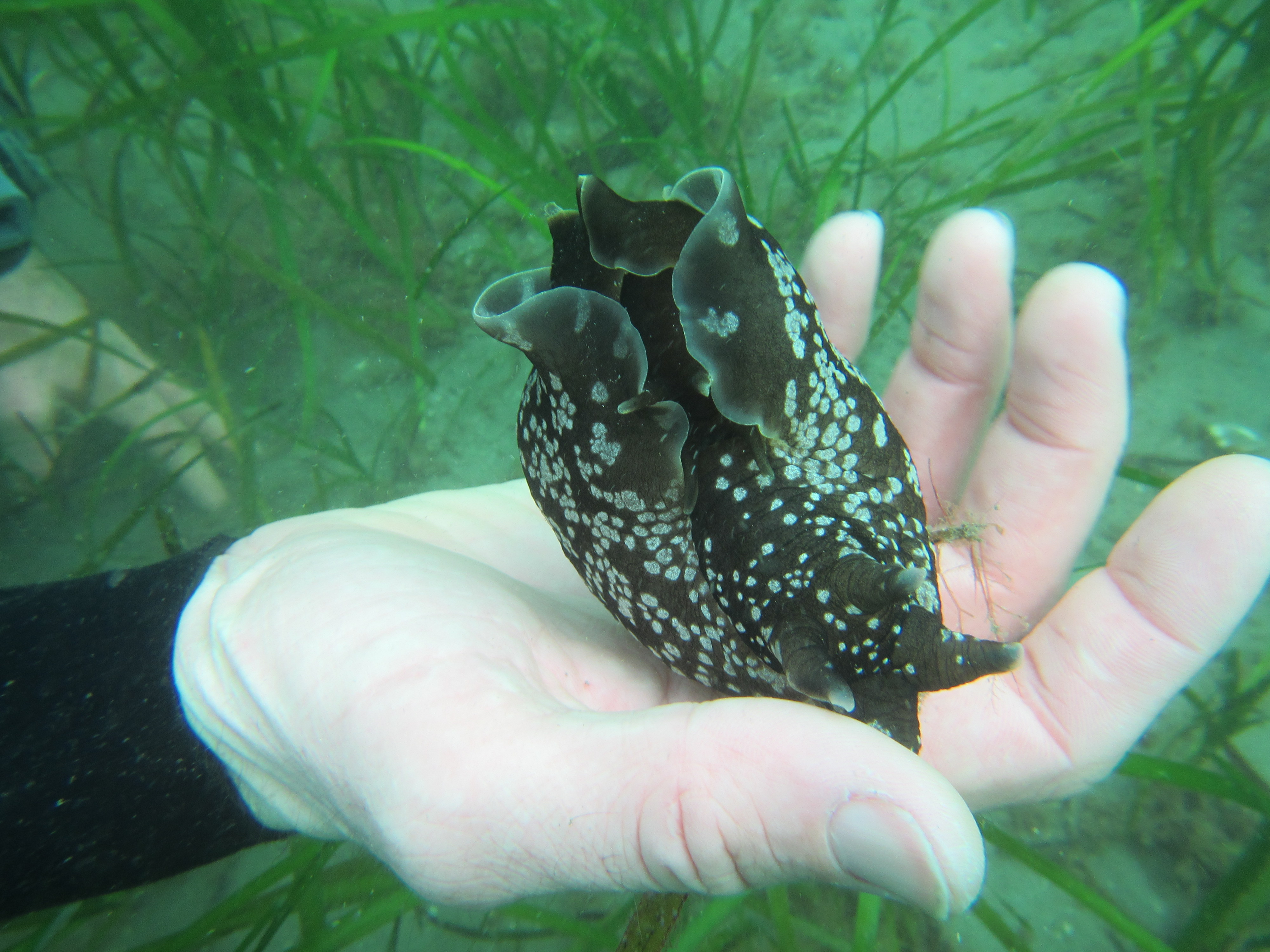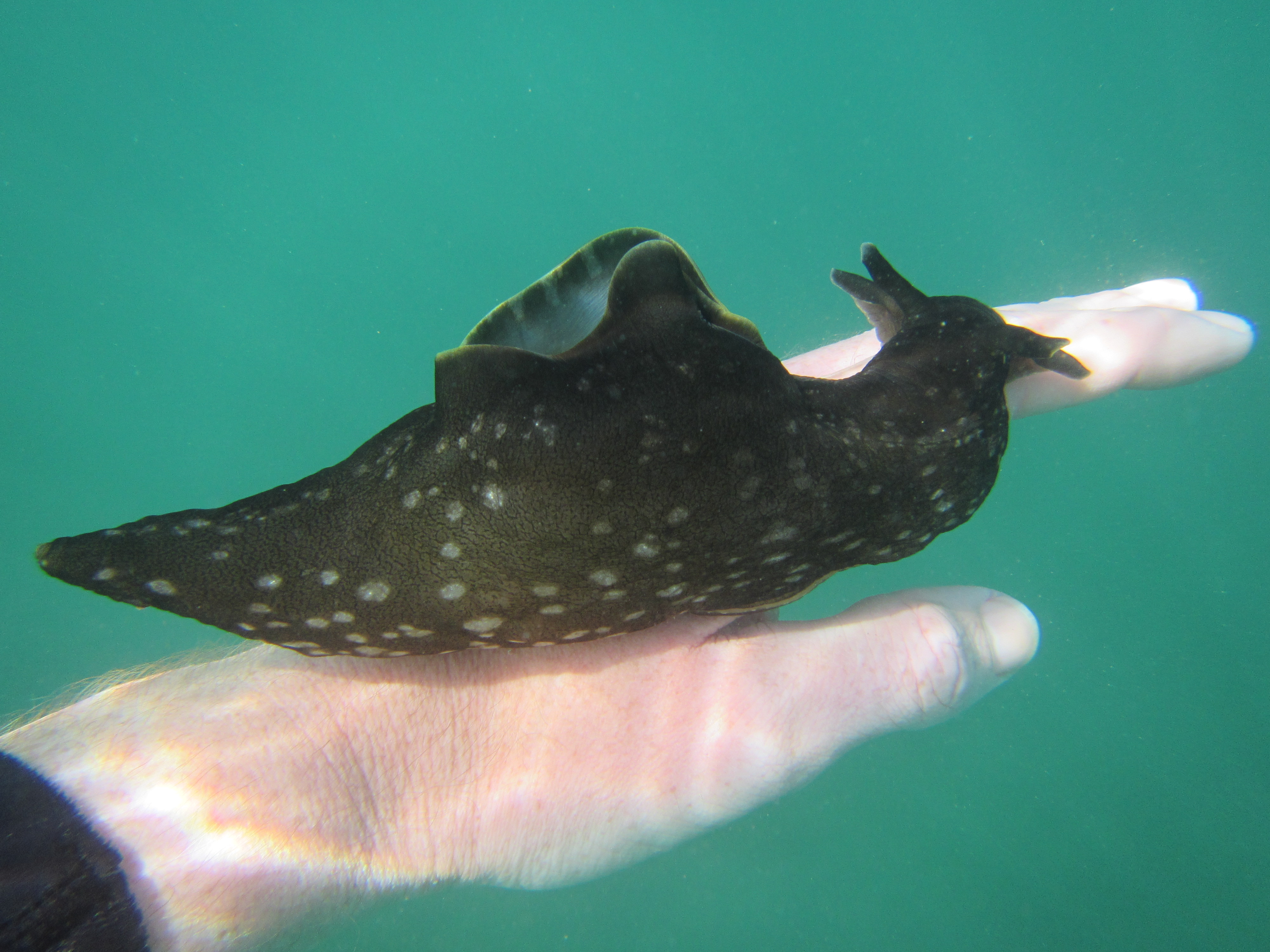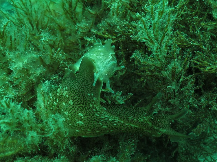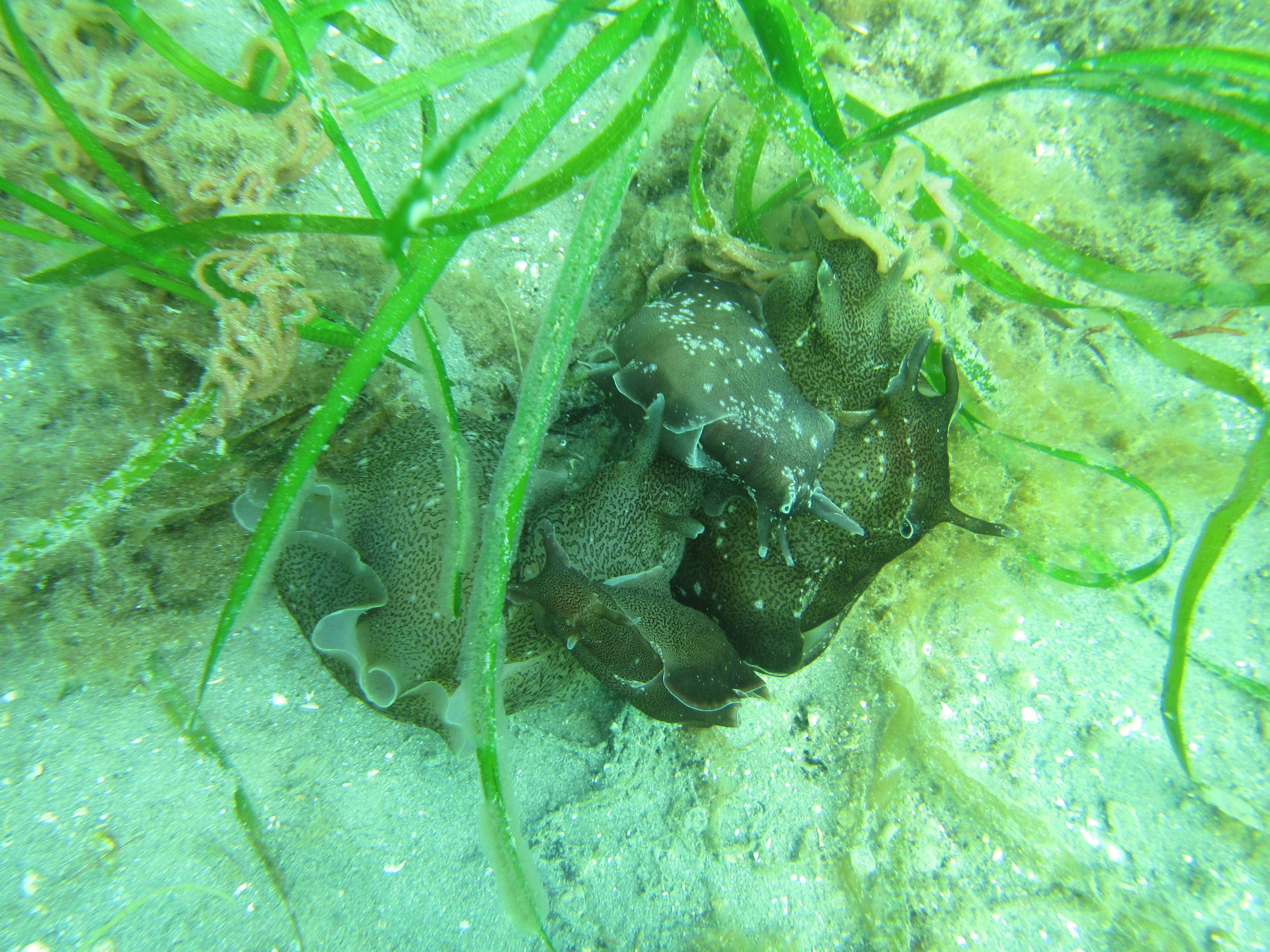 A nice long snorkel in the Helford ‘River’ from Grebe Beach today. The weather was great and so was the water temperature. The timing was good too, close to low tide, so the Eelgrass beds started at only about one meter depth. There were a lot of cool new finds. What was most striking was the extremely large number of Sea hares Aplysia. There was almost one every other square meter, ranging from 5 to 30 cm, and from grey to light brown to very dark brown. The common species Aplysia punctata ususally reaches 7 cm (occasionally up to 20 cm), so the size and often reticulated veining probably make it A. depilans. From David Fenwicks aphotomarine site: “An easy way to distinguish this species from (a third species) Aplysia fasciata is to run a finger from front to back on the dorsal surface. If the finger cannot travel all along the animal from head to tail then it is A. depilans.” This I did not know so I need to go back and stroke some slugs! I see that these large (up to 40 cm!) beasts have been found here before. A not particularly large individual on my hand, as well as an orgy, with some orangy strings of eggs visible: