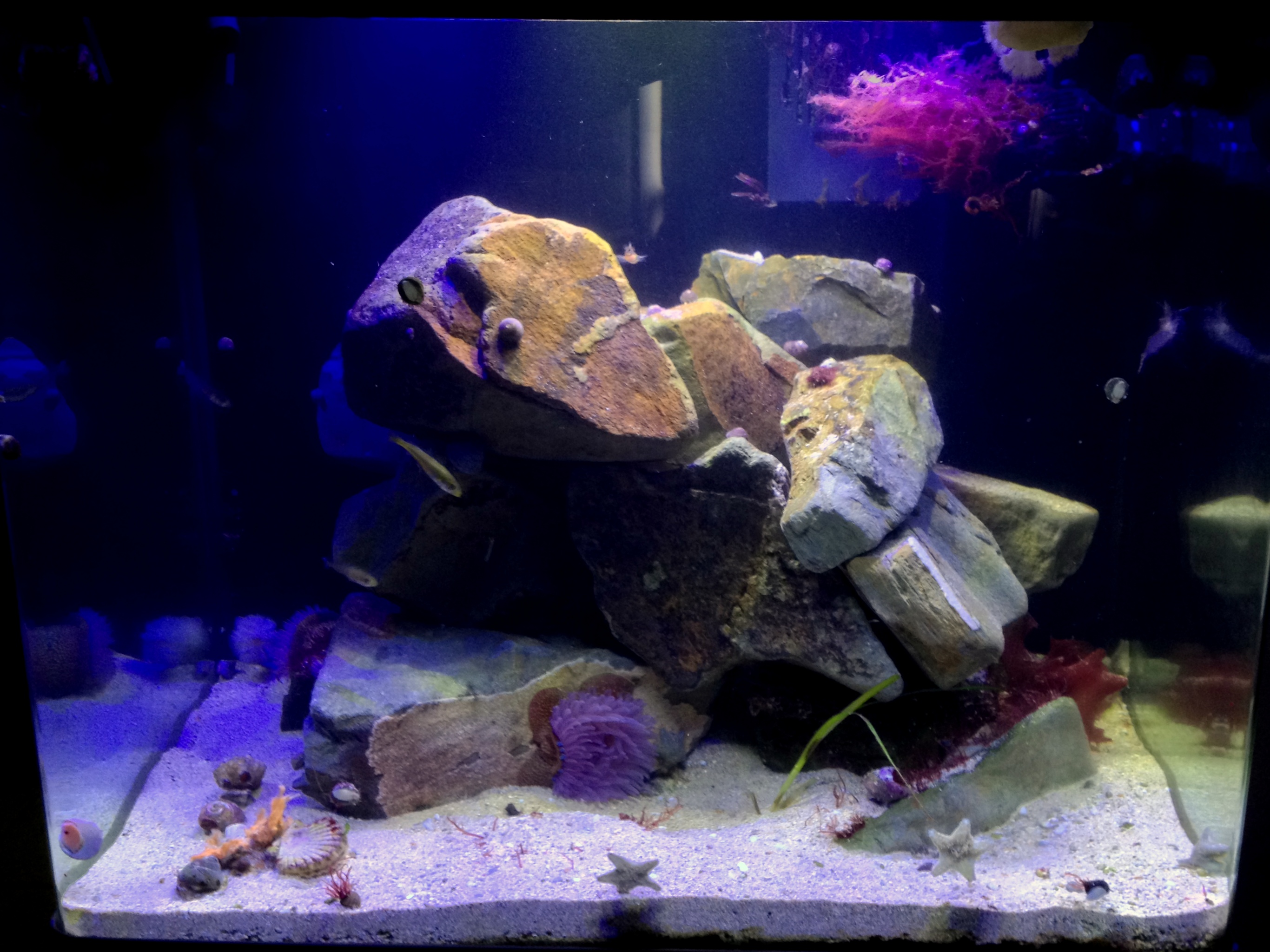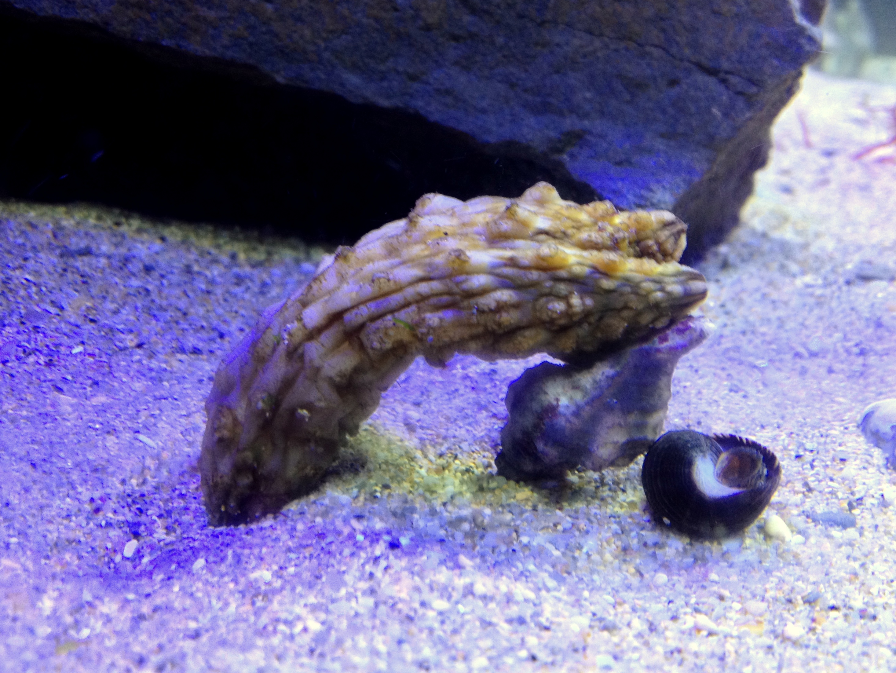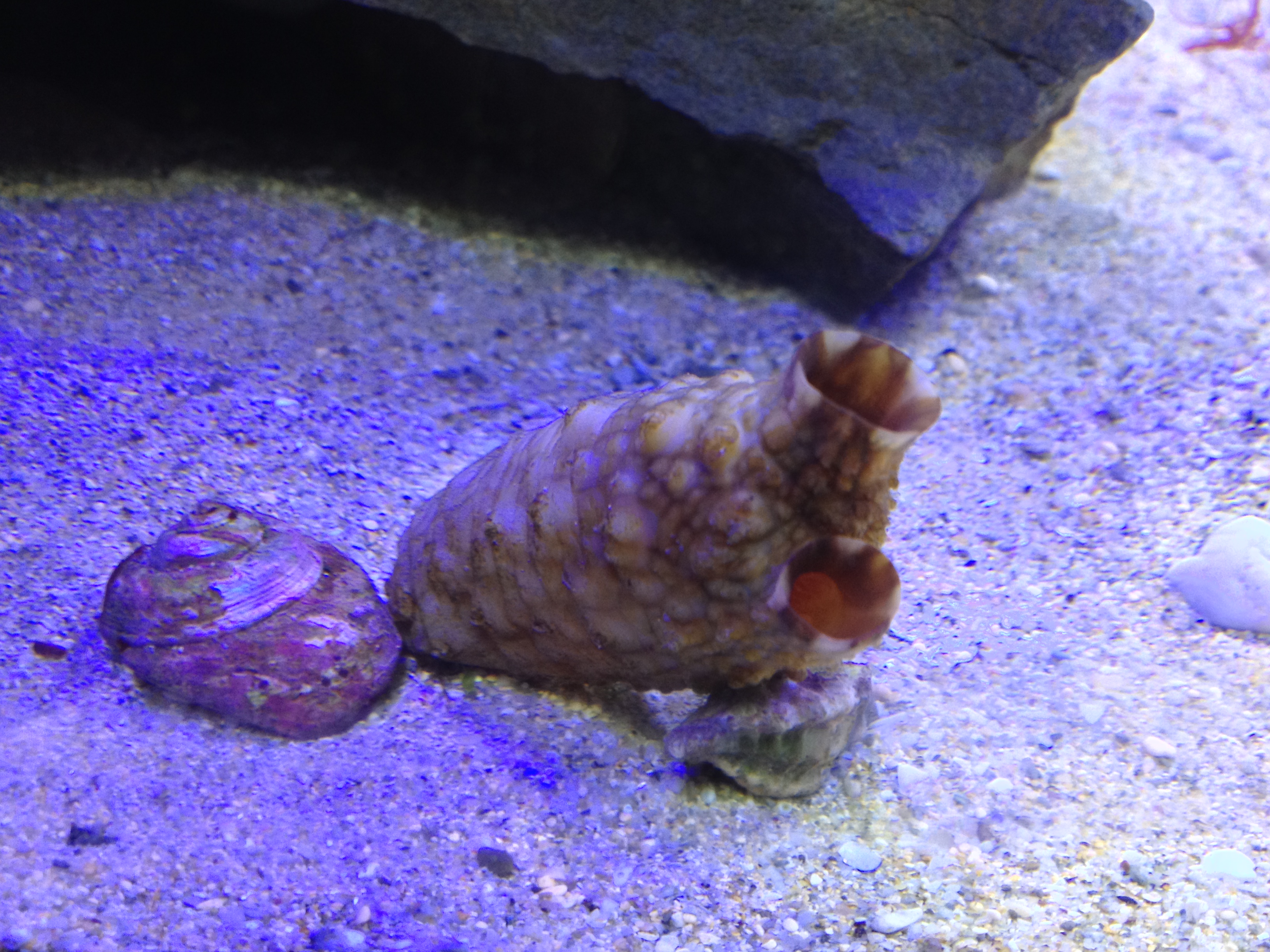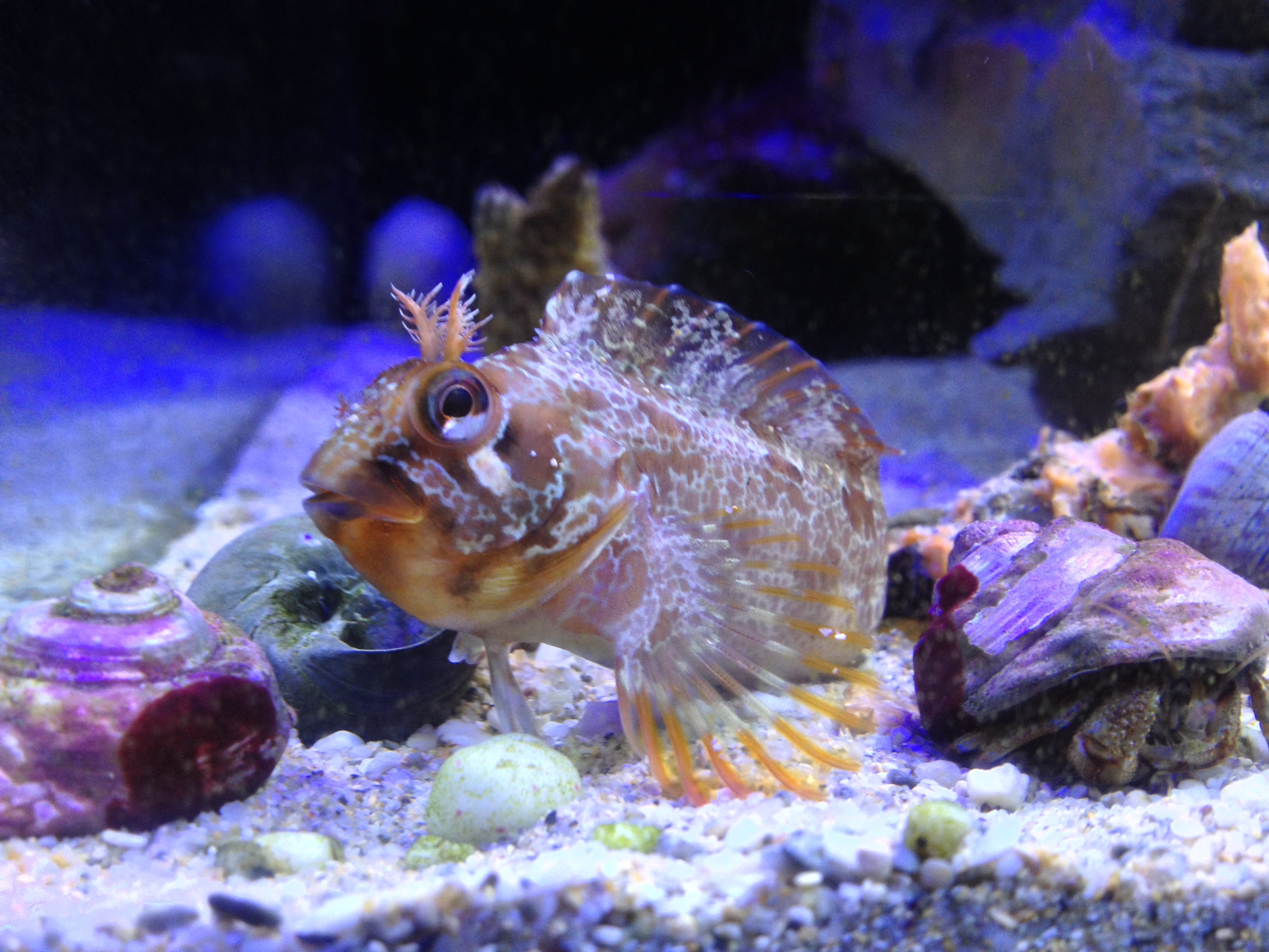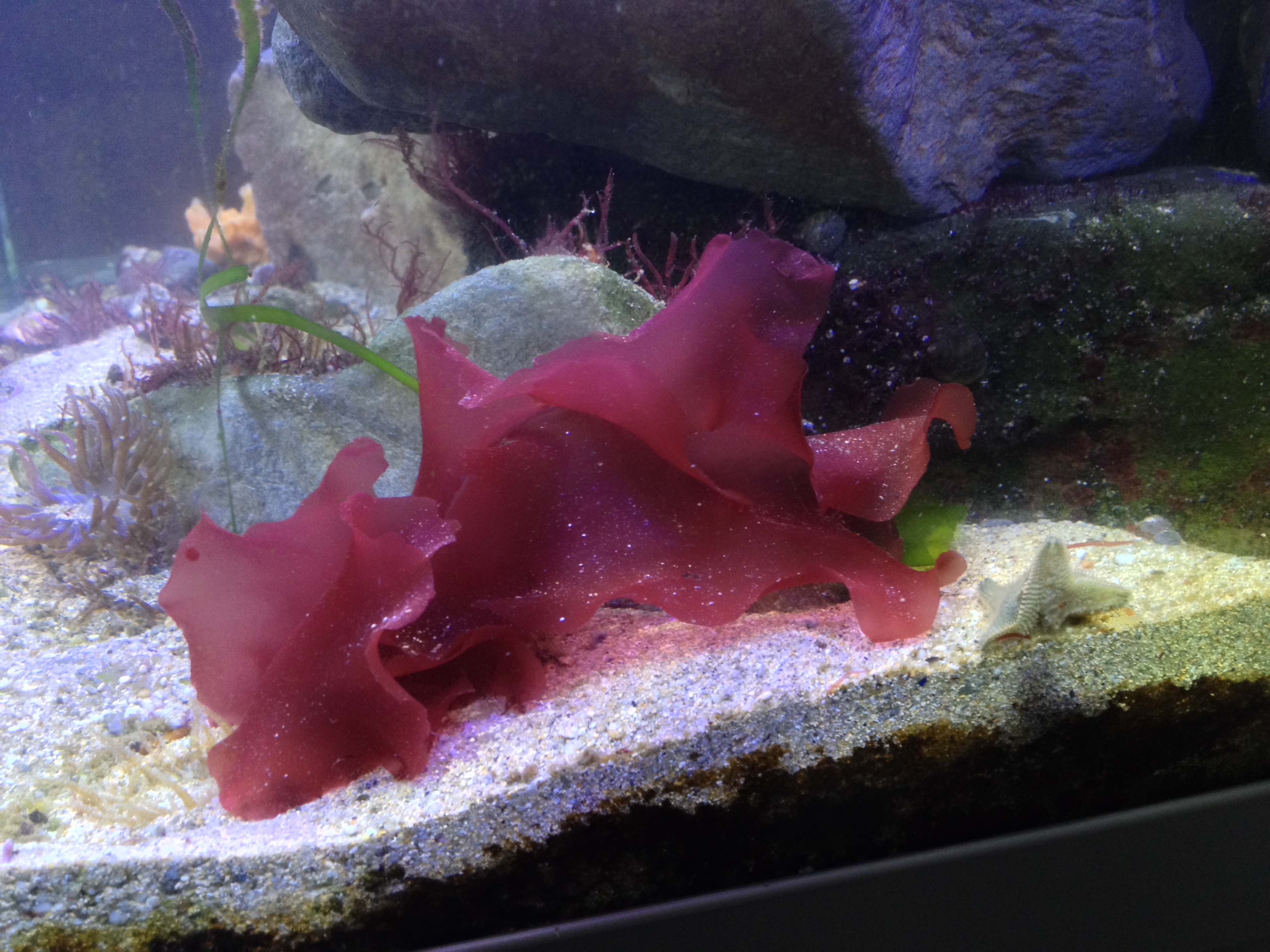 The aquarium was in desperate need of a make-over (again…). I hauled a ton of rocks over from the beach and stacked them up. (I thought at first that I would need something to stick the rocks together (epoxy, superglue or waterfall foam) but that wasn’t really necessary). I also removed most of the gravel and replaced it with sand. So quite a big change but it really looks a lot better. However, my nice burrowing Red-speckled anemones suffered a bit when putting the sand in, and even after siphoning it off again I could not really find them anymore….hopefully they turn up again! The aquarium is still a bit bare and I have to go out and collect things that will live on the rocks, such as anemones and seaweeds. However, there is some progress on the seaweed front. There is a bit of Irish moss Chondrus crispus growing spontaneosly from the back wall. There are also some patches of pink corraline algae; which must be Coral weed Corralina officinalis judging from one outgrowing patch. Having this species grow would be great, but they do not seem like fast growers. Chrysymenia wrighti is still thriving on the circulation pump; I remove a bit every now and then, so it acts as an ‘algae scrubber’, removing nutrients from the water. I have placed a couple of other seaweeds in the aquarium, a bit risky as they can die off and start trouble, but I can’t help it. The red Soliera chordalis below has done well before but unfortunately has started to die off a little already (first pic). I have a big piece of a flat red species that has started to grow from nowhere as well (second pic).One day, the aquarium was full of strings of Painted topshell eggs. I noticed when feeding a day later that the water was not very cold: I had forgotten to switch the pump/chiller back on two days previously! So the trick to breed this species is to increase the temperature, although I am not expecting much to happen with the eggs. Either the Thick-lipped or Netted dogwhelks are also occasionally sticking their egg masses to the glass. I placed a chunk of orange Estuarine sponge in the aquarium; this was devoured by Painted topshells and Cushion stars, so it is a good bit of live food to add. I had planted a little washed-up eelgrass plant to see if it would survive and indeed it has grown more roots. (If you want to try this yourself, please always use washed up plants and don’t dig out any, as eelgrass beds are vulnerable habitats.) It would be great to have a second tank dedicated to eelgrass….The little scallop is still happy (see close-up). I have added another filter feeder: a Leathery sea squirt Styela clavata. Butt-ugly, but that is actually fun too. I am trying it out as they are an invasive species and so probably pretty hardy. A Sting winkle seems to like it (but not eat it). I have never seen my two Sting winkles eat anything actually. They move about very slowly, but they have grown.Now the snakelocks anemones are gone, I have added some more fish. I have caught some juvenile Pollack Pollachius pollachius with my net. At first I caught ones that were less than an inch, but they did not survive. Of the six two-inch or so ones I caught, three dissappeared after one day, but the remaining three are going strong. Very nice looking fish! I also caught a little Tompot blenny Parablennius gattorugine (by hand at low tide). It is quite shy, but is increasingly showing itself. A beautiful little fish! I have one remaining Two-spotted goby. The Common goby is doing very well and eats from my hand. I think I’ll go for another little tompot, more Pollack and Two-spotted gobies. Ideally I would catch some Leopard-spotted gobies with a trap when diving, let’s see….The other fish I would like to have again is the Goldsinny wrasse: very pretty and not as nervous as Corkwing wrasse.