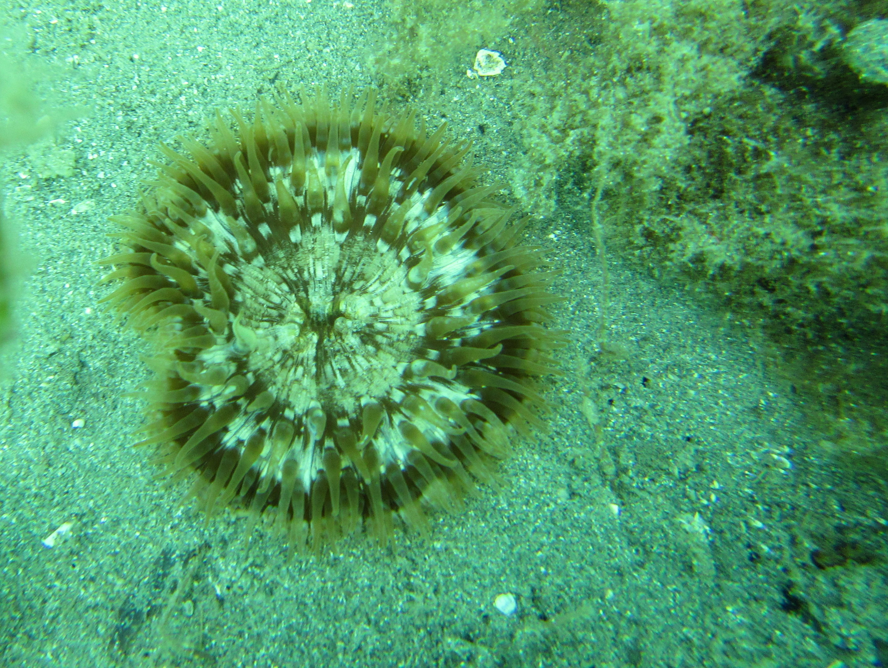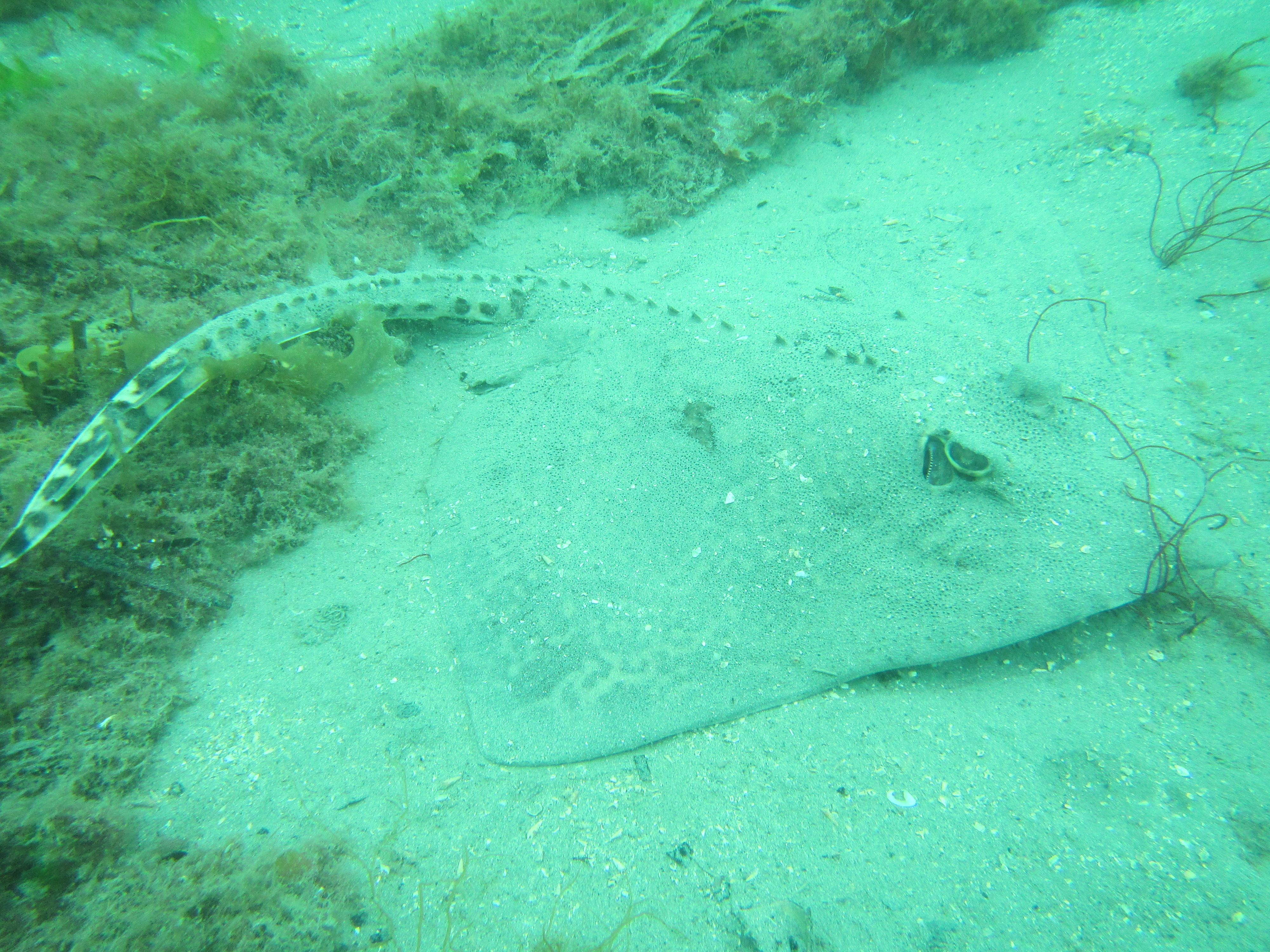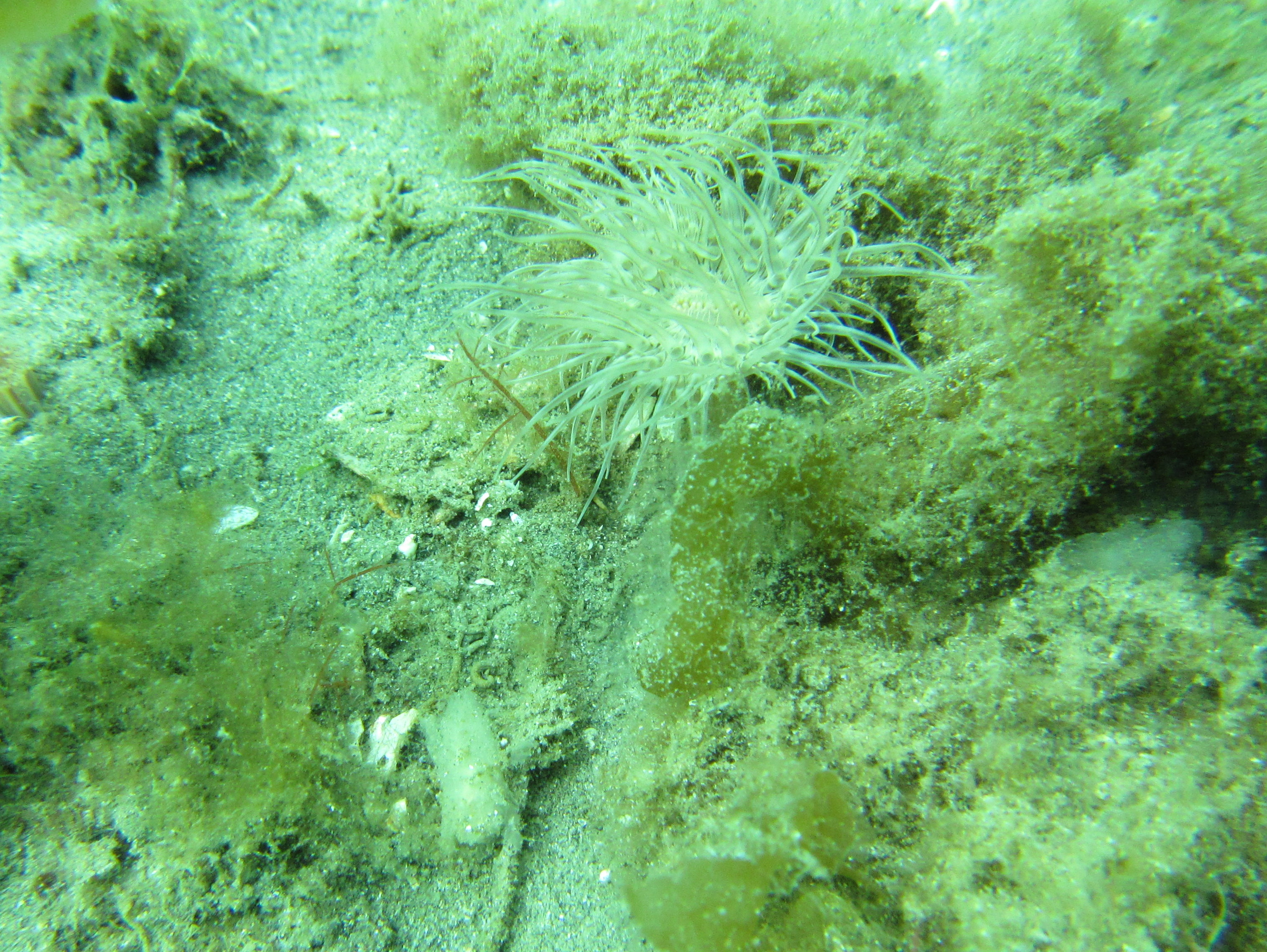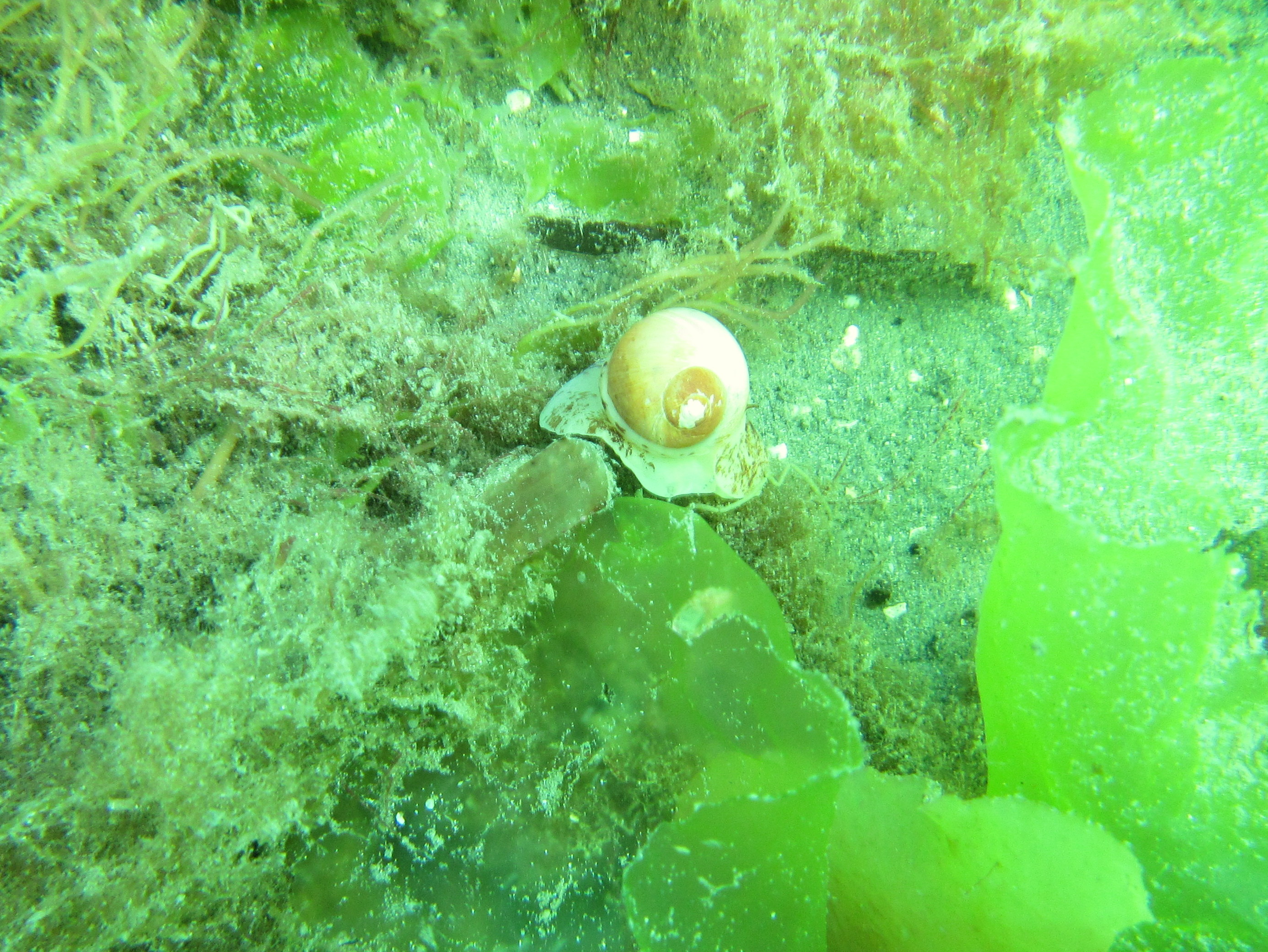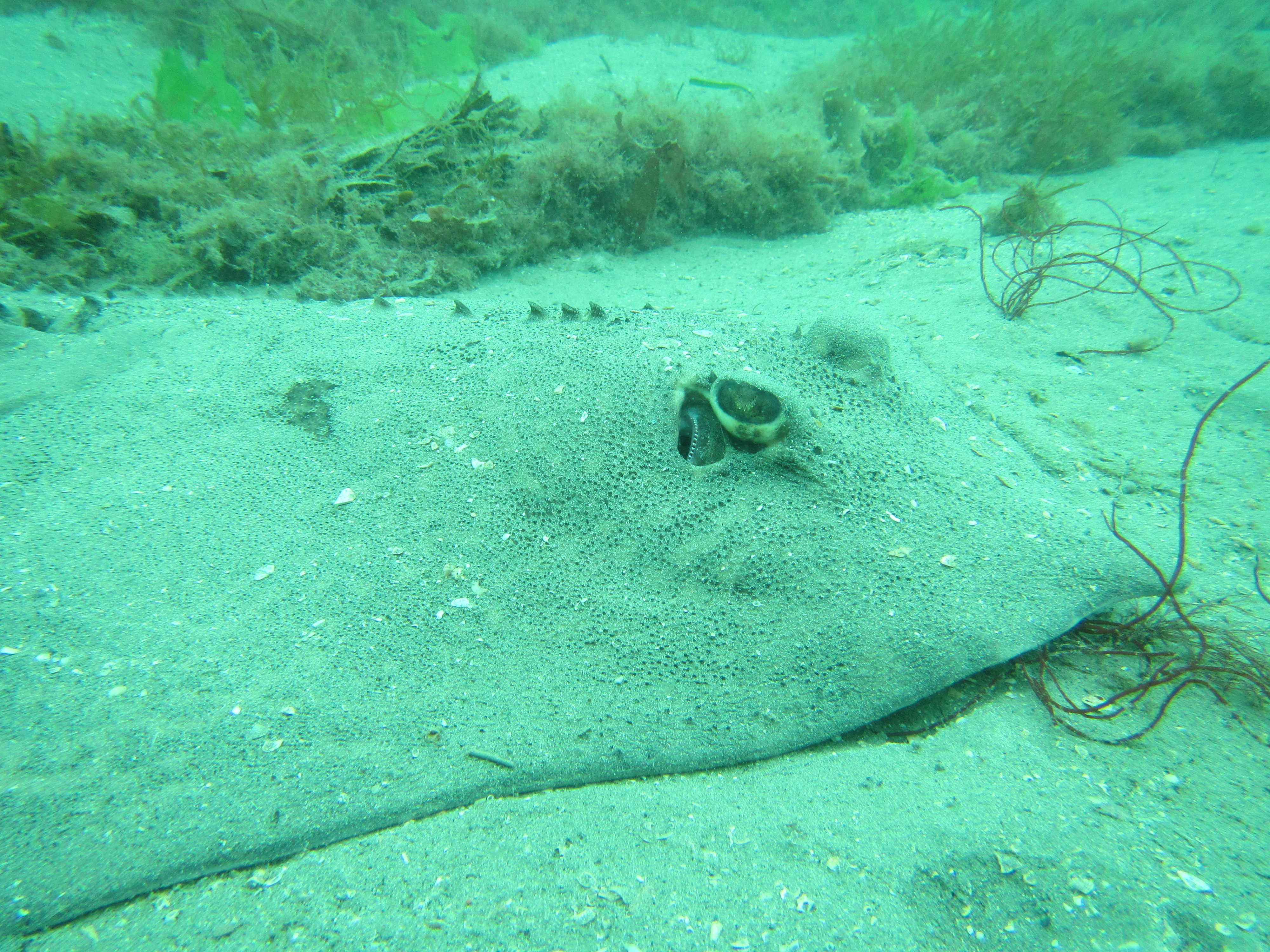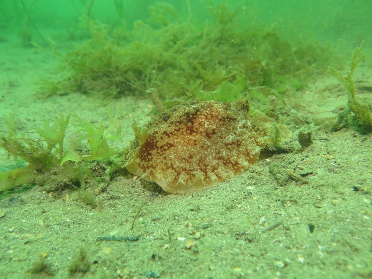 Another interesting mollusc to see was the predatory Necklace shell Euspira catena (not a very good shot, would be nice to go back diving soon so there is more time to take pictures). Other nice finds include a Mud sagartia Sagartia troglodytes anemone (I think!) and a small Sagartiogeton undatus anemone. Finally, at only 2 meters depth, we found a good-sized cuttlefish Sepia officinalis, lying still trusting its camouflage. In places, black Sepia eggs could be seen attached to the Eelgrass. Some of us also spotted a juvenile thornback ray in the shallows: