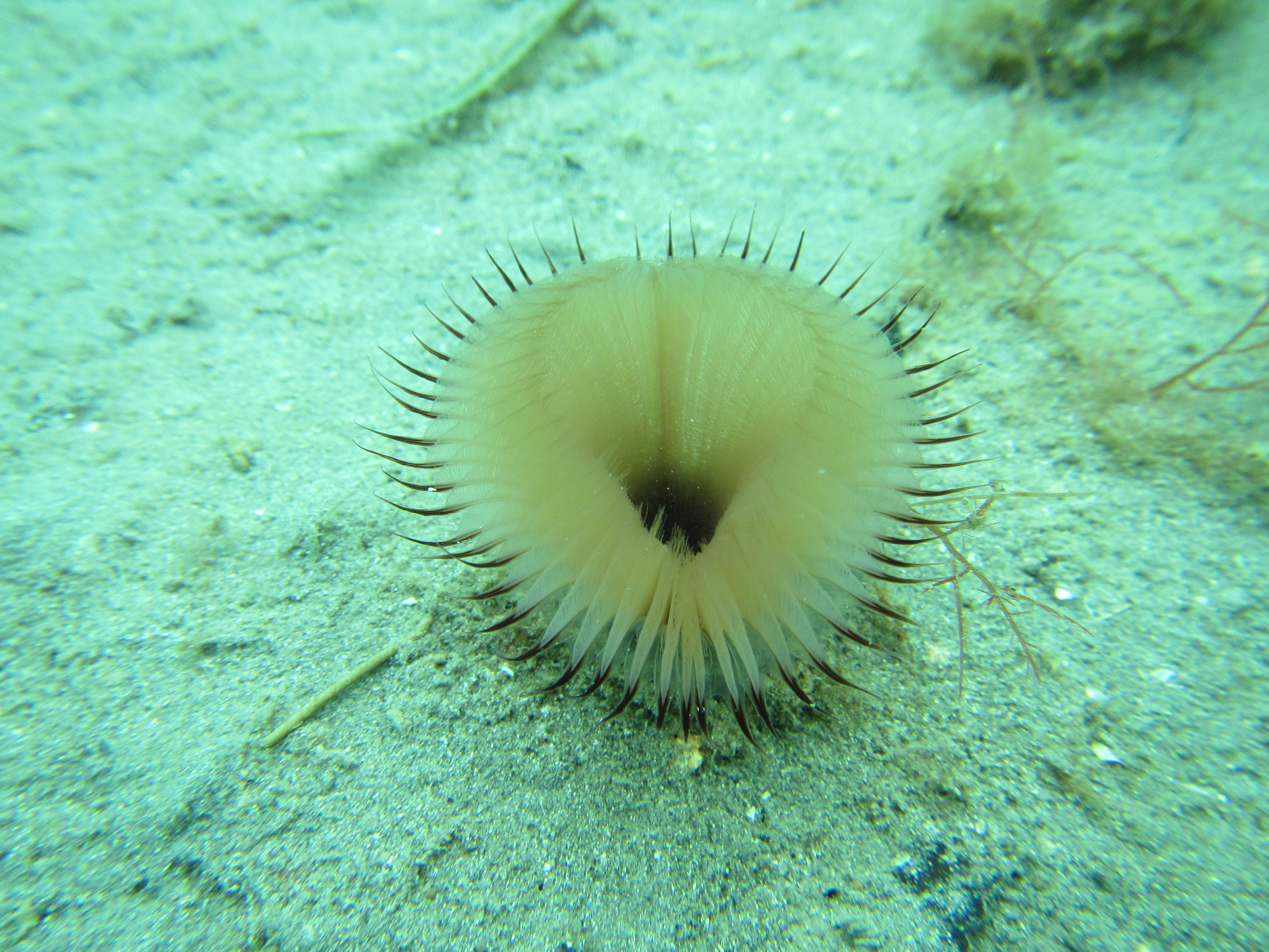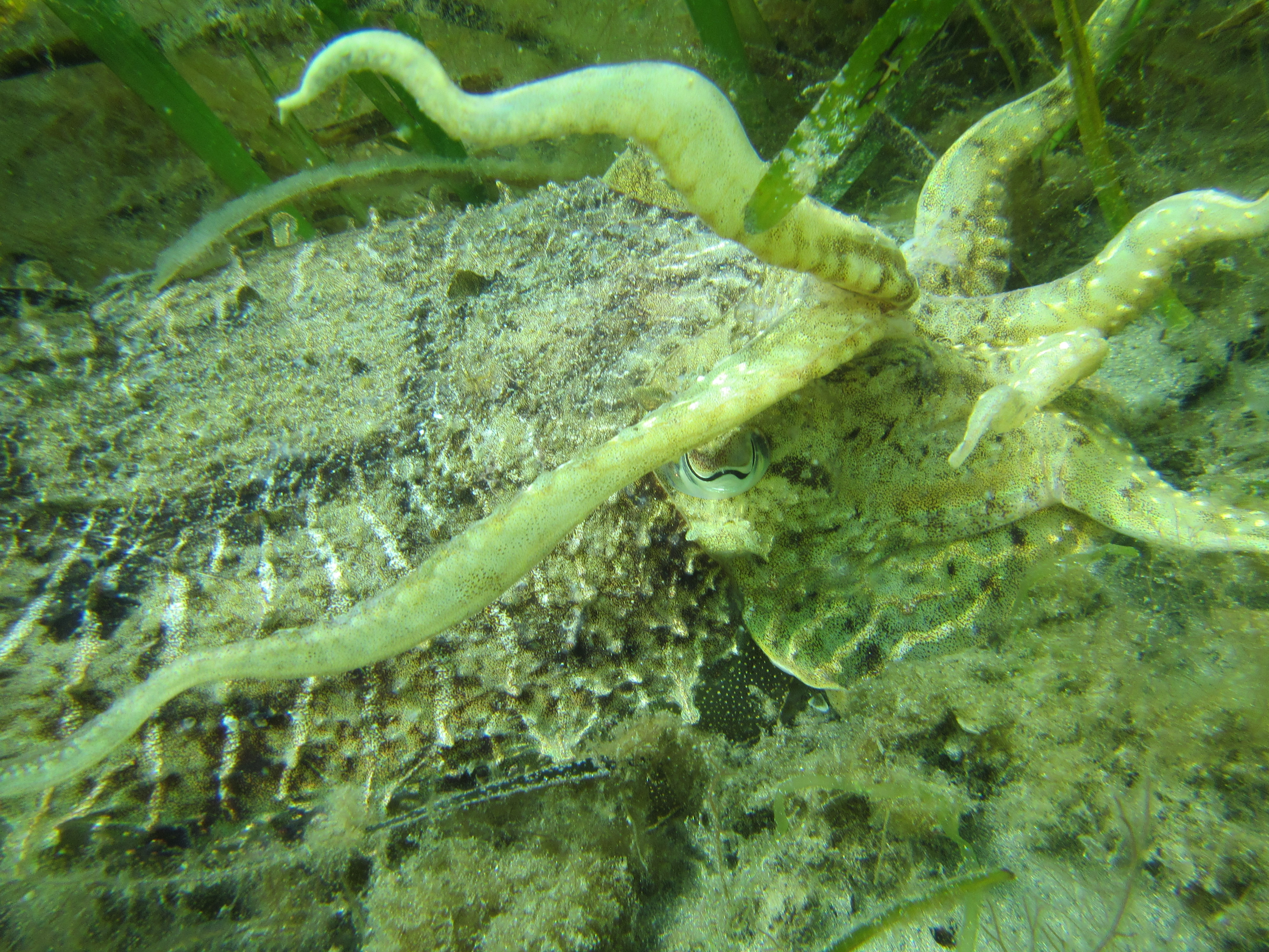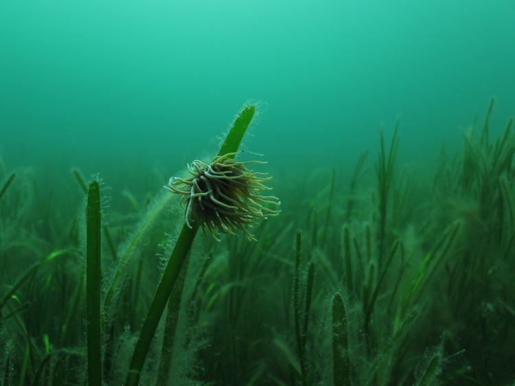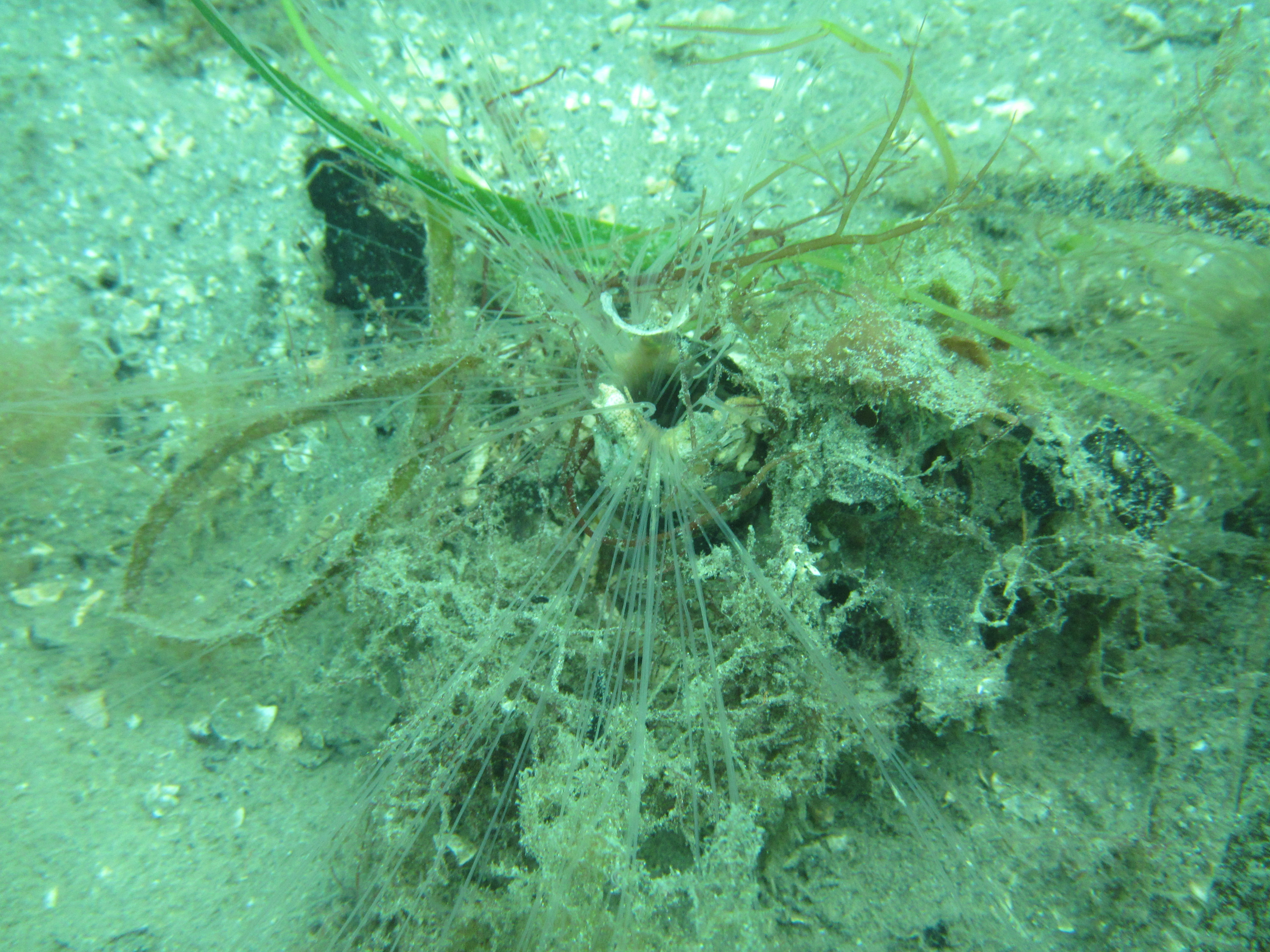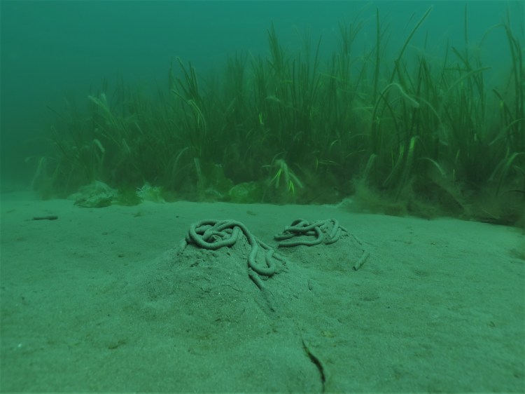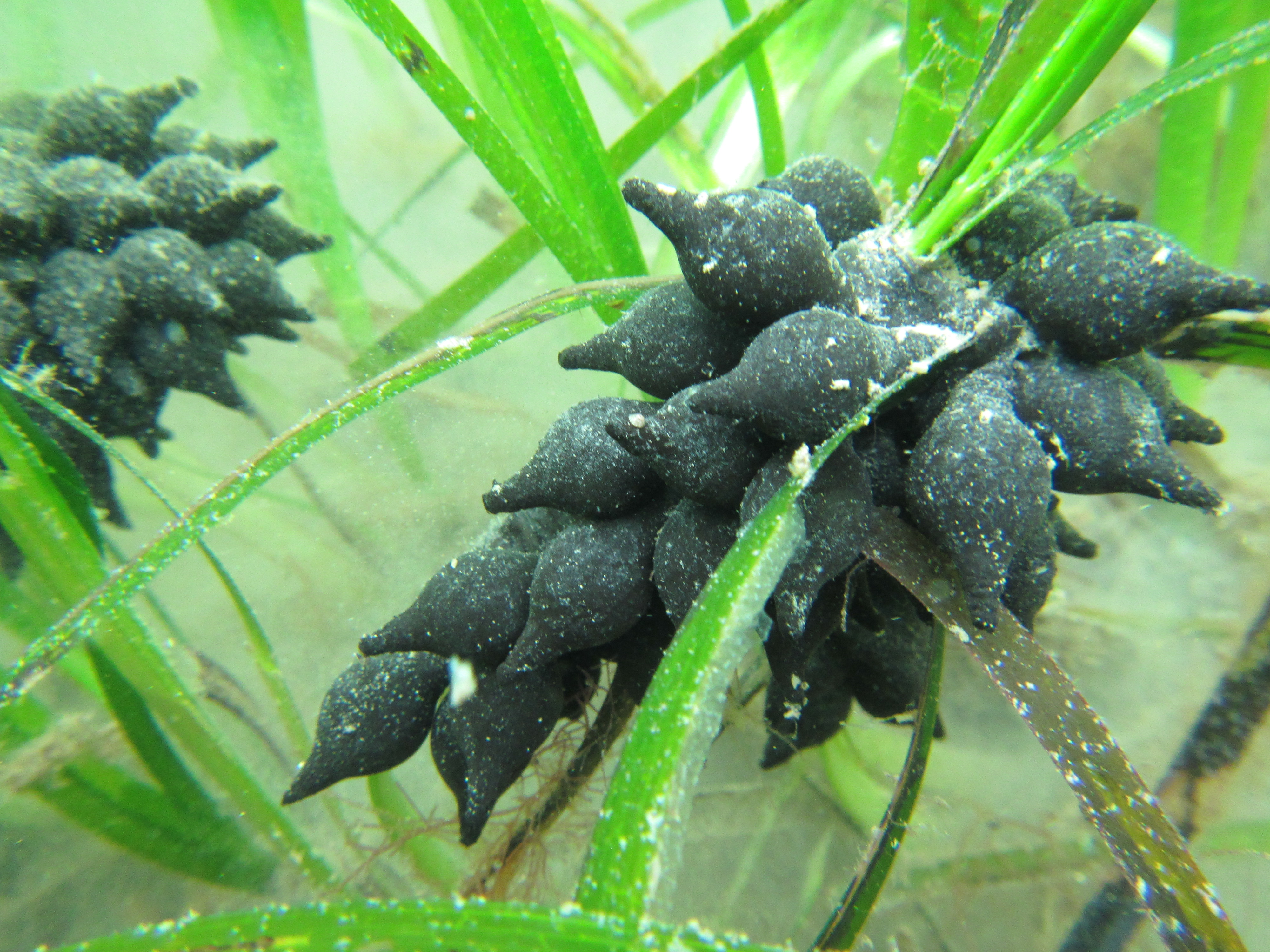 Another interesting mollusc to see was the predatory Necklace shell Euspira catena (not a very good shot, would be nice to go back diving soon so there is more time to take pictures). Other nice finds include a Mud sagartia Sagartia troglodytes anemone (I think!) and a small Sagartiogeton undatus anemone. Finally, at only 2 meters depth, we found a good-sized cuttlefish Sepia officinalis, lying still trusting its camouflage. In places, black Sepia eggs could be seen attached to the Eelgrass. Some of us also spotted a juvenile thornback ray in the shallows: