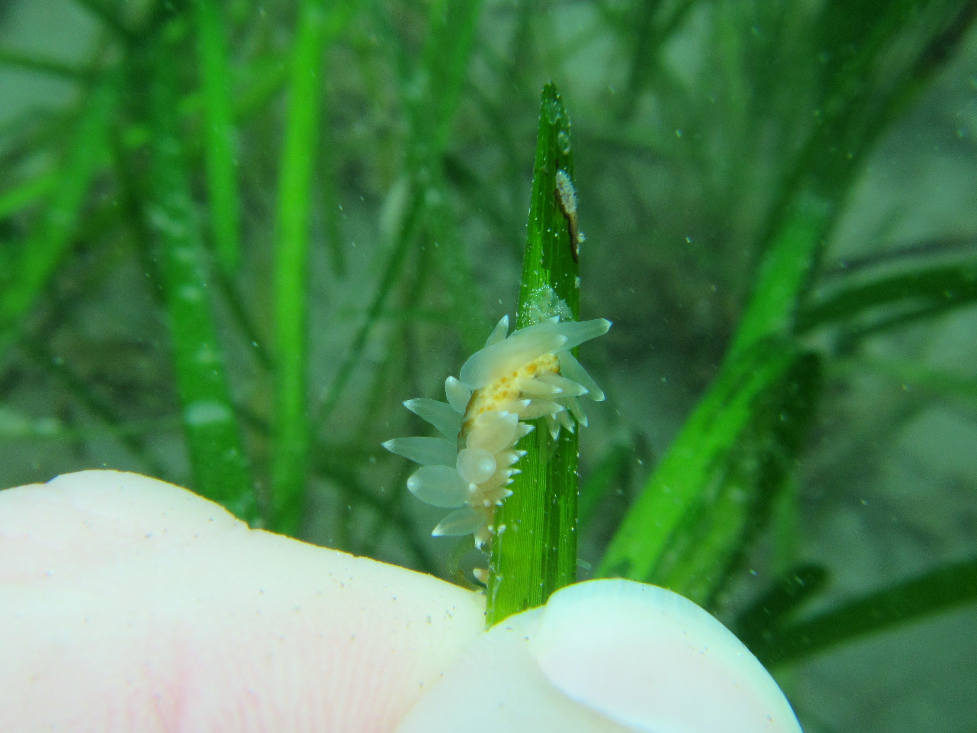 I had a couple of good snorkels at the end of summer in the seagrass beds off my local beach in Flushing. The water at the end of summer is warm enough to go without wetsuit – I just had a weightbelt to let me sink down on the sand at low tide, no fins needed. I managed to do what I normally find very difficult: spot nudibranchs! Mainly one of the more common species, Polycera quadrilineata, but that was fine by me, as they are very beautiful, especially the black colour morph pictured above. I spotted one other species, the egg-eating Favorinus branchialis (with its own eggs also visible). Not great photos, but in my defense they are very small!