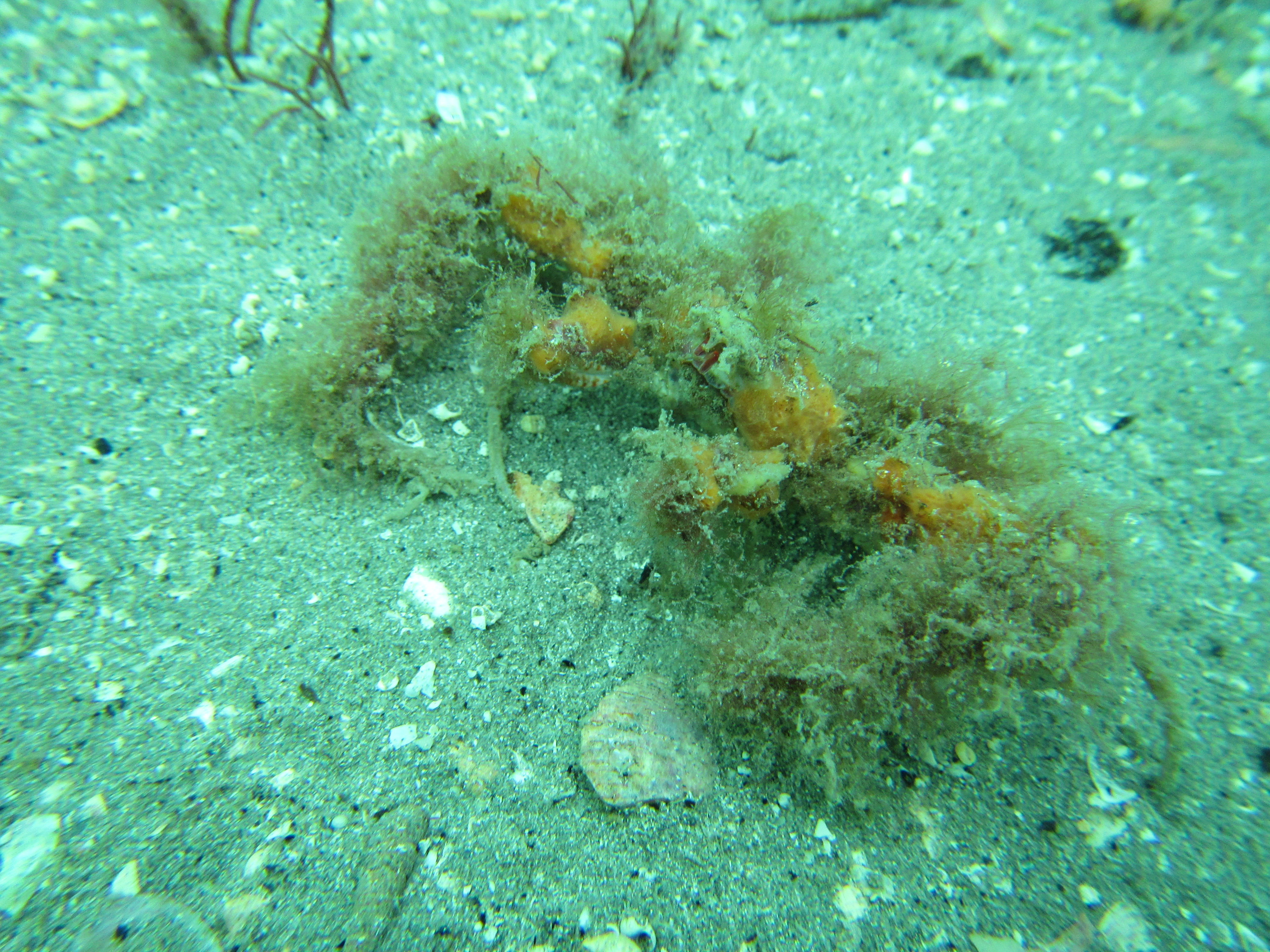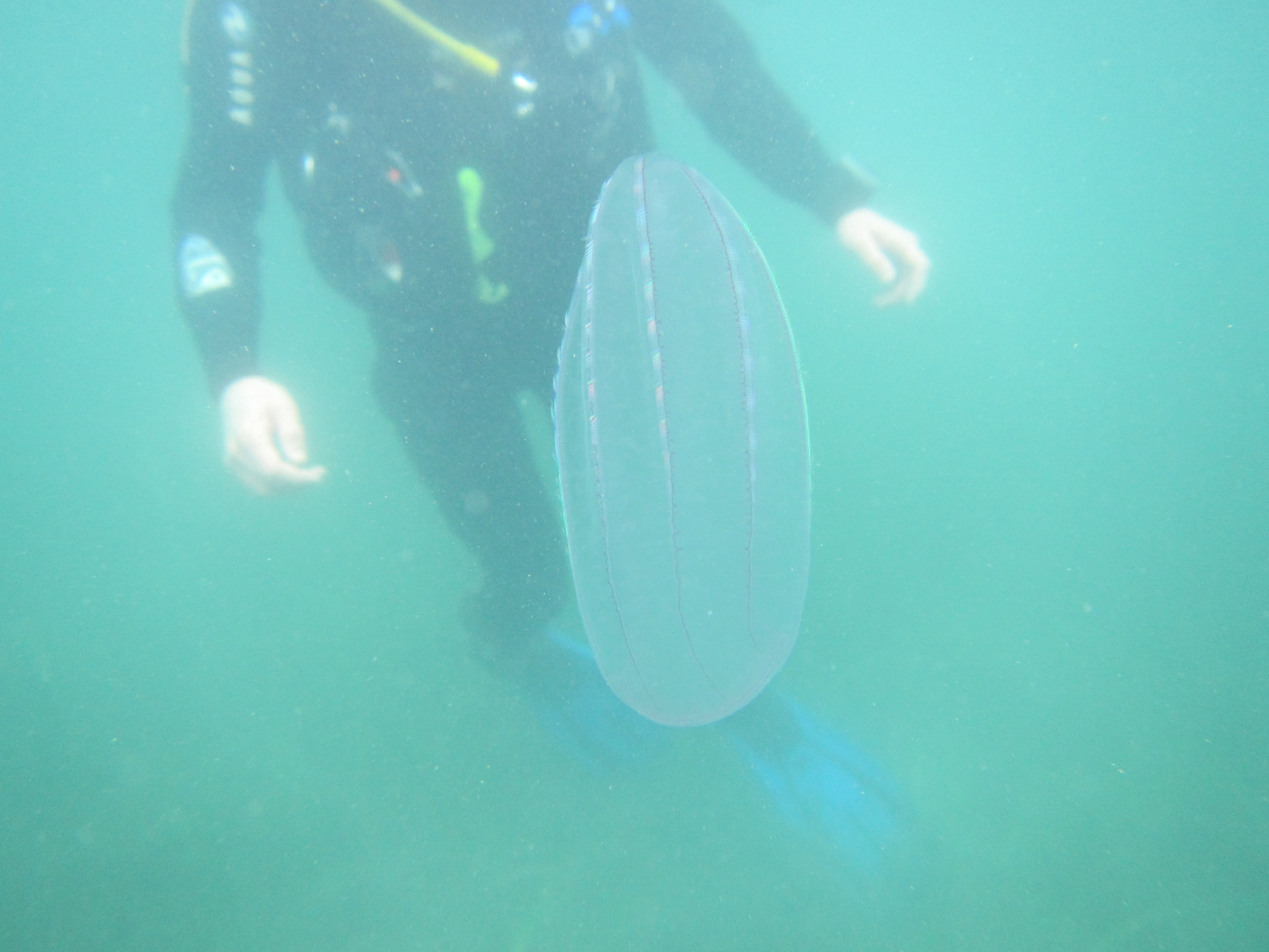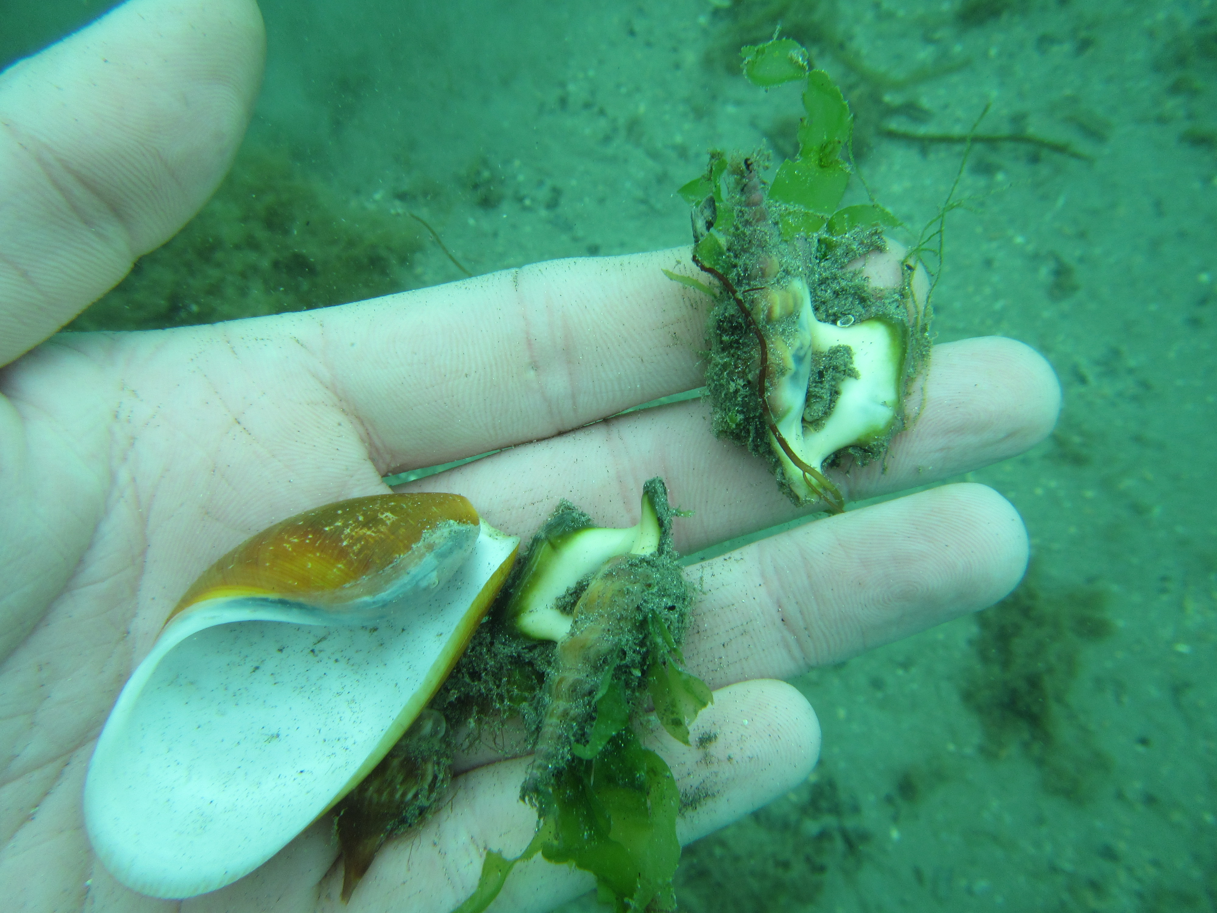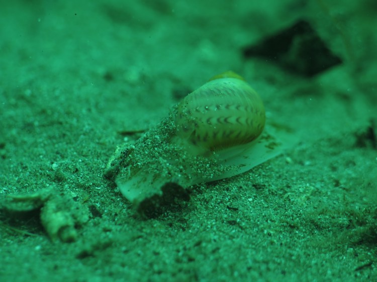 After the success of last weeks snorkelling session, it was high time for a proper dive! Again the Helford did not disappoint. In the end, my Sea hare stroking proved a bit inconclusive; also, my estimate of 30 cm long individuals might have been a slight exaggeration, 20-25 cm is more likely for the larger individuals. My guess is that it might be Aplysia punctata after all, and perhaps this is just a very good year where they reach their maximum size. (Note that three individuals can be seen in the first photo and two in the second photo.)This was not the only Ophistobranch activity going on, as I spotted a small nudibranch sitting on the eelgrass. Probably Eubranchus farrani, although it could well be something that is deserving of a new name, there is a lot of (cryptic) species discovery and taxonomic revision ongoing in nudibranch biology. I also spotted several largish egg masses on the eelgrass that are likely to be from a larger, shelled Ophistobranch; I am waiting for suggestions from various facebook groups *could be Haminoea navicula*. I found a beautiful Wooden canoe bubble shell Scaphander lignarius, these animals live buried in the sand so are not commonly spotted. Next time I’ll bring a small garden rake to see what is hidden below the sand (I am serious!), lots of echinoderms and molluscs to be sure. Pelican’s foot shellsAporrhais pespelecani live in sand, but I found some on top of the sand too, so full of muck that they were barely recognizable. I have found empty shells of this species washed up on holidays before, but it was cool to see them alive for the first time.No cuttlefish in sight this time, but loads of eggs so it is likely that this is an important breeding ground for this species. We encountered one Thornback ray Raya clavata, which, like cuttlefish, are not very shy. These species occur in very shallow waters (we probably did not dive deeper than 7 meter) and the influence of the surrounding woodland is clear, with decaying oak leaves and pine cones amidst the seaweeds and eelgrass.One very well-camouflaged species is the Scorpion spider crab Inachus dorsettensis. Medium-sized Common hermit crabs Pagurus bernhardus are common, running around in Turban top shells covered with hydroids. Although present in the last post, another pic of a Mud sagartia Sagartia troglodytes anemone Red speckled anemone Anthopleuris ballii. Filterfeeding worms are abundant too, including the beautiful Fan worm Myxicola infundibulum as well as a large tube-dwelling worm and worms in white calcareous tubes with bright red bristles that I could not identify. As we got out of the water, we saw a Comb jelly Beroe cucumis, very pretty but hard to photograph. The next dive will have to wait two weeks or so, but then I hope to finally play around with my GoPro.