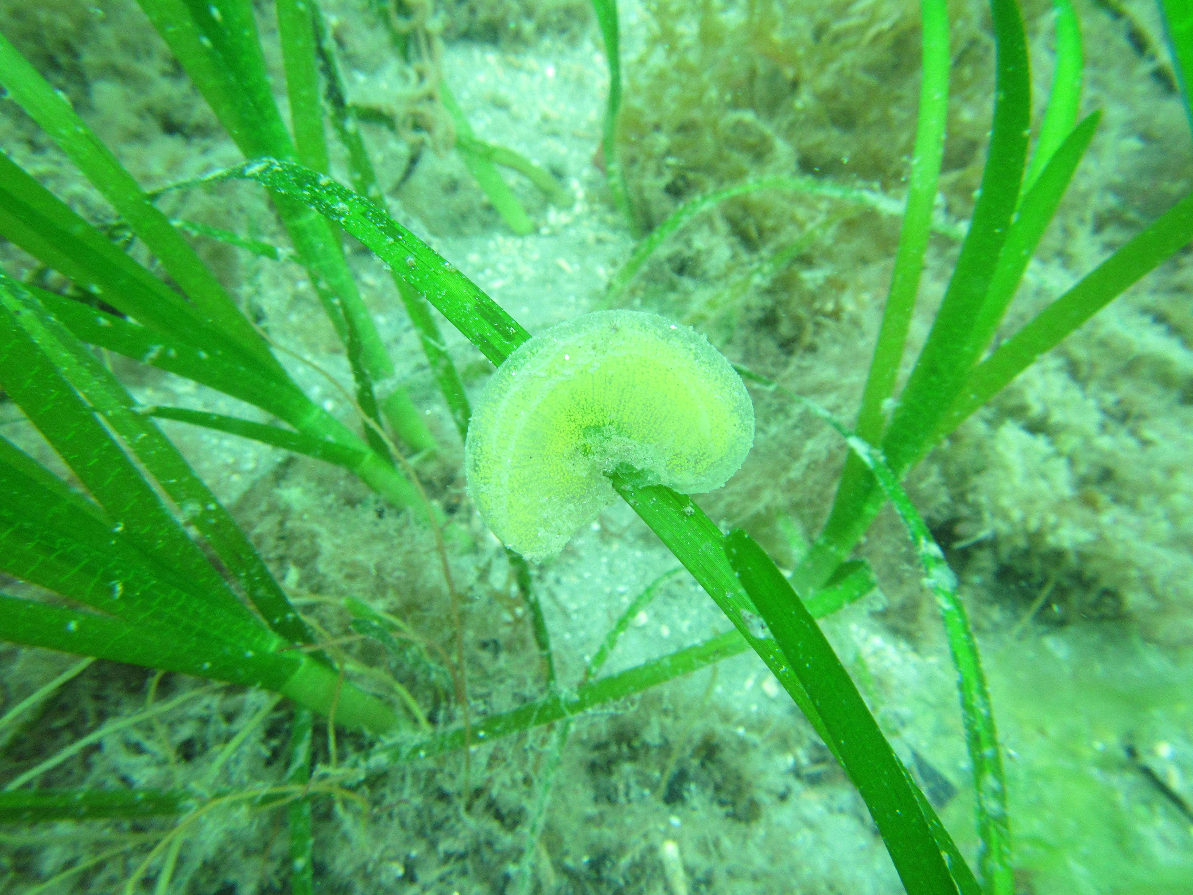 The Flushing snorkel site is very different, no (deep) rockpools, only a little bit of kelp but with a very healthy patch of seagrass. No catsharks or thornback rays when we went in, just the odd small sea bass. There are many small Snakelocks anemones on the seagrass. I used to think that it was mostly the purple form that did this but I now noticed that most were the green variety, so the morphs do not seem to differ in this respect after all. One anemone had ‘caught’ a crystal jellyfish (an Aequorea medusa). Not sure if it was in the process of being digested or just ‘stuck’.