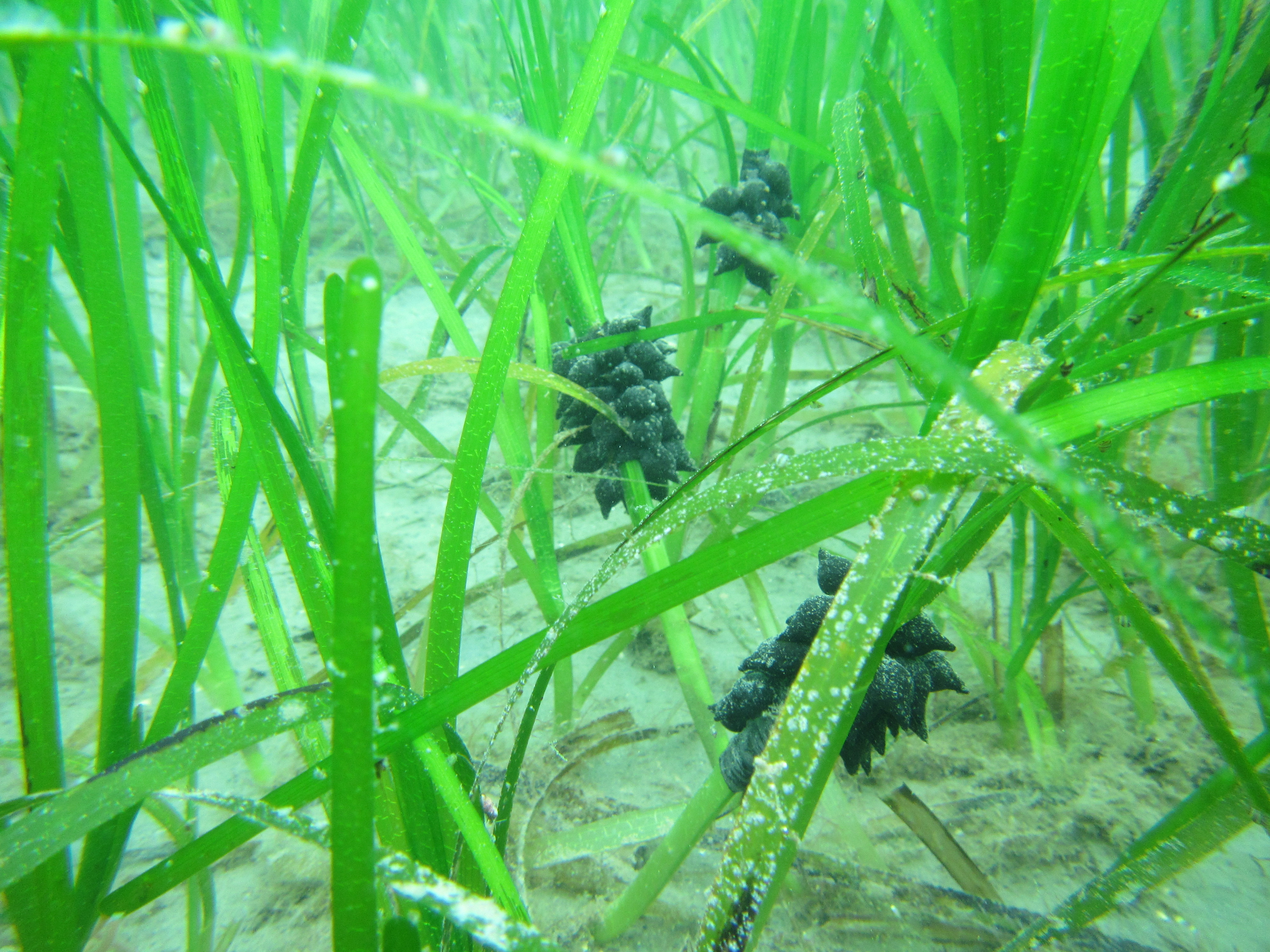 Seagrass, showing the extensive root- and rhizome systems that are so good at storing carbon (in addition, the seagrass beds store carbon by trapping floating particles).