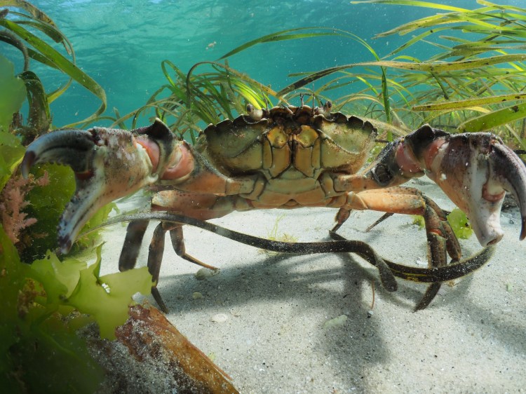 Two weeks ago we werelucky to spend a mid-week on St. Martins, one of the Scilly Islands. The Scillies are a group of tiny inhabited and uninhabited islands 28 miles off Lands’ End (before I moved to Cornwall eight years ago, I had never even heard of them…). The water over there is bluer, the sand is whiter and the viz much (much) better than in ‘mainland’ Cornwall, so a true paradise for snorkelling. I tried to get underwater as much as I could, in-between exploring the island (and going to the one pub). As we did not have much time, I mainly snorkelled in the seagrass just off Par Beach. It does not really look like England does it!? The seagrass was teeming with stalked jellyfish. However, because of the great viz I stuck with my fisheye lens, which meant it was tricky to photograph them. This species is Calvadosia campanulata, a protected and generally uncommon species, so worth recording (which I will get on when work is quieter and the weather is crappier). The ID was confirmed by expert David Fenwick, have a look at his excellent site on stalker jellies stauromedusae.co.uk (and his general site for marine species in the SW of the UK aphotomarine.com). Dave also pointed out some other organisms growing on the seagrass seen on these pics: the small red algae Rhodophysema georgei and the slime mold Labyrinthula zosterae (the black bits). As always, I learned something new talking to Dave. Snakelocks anemones were abundant on the seagrass, and the sand inbetween was full of Daisy anemones and Red-Speckled anemones Anthopleura balli (one of my favourites, they do well in my aquarium). As always, I bother crabs by sticking a lens in their face. Bigger Green Shore Crabs Carcinus maenas can get a bit feisty and attack the dome port (maybe because they see their own reflection). Finally a juvenile Straight-nosed Pipefish Nerophis ophidion (about 3 inches), a new one for me. I am always facinated by piepfish (and hope to one day see a seahorse). Unfortunately the shot is not in focus, I really needed a macrolens for this one. Still, you can marvel at the white sand and blue water! Some photos are allright, but I could do a lot better with a bit more time. Luckily we rebooked for a stay in spring already!