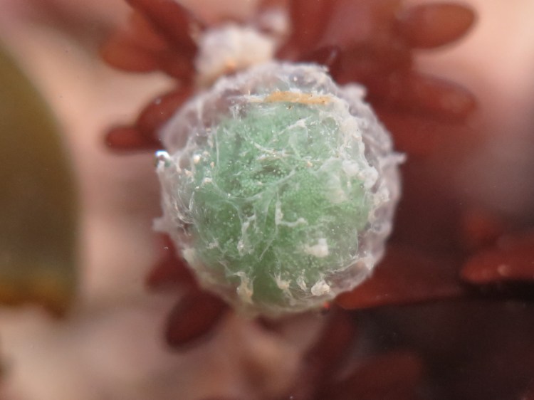 The wind has picked up and will ruin any chances of getting good seaweed shots this week. Too bad, but what can you do? A bit of rockpooling I guess. I took my son out to our local beach in Flushing where the rocks gently slope into Penryn River. Although there are no ‘proper’ rockpools, low tide gives access to a mixture of maerl sand and rocks that can be turned over. It is silty and definitely not very pretty, but there is always something to find. It was an especially good weekend for finding fish, seeing Shannies, Tompot blennies, Rock gobies, Gunnels, Worm Pipefish, Shore Rocklings and a tiny Eel, as well as Sea Scorpion eggs. (One Shanny was quite big and proceeded to bite my son’s hand; he was very brave and we slowly put it back.)