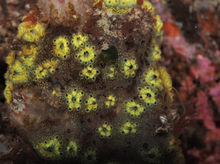 Yet another solo dive (I know, I know, not ideal) this Thursday morning before the easterlies are kicking in. Actually, the water was already choppier than I expected, but for macro photography the viz is not as important. I did not get ‘the’ shot but it was a nice dive all around. I discovered a little swim-under and saw lobster, rock lobster (craw fish) and a huuuuge conger eel. I was focusing on a little tunicate when I looked up and saw it looking back at me from not very far away at all. Its head was as big as mine. I slowly swam backwards, thinking of this encounter…..overall they do seem to be aggressive towards people though, and with my fisheye lens this could have been a really good shot. This later happened again, this time a smaller individual but still sizable. I did not stick my macro lens up its nose but grabbed a halfhearted shot with a passing by Twospot goby almost in focus to give an idea:
