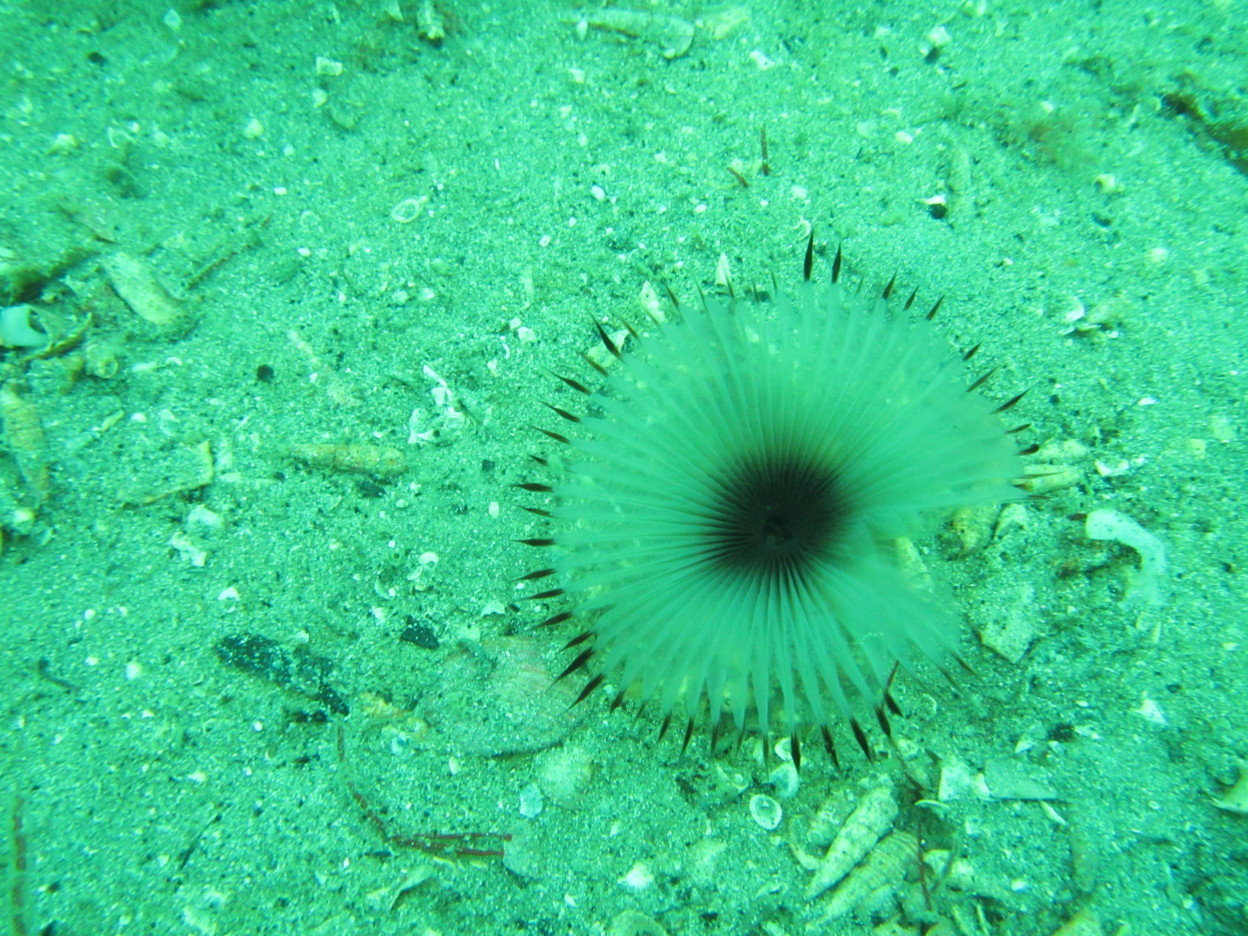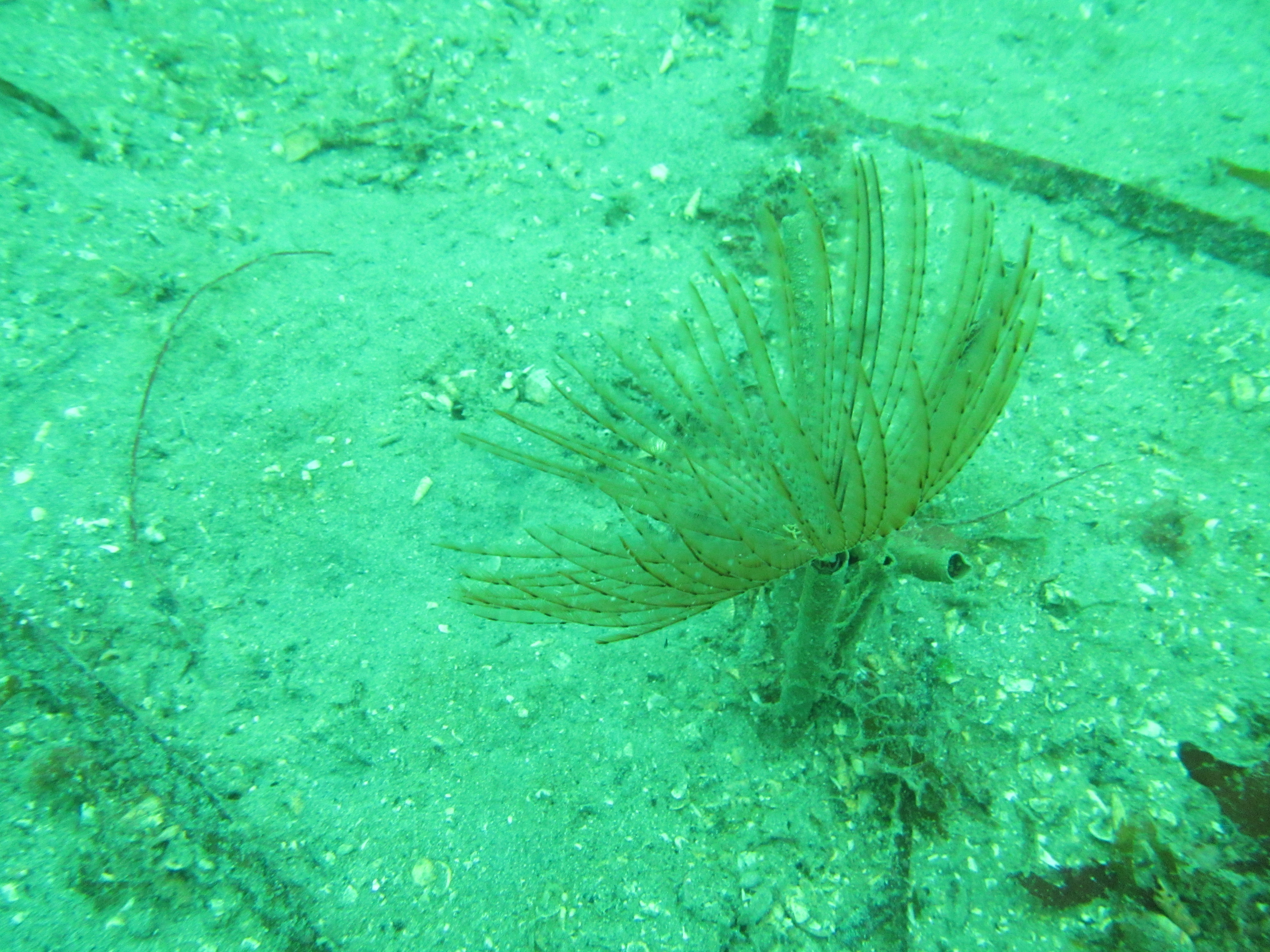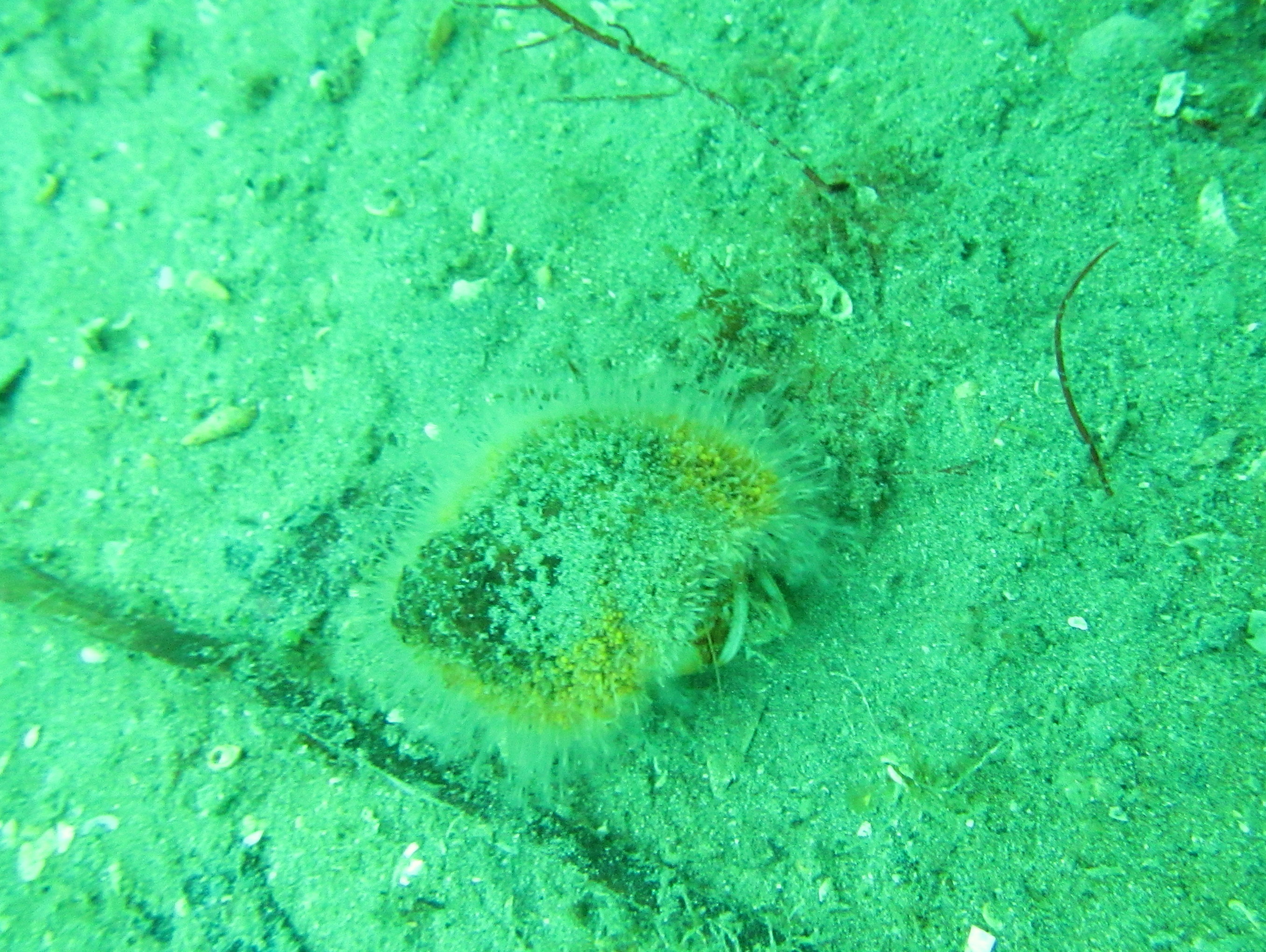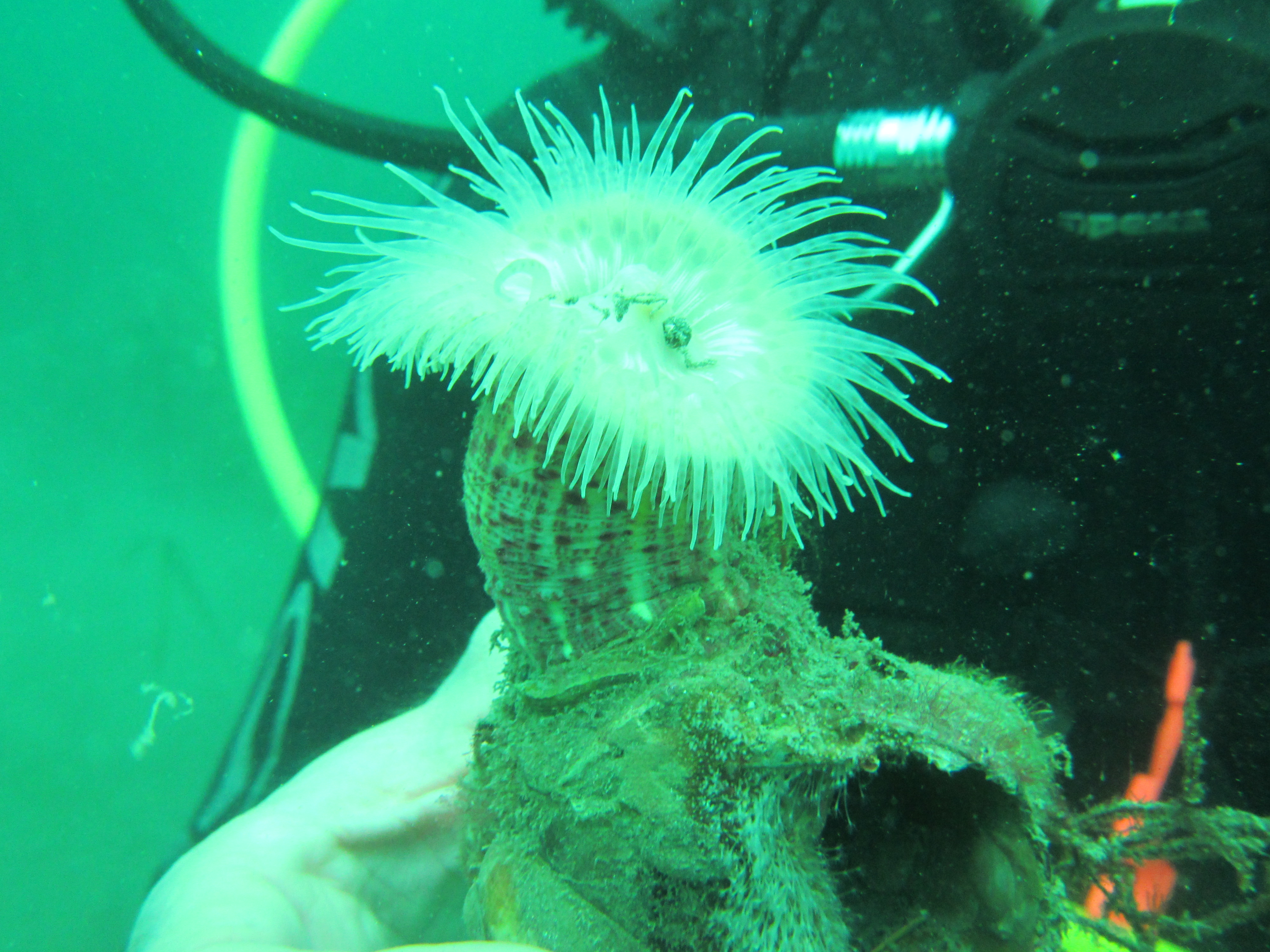 One very well-camouflaged species is the Scorpion spider crab Inachus dorsettensis. Medium-sized Common hermit crabs Pagurus bernhardus are common, running around in Turban top shells covered with hydroids. Although present in the last post, another pic of a Mud sagartia Sagartia troglodytes anemone Red speckled anemone Anthopleuris ballii. Filterfeeding worms are abundant too, including the beautiful Fan worm Myxicola infundibulum as well as a large tube-dwelling worm and worms in white calcareous tubes with bright red bristles that I could not identify. As we got out of the water, we saw a Comb jelly Beroe cucumis, very pretty but hard to photograph. The next dive will have to wait two weeks or so, but then I hope to finally play around with my GoPro.